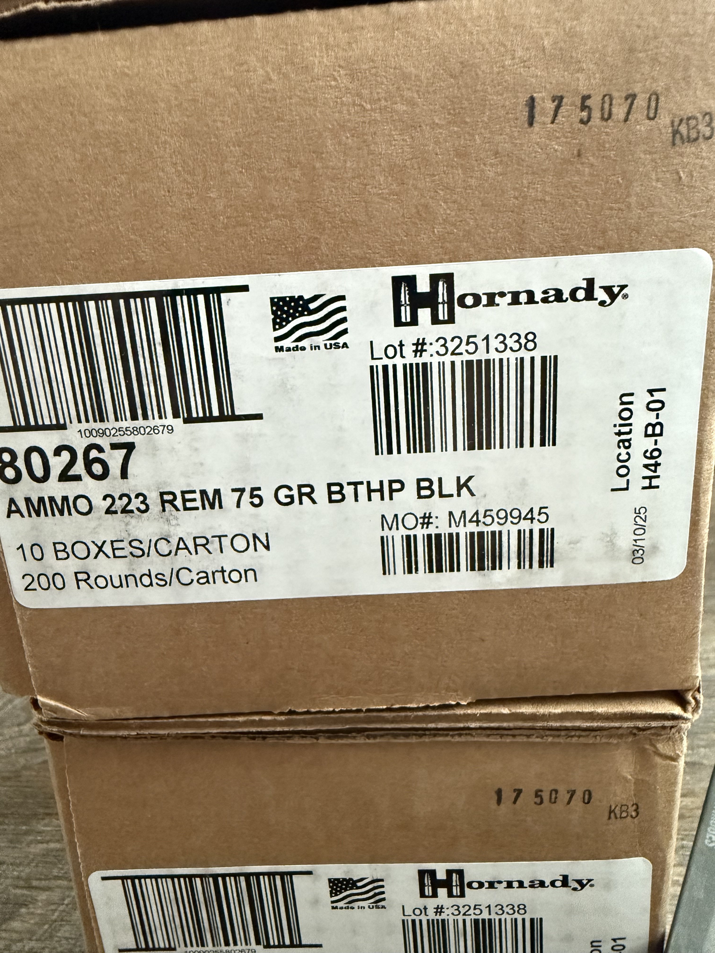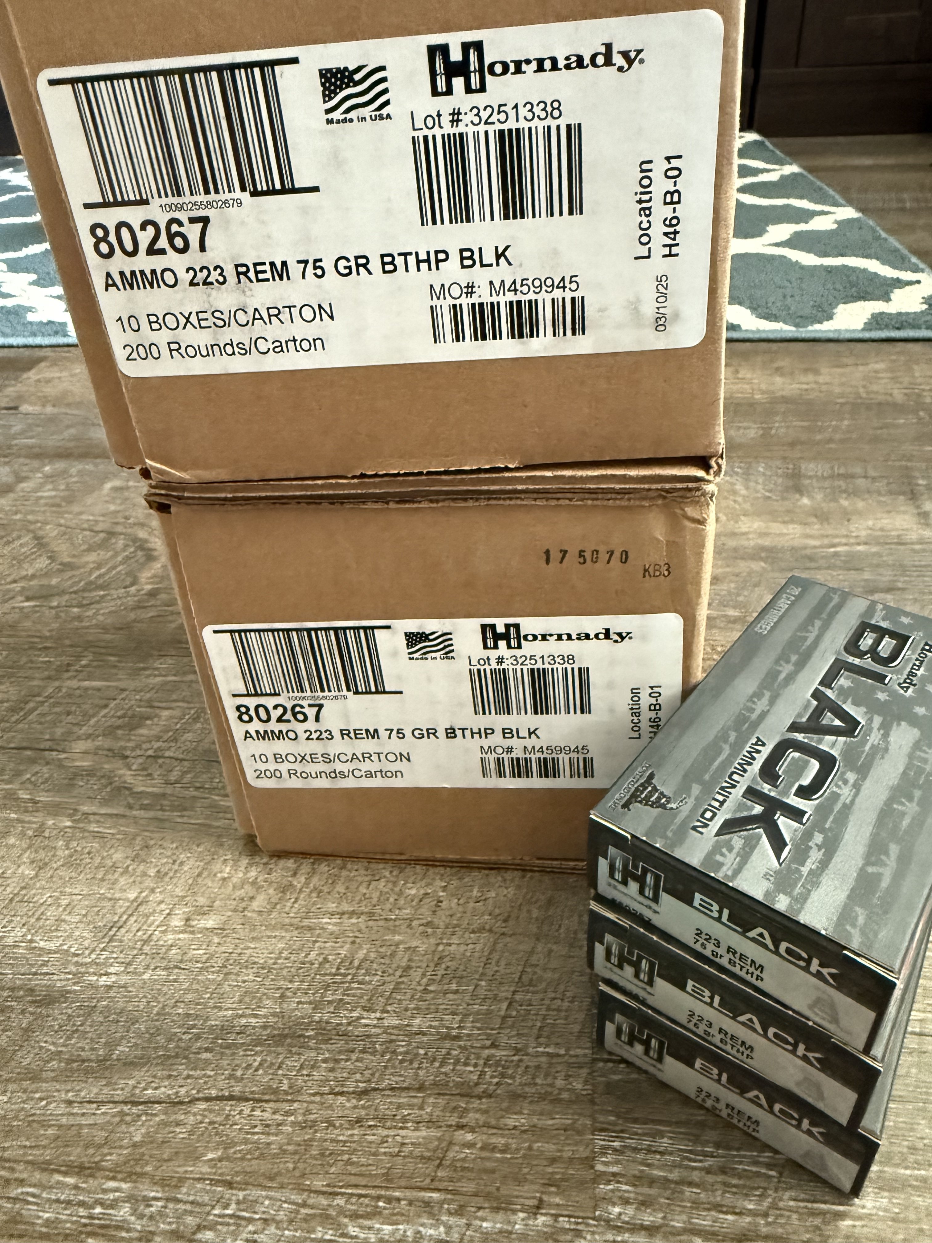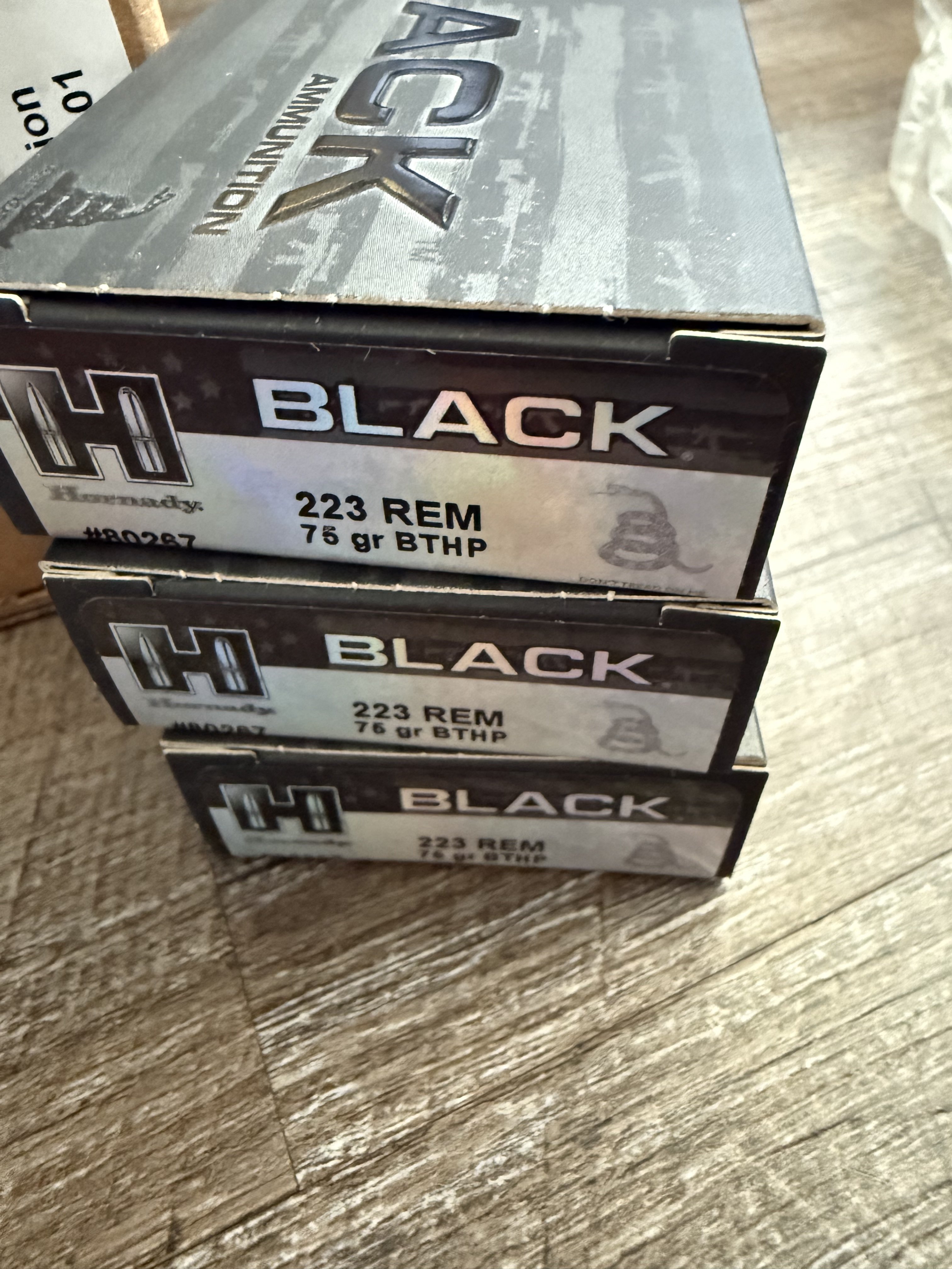 23 boxes of Hornady Black 223 75gr Bthp. 2 boxes are sealed 200rd cases and 3 boxes are out of the case but all 23 boxes are same lot number.
