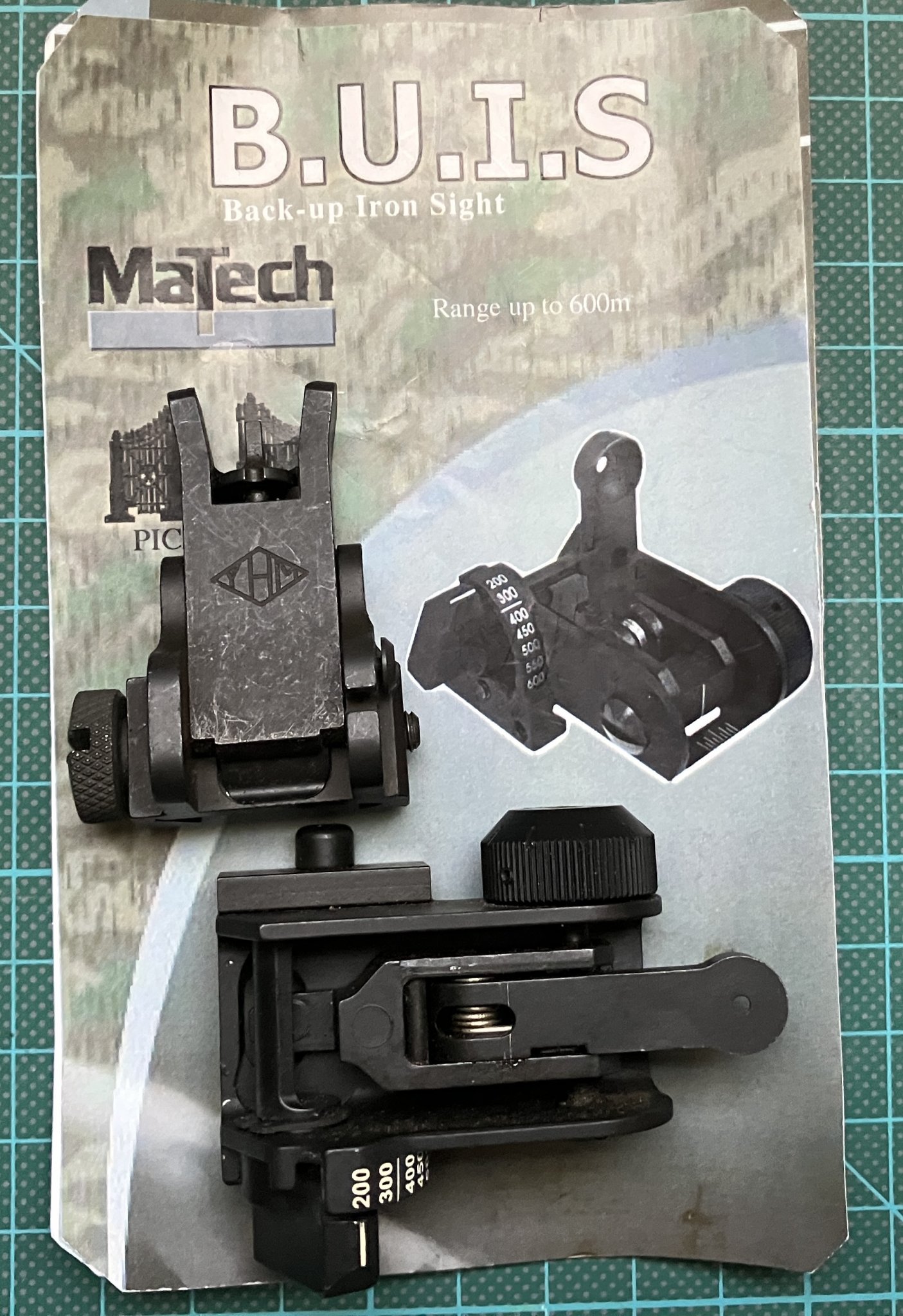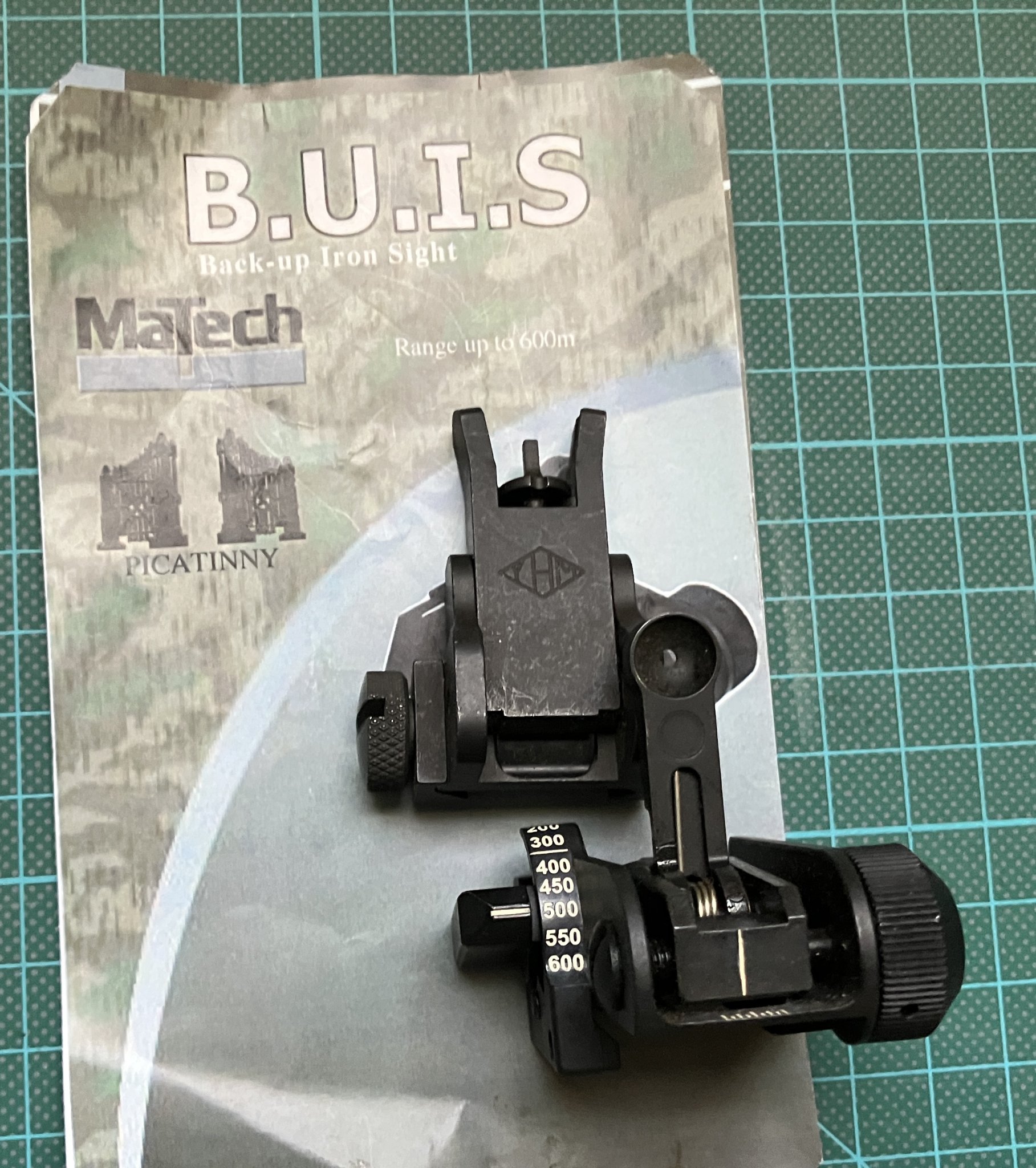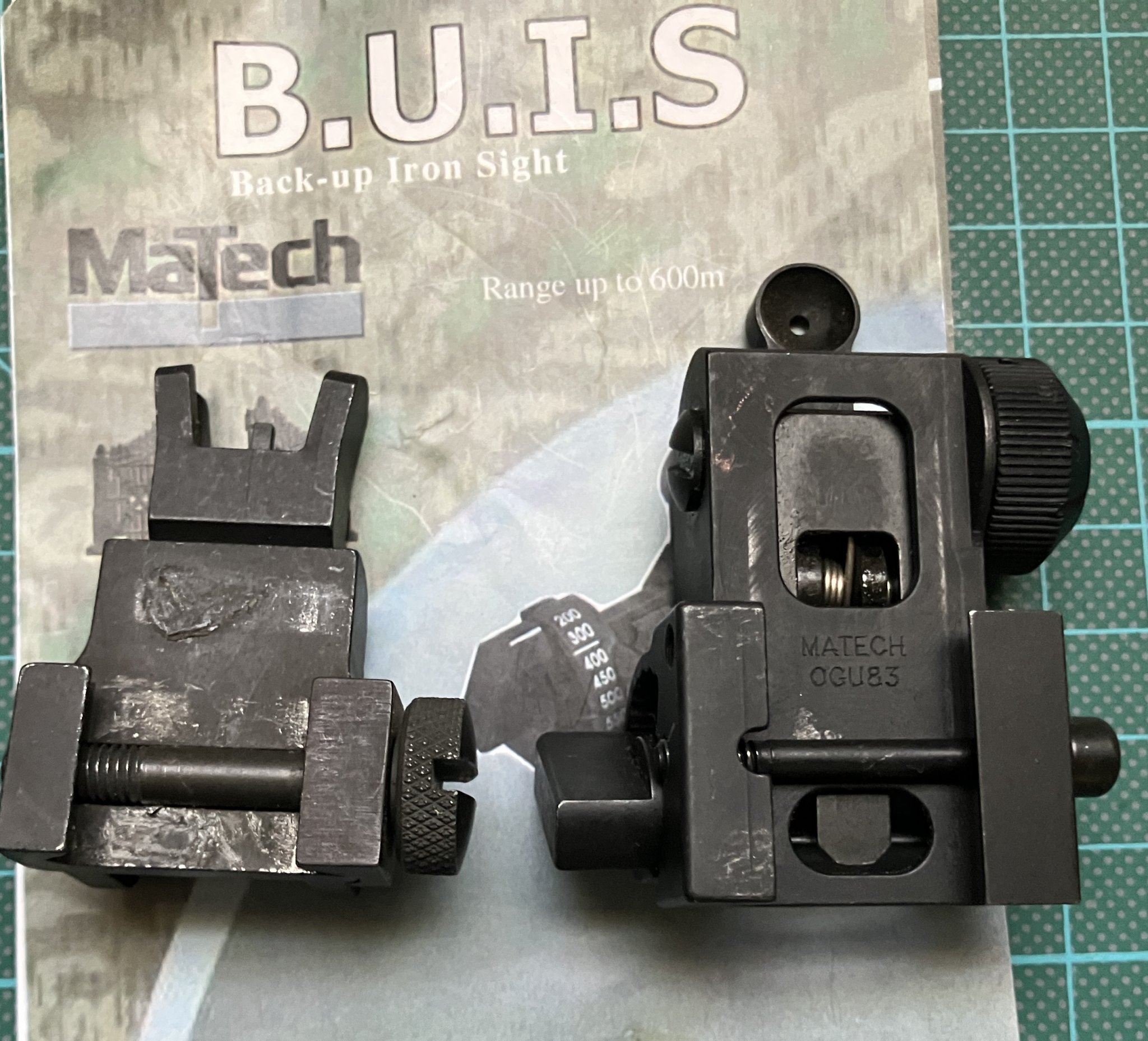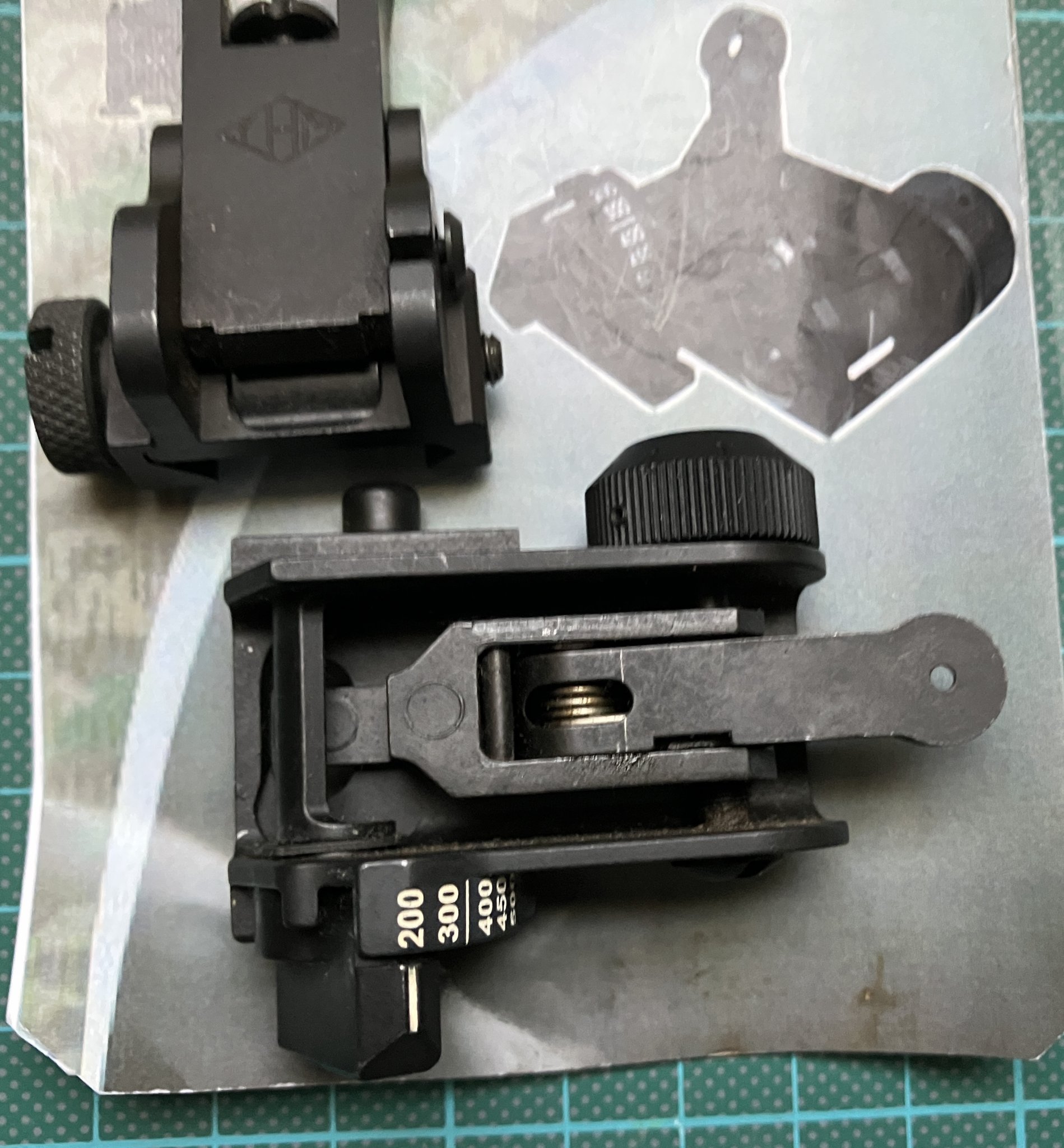 Used rear MaTech USGI Mil-Spec Backup Iron Sight and front Yankee Hill Machine sight. The front sight is to be mounted on the gas block, and would be too tall if mounted on the handguard.