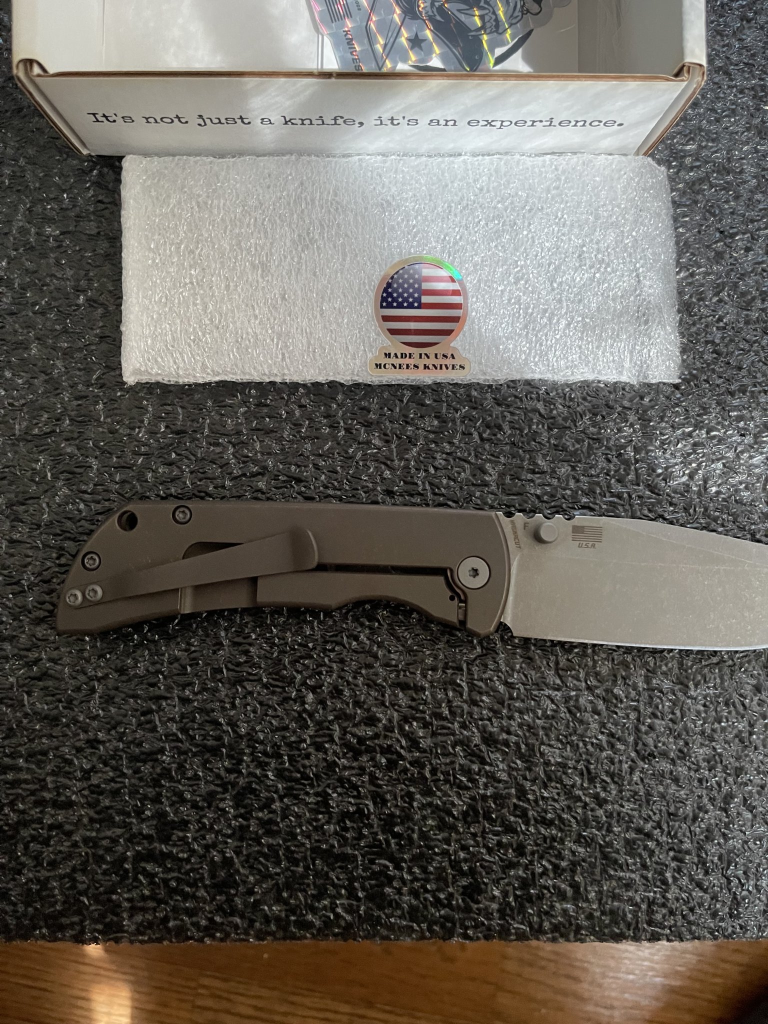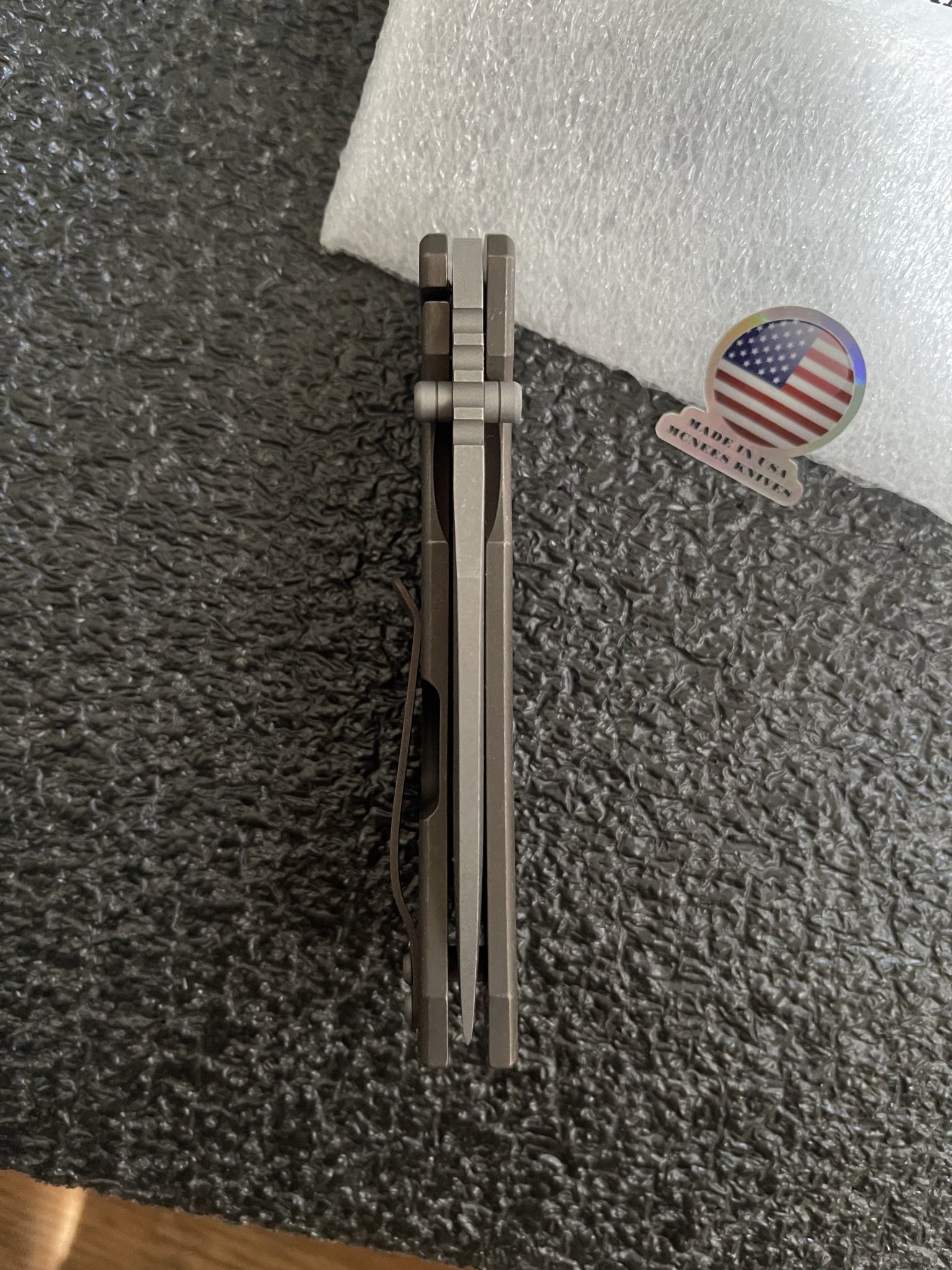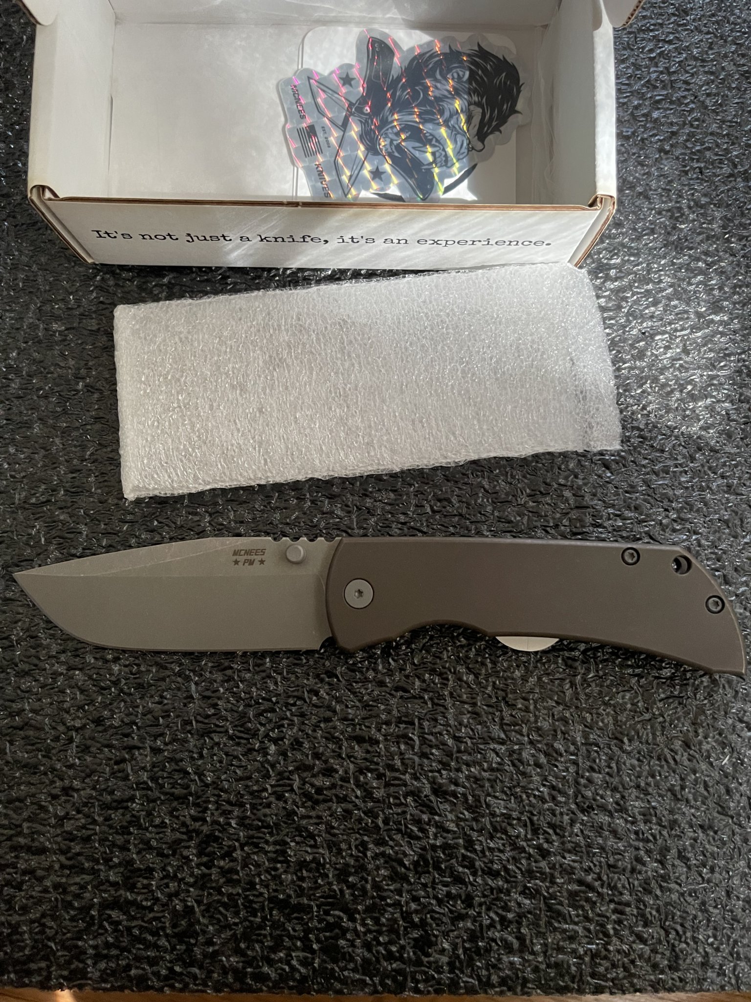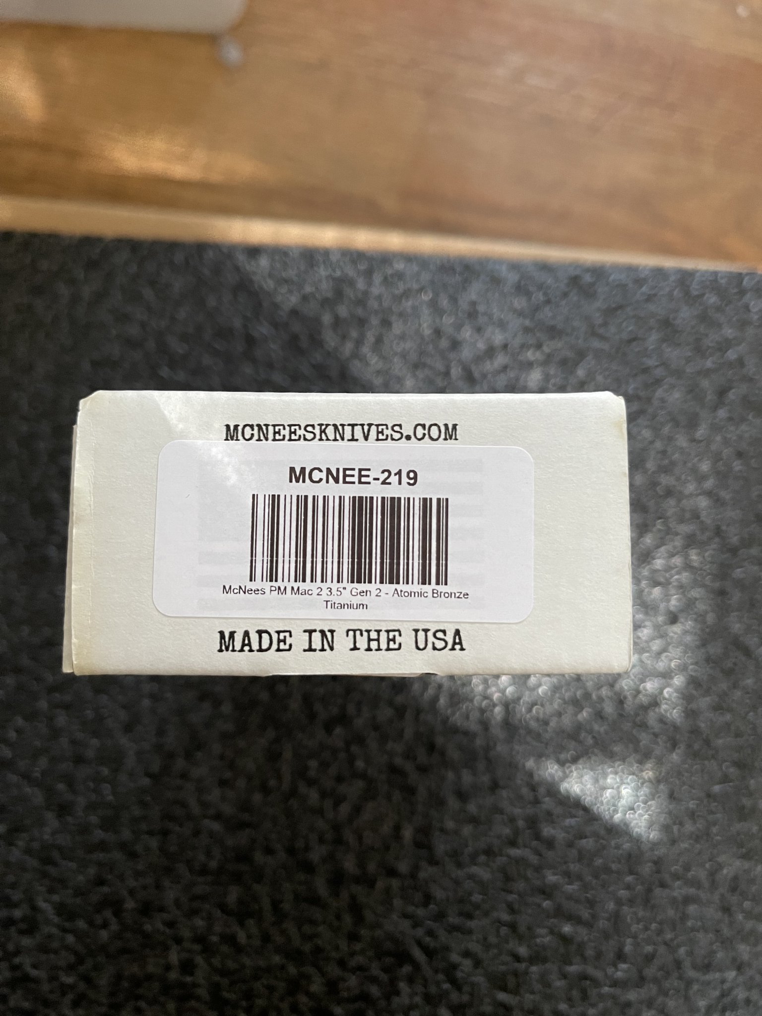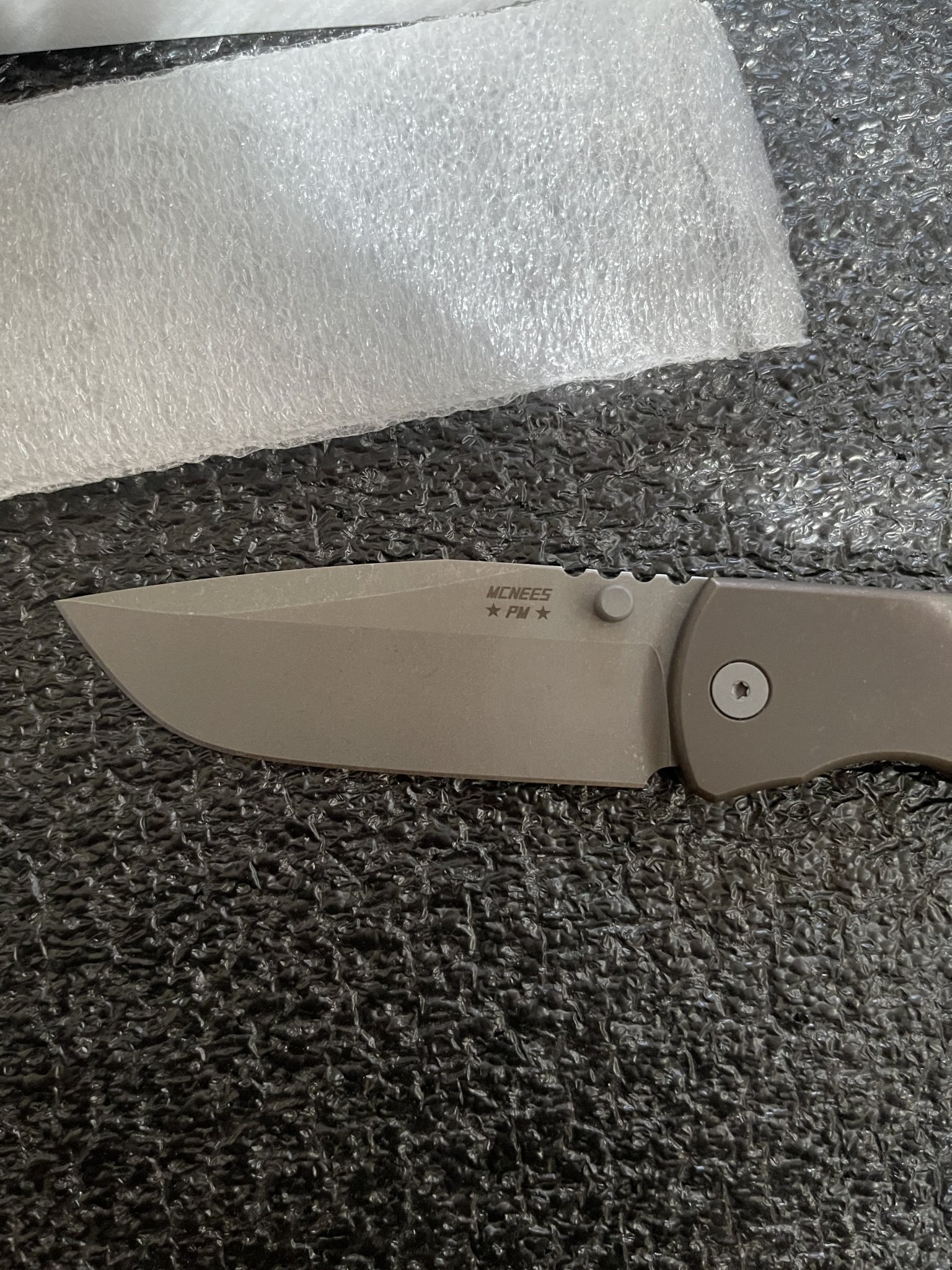 Mcnees pm2. MagnaCut 3.5” blade. The finish on the blade looks like a working finish I’ve seen on hinderer blades dark grey. The handle is titanium in atomic bronze. Never carried or cut. Comes with everything from the factory.