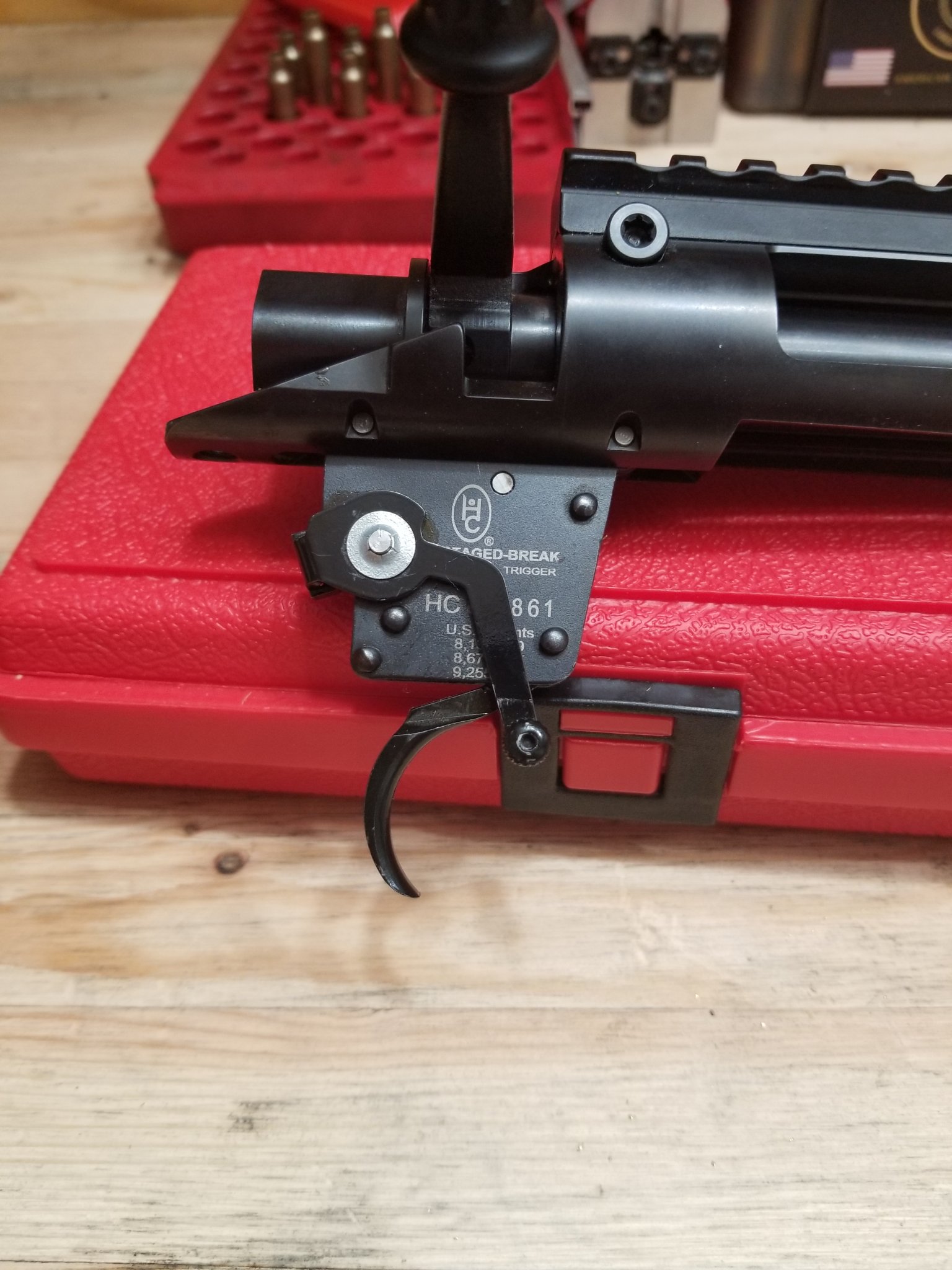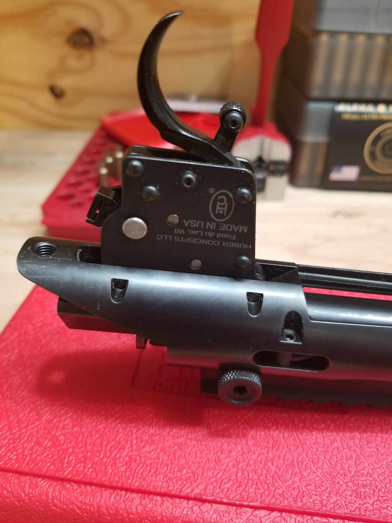 Have a gently used Huber trigger. Has the trigger guard safety and is set to 1 lb each stage. I am switching this trigger to a single stage. Fantastic trigger though. No bolt release. Right handed.