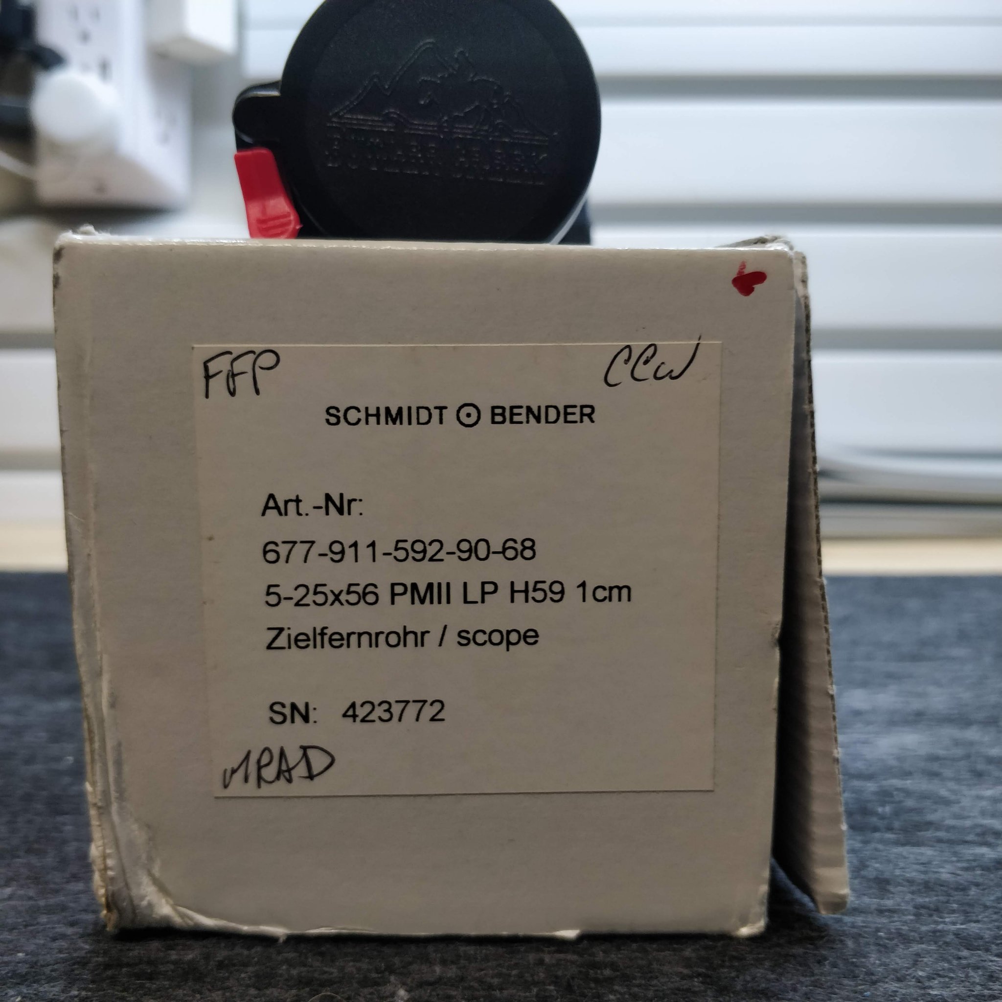 Up for sale is a lightly used Schmidt Bender 5-25x56 PM II LP H59 1cm ccw DT / ST Black Riflescope 677-911-592-90-68