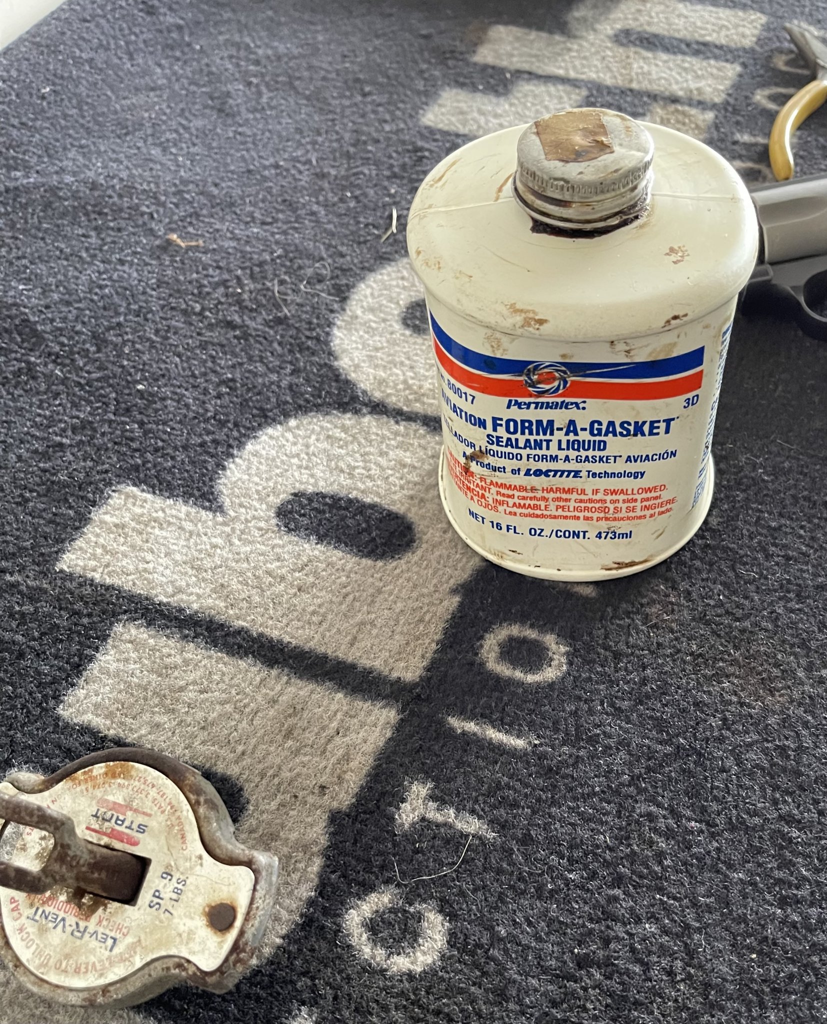 Needle nose pliers, sealant, radiator cap, and revolver, on a carpet. WTF is going on here? Or do we even want to know?