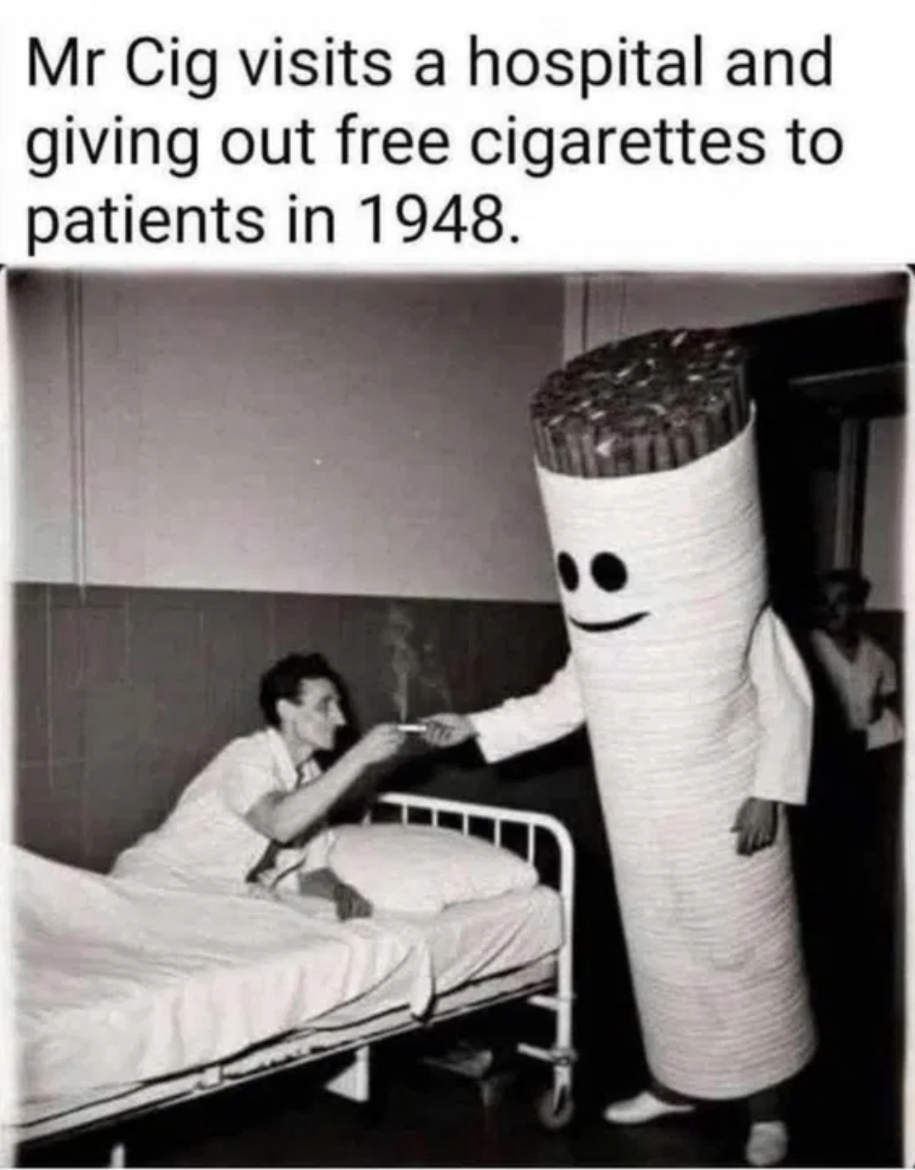 True story: I spent 5 days in a military hospital back in the 70s. We were allowed to smoke in bed till lights out at 2100. The doctors and nurses were also allowed to smoke but they weren't allowed in the bed with us.