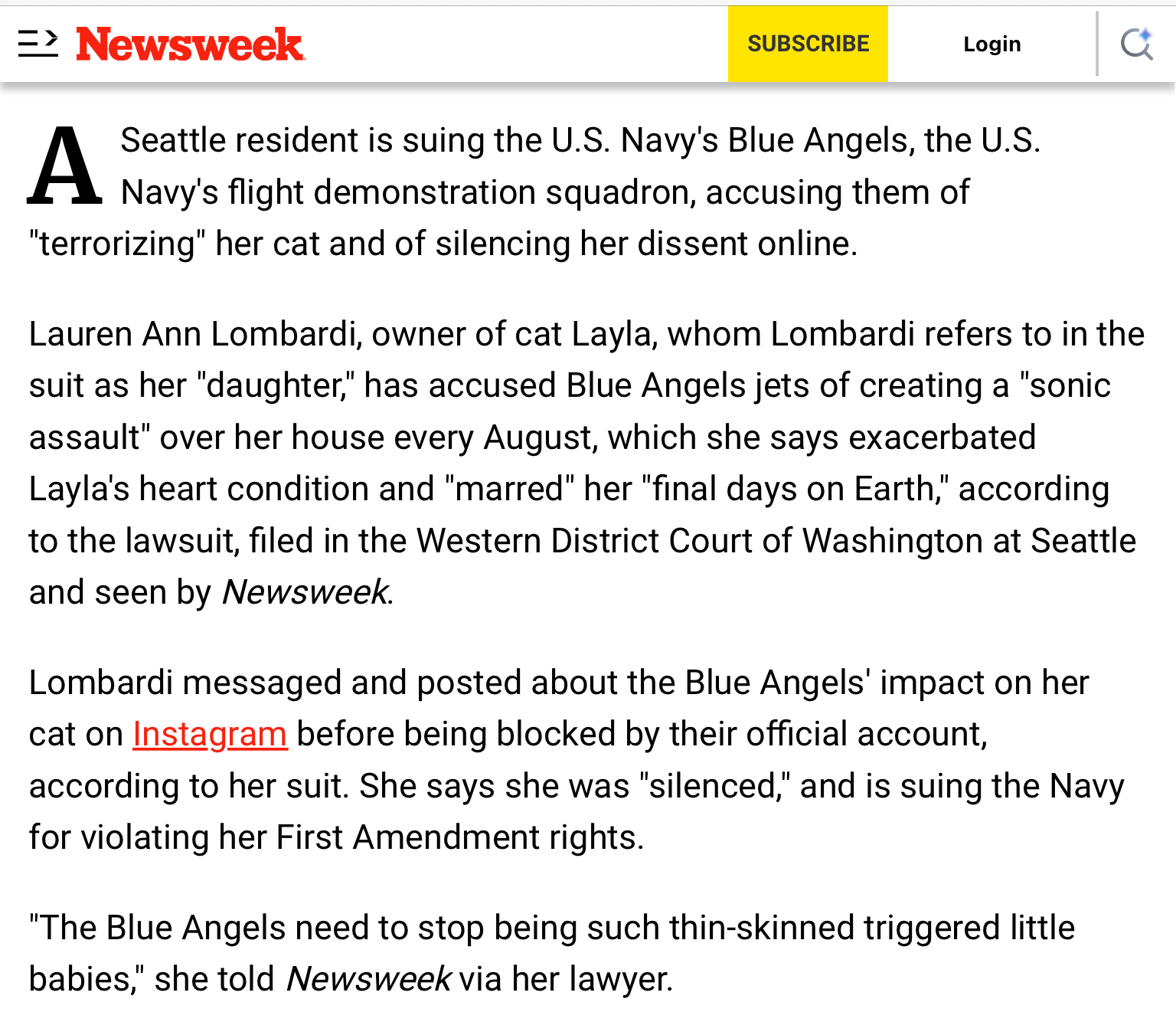 Lauren Ann Lombardi says the Navy flight squadron's "sonic assault" over her house "marred" her cat's "final days on Earth."www.newsweek.com
