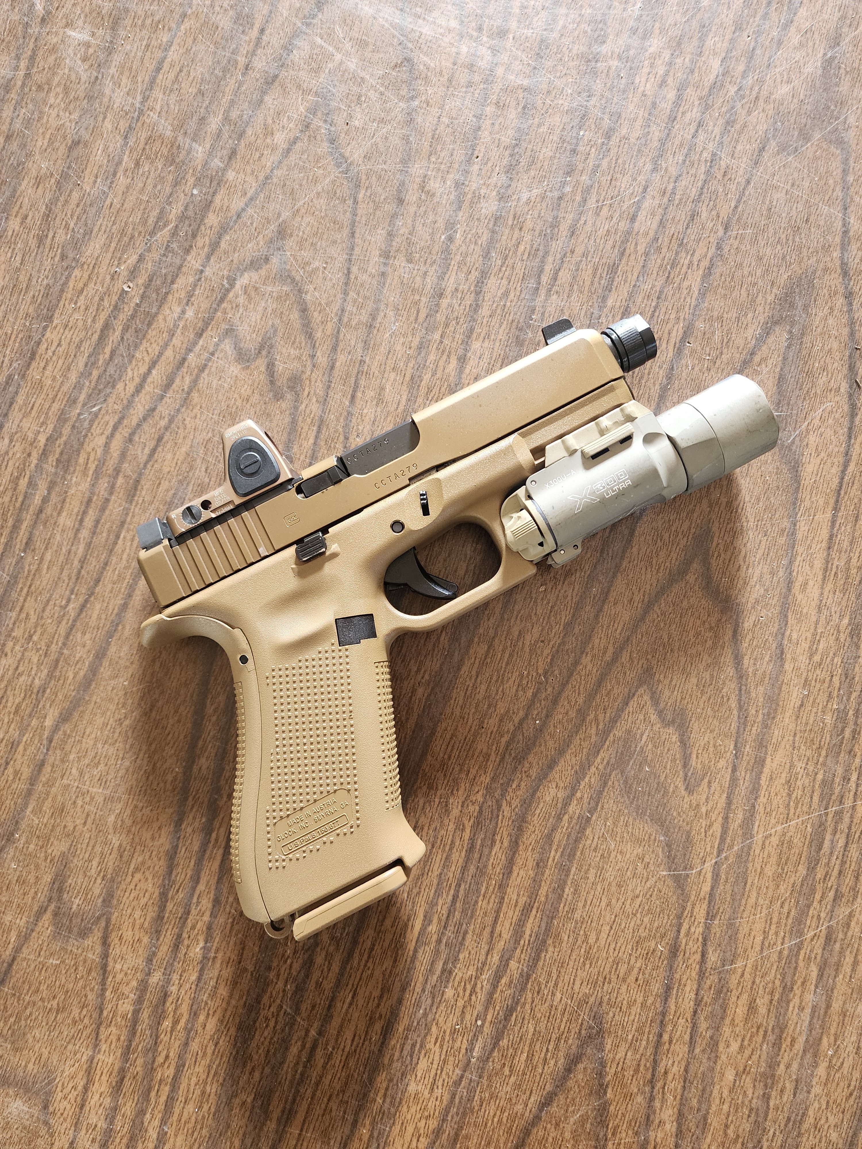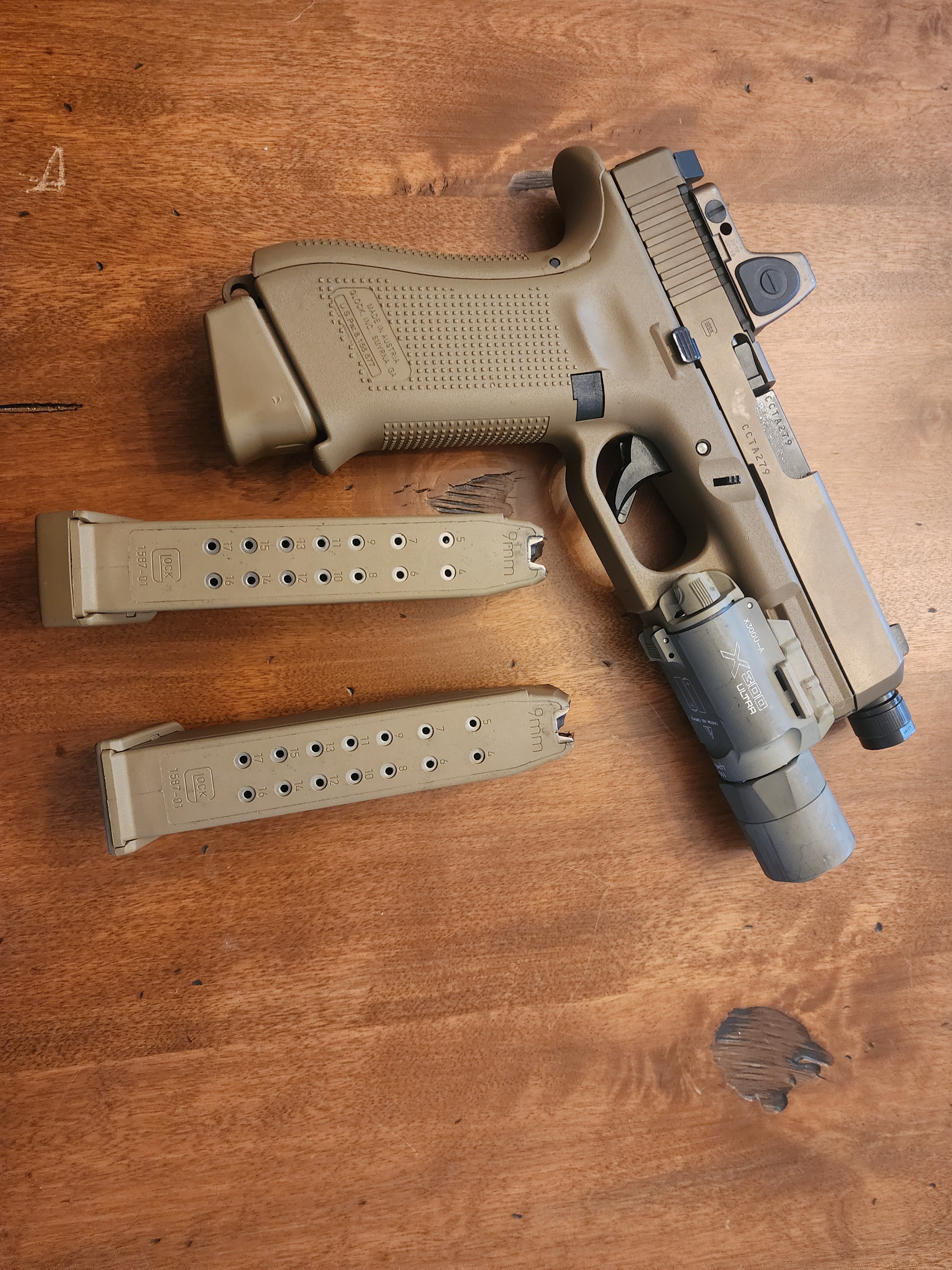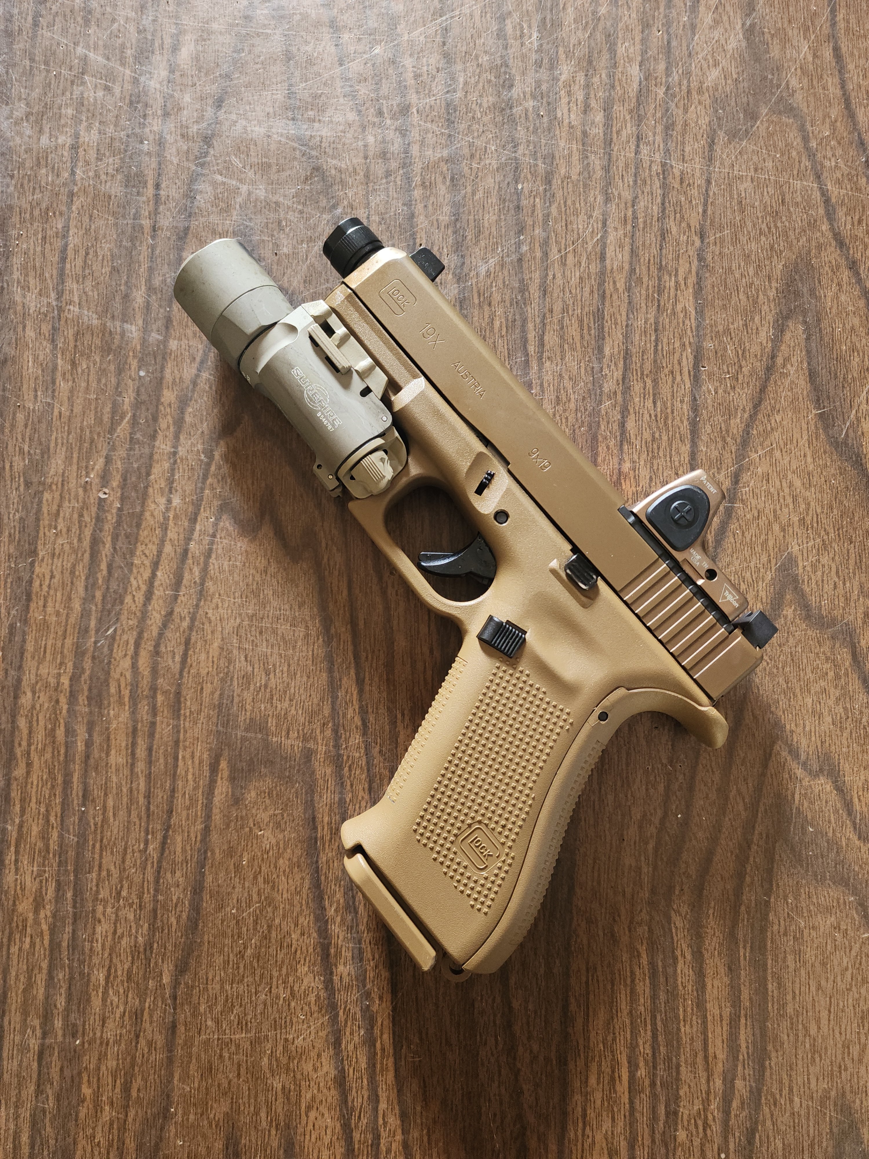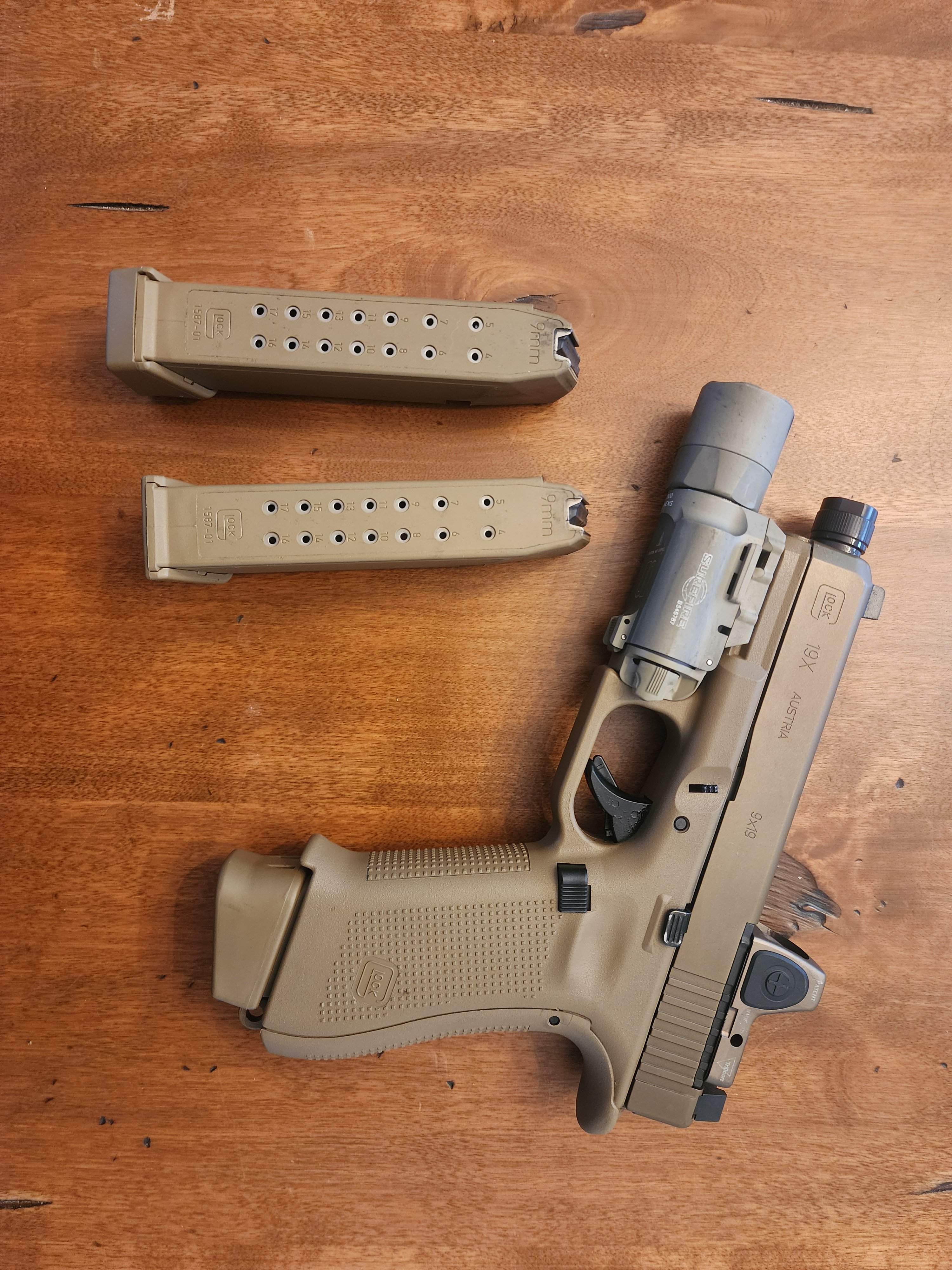 G19X MOS with coyote RMR and tan surefire turbo includes 3 magazines and safariland holster. The gun has around 300 to 400 rounds on it. Comes with original box.