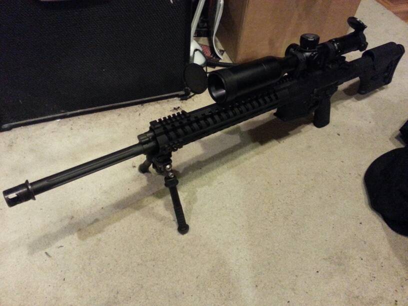 Here she is. Her name is Selene. She has a ThunderBeast Brake, Noveske switch block, 22" fluted barrel, Bushnell HDMR, Magpul PRS, Battle Arms 45 degree safety, Umbrella Corporation grip, and a Geissele trigger.