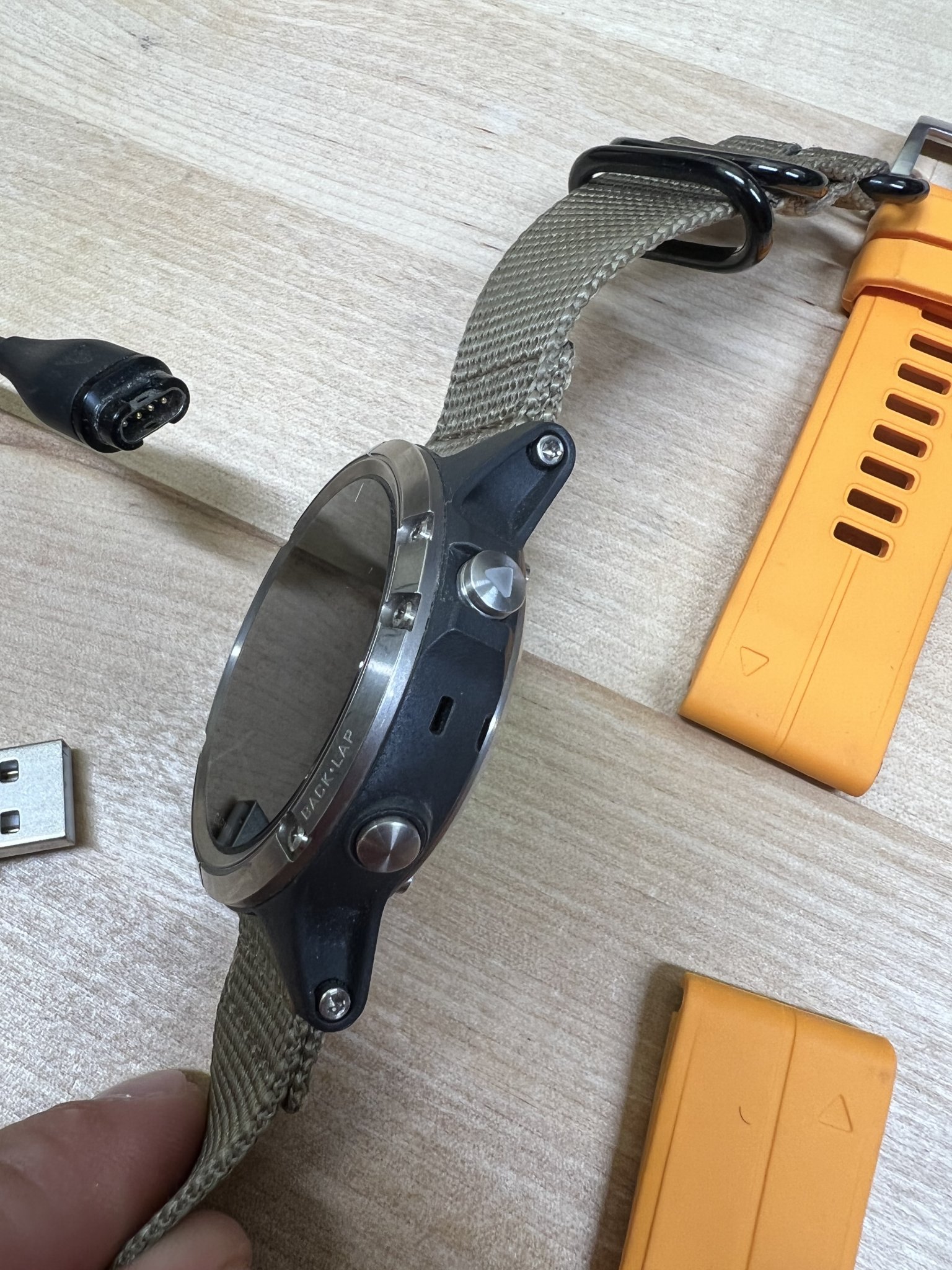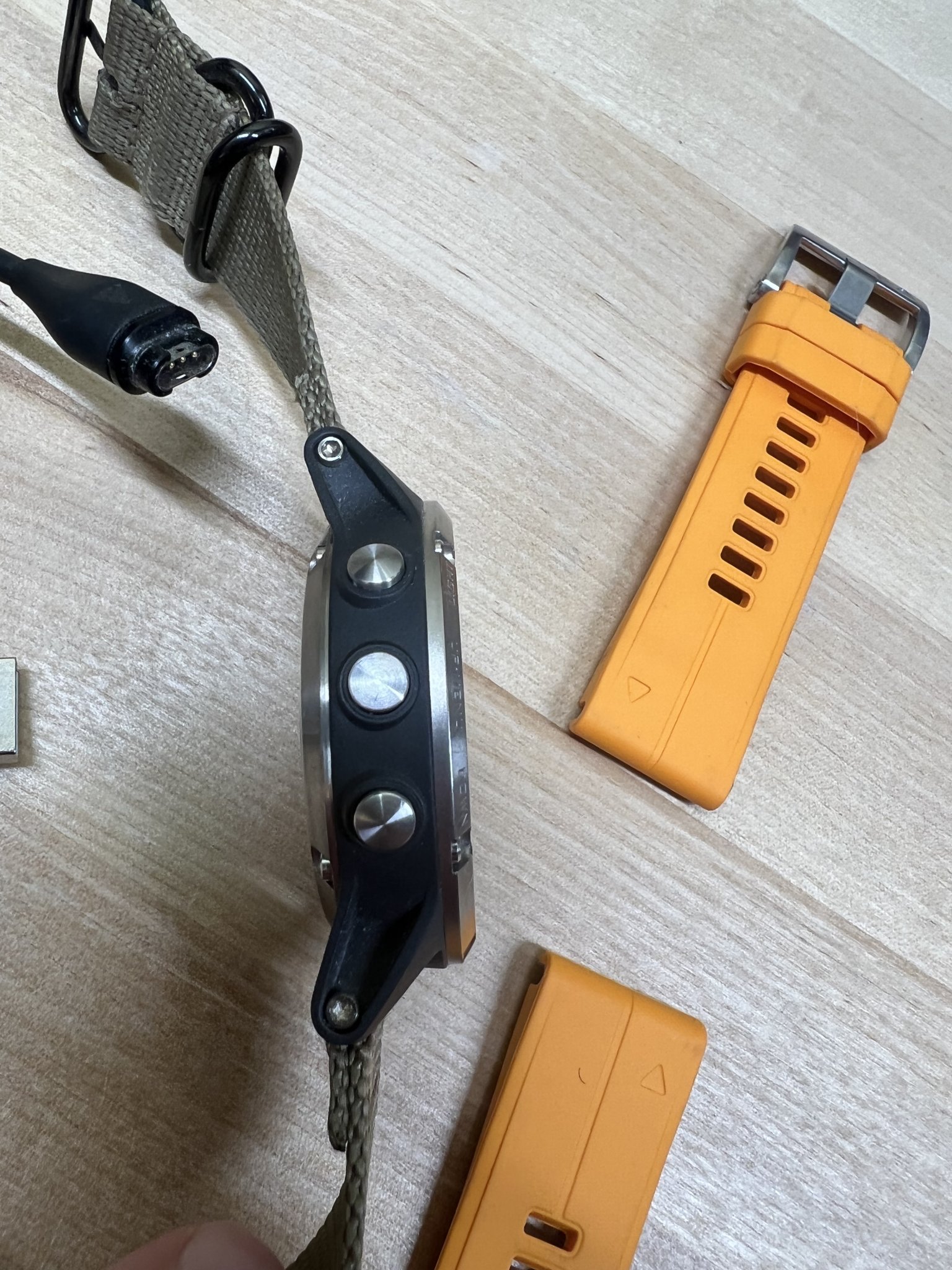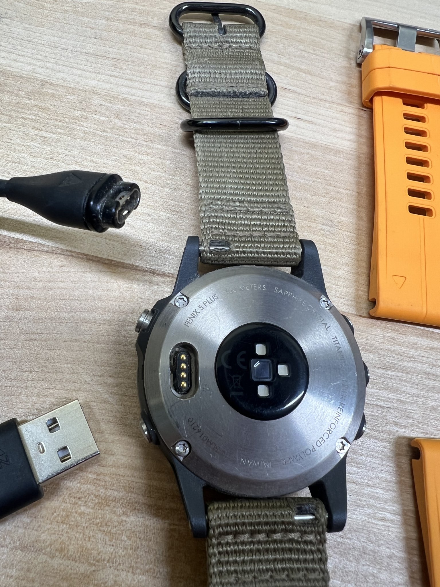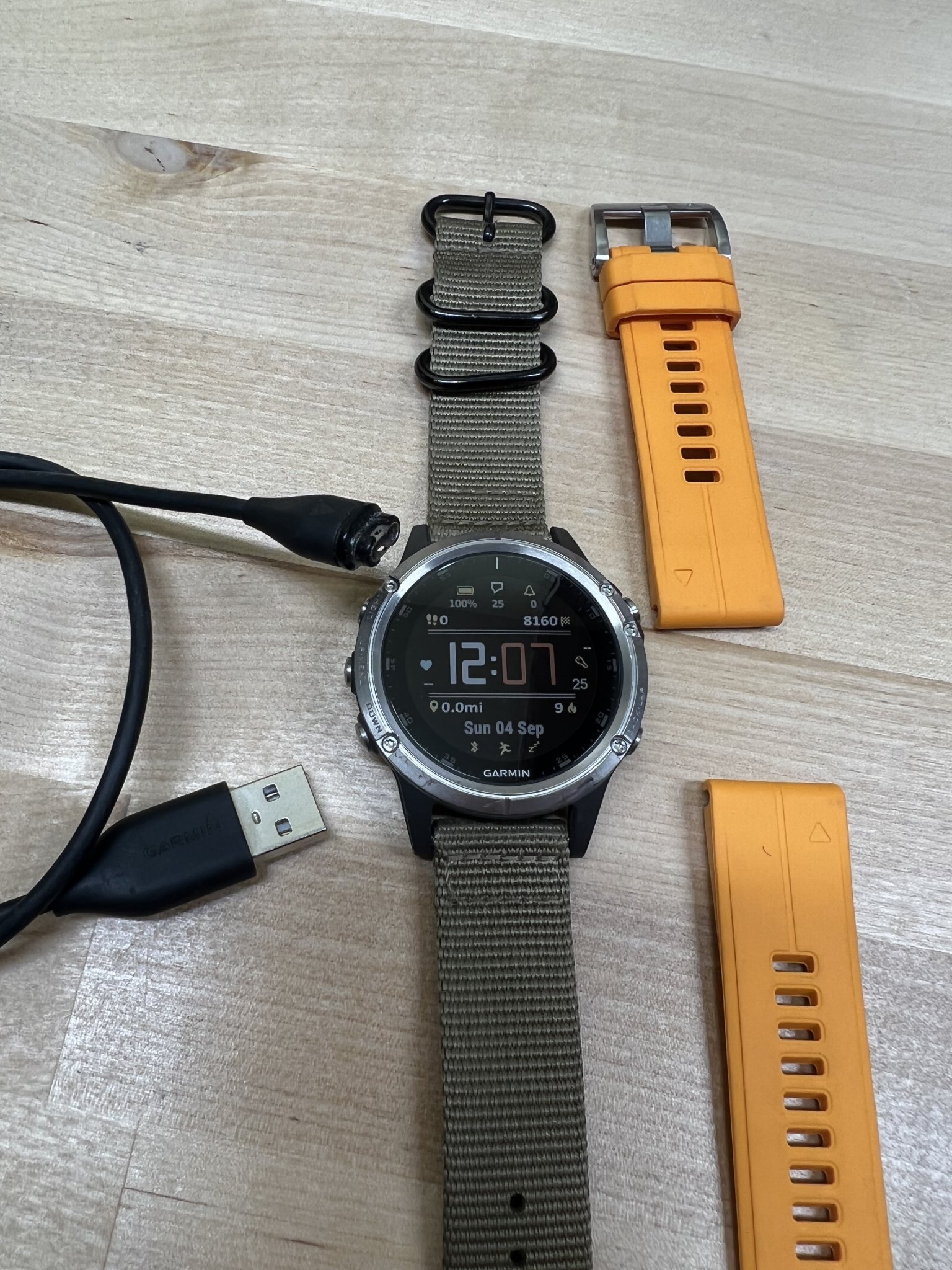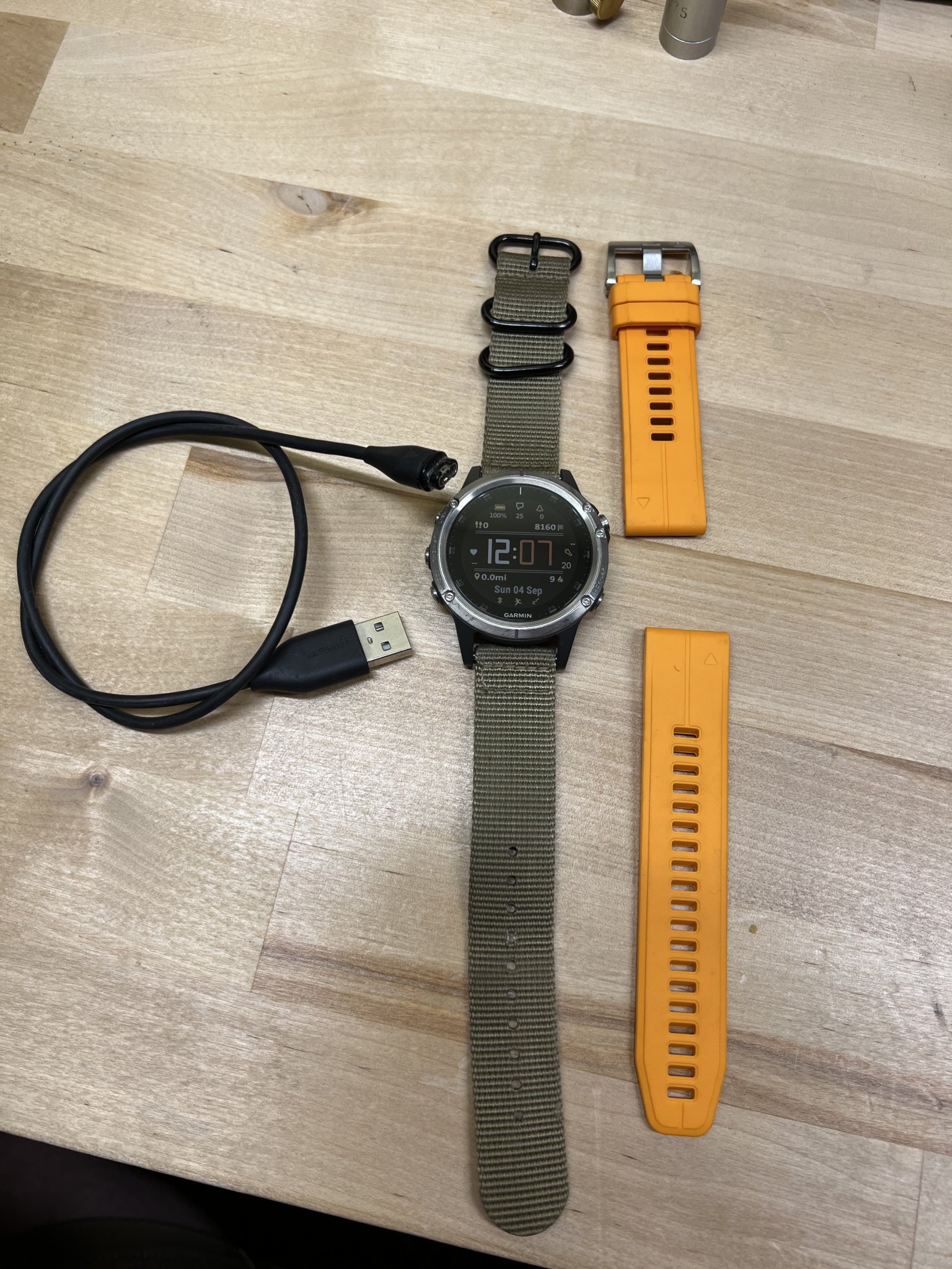Selling my garmin fenix 5plus sapphire. Titanium frame with orange band and fde nylon band which i preferred. Everything works as it should, comes with the charging cable, no box. Asking $200 SOLD!