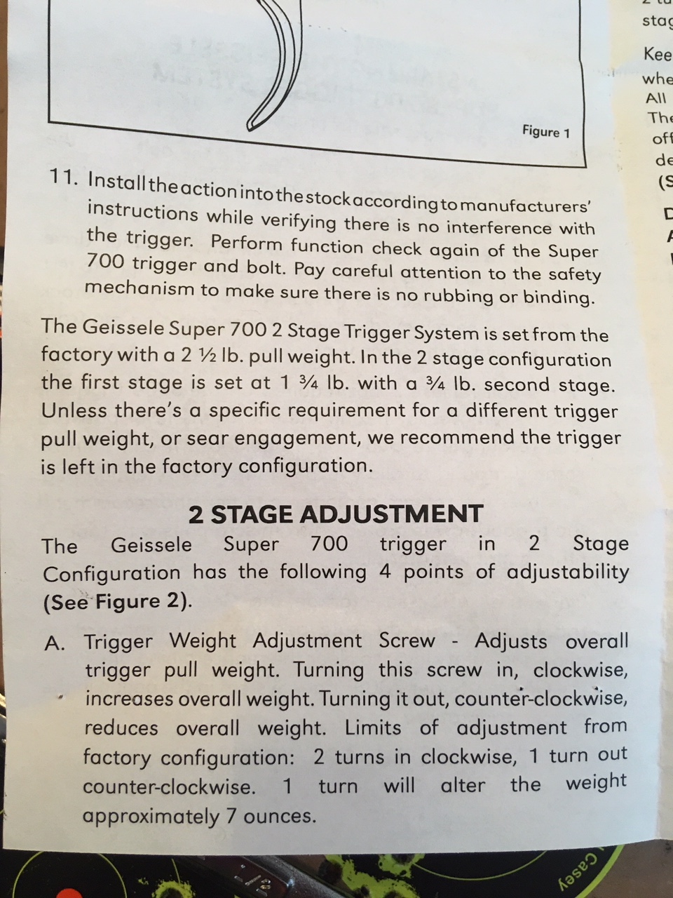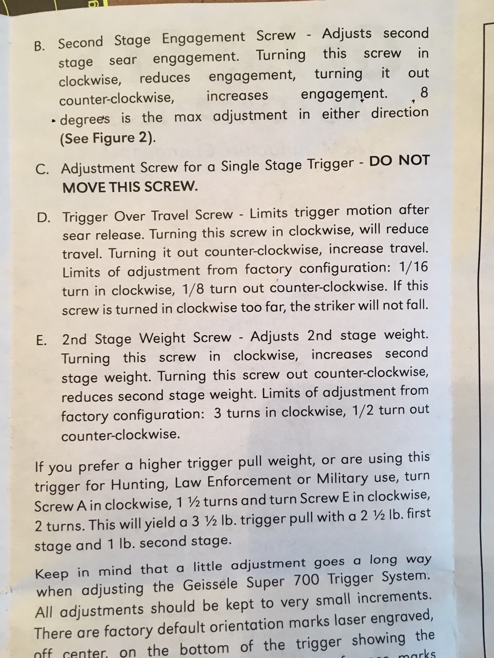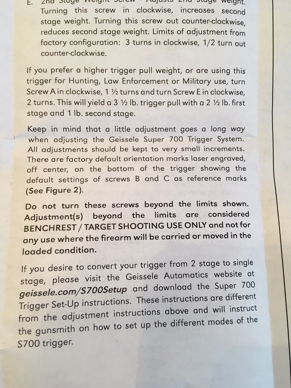 A quick update after Saturdays range session. The trigger performed flawlessly and felt good. I did decrease the factory set weight following the included instruction (see attached). It's supposed to come set from factory as 1st stage = 1lbs 12oz and 2nd stage = 12oz. Testing with a Lyman digital pull weight gauge yielded a 1st stage of 1lbs 12oz and a total pull weight of 2lbs 6oz. Doing math yields a 2nd stage weight of 10oz. So either my gauge is a little off or mine came set a bit on the heavy side from the factory. I may tweak it a little lower, but it is perfectly usable at the current weights. I also need to double check but the safety lever appears to be a short throw rather than the traditional longer throw of Rem 700.