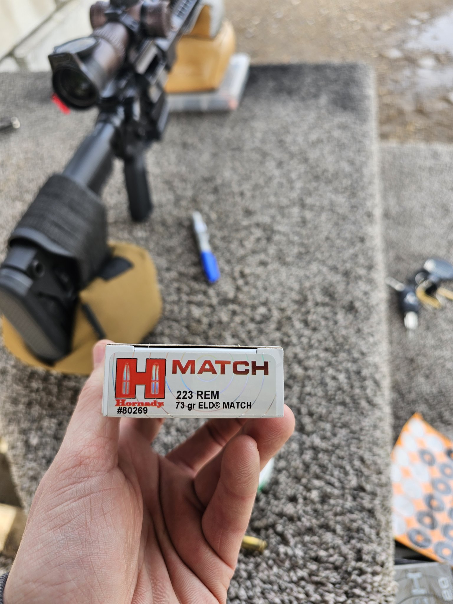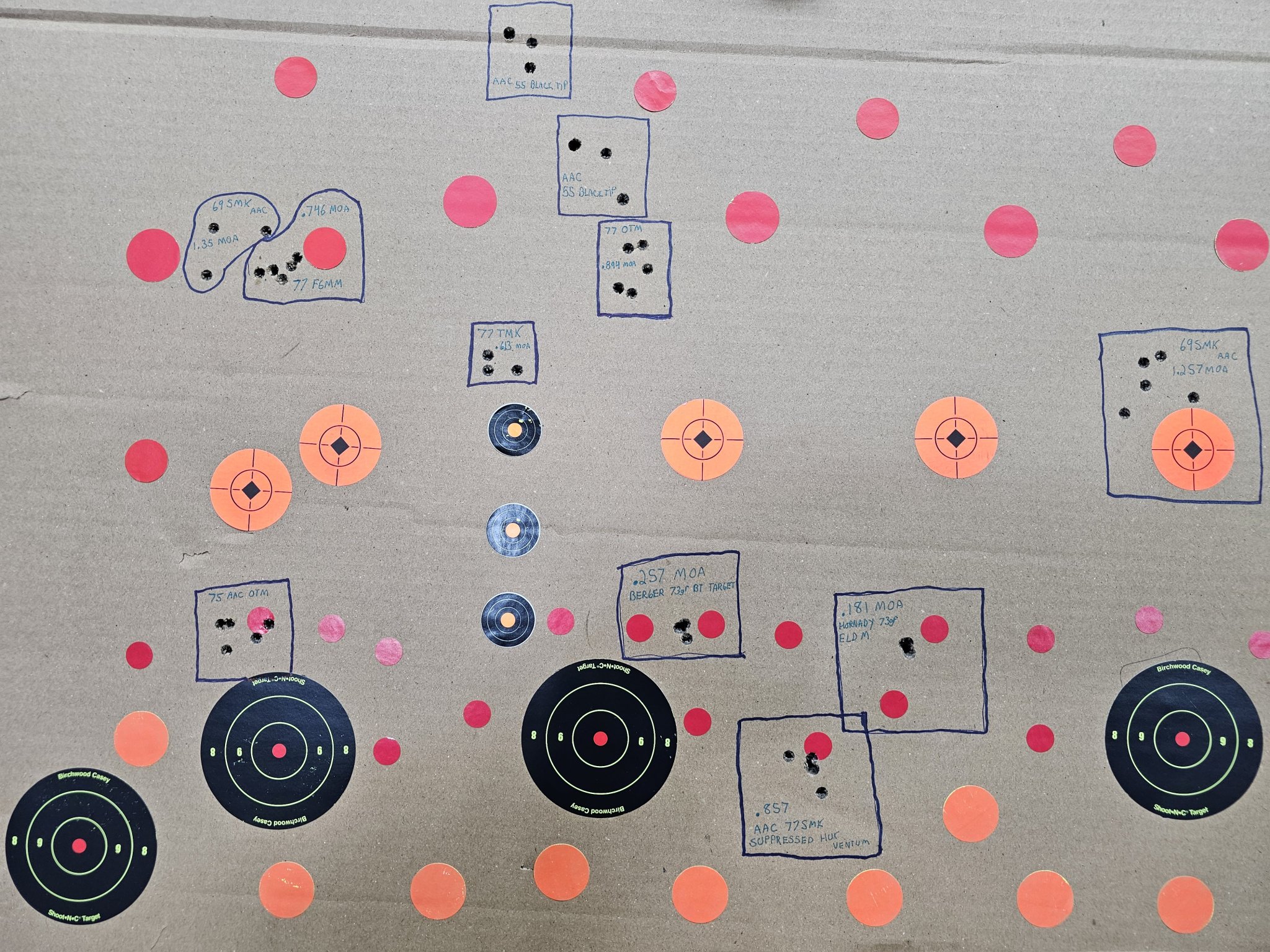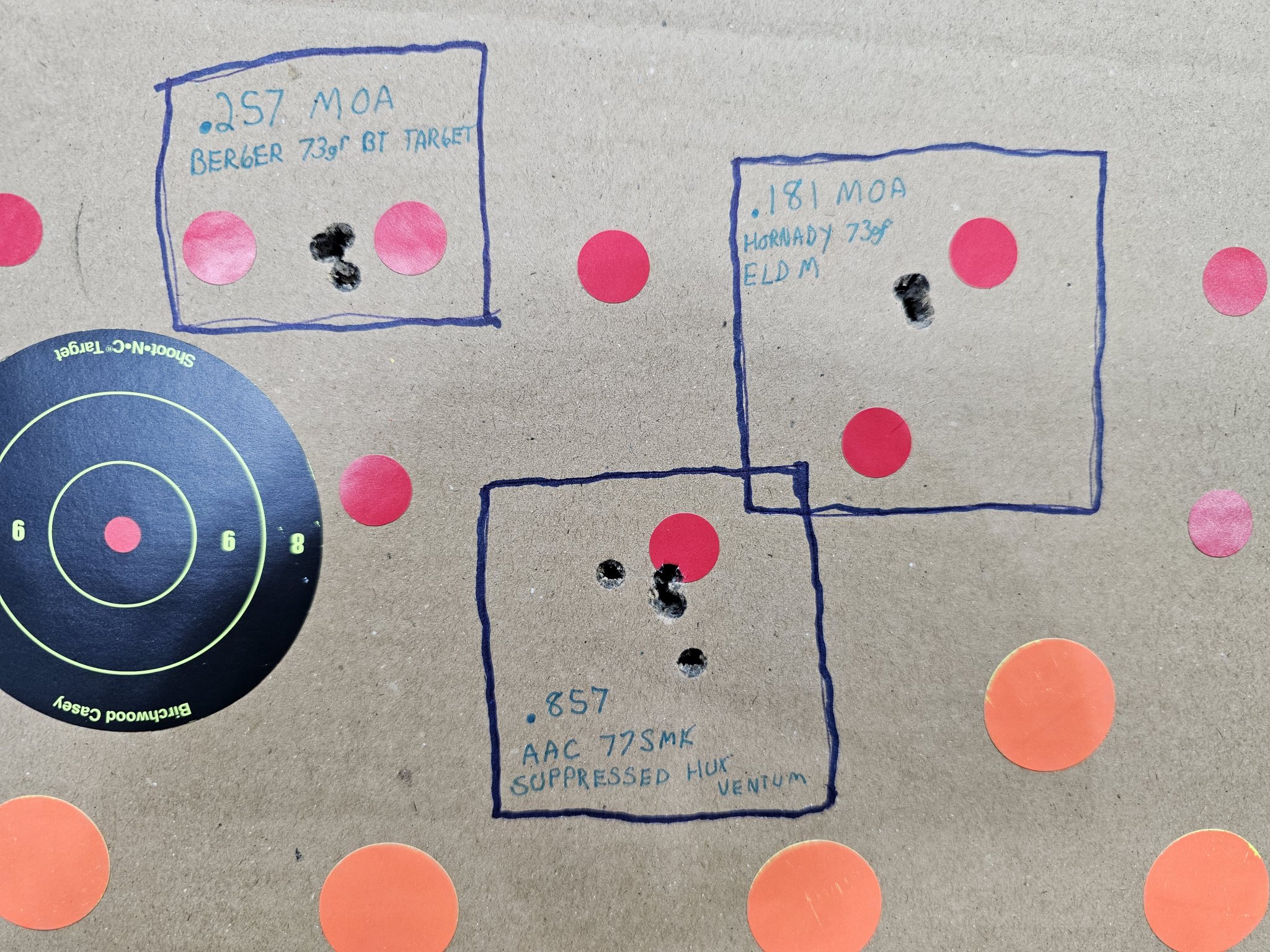 Will you be testing those 73grain ELDs with a can?All 5 shot groups of various types of factory ammo with the exception of some cheap 55 grain stuff I use to season the clean barrels before I shot the groups and a couple random 77 Grand tmks I had hanging around. The Geissele heavy Contour barrels truly love the 73 grain projectiles.