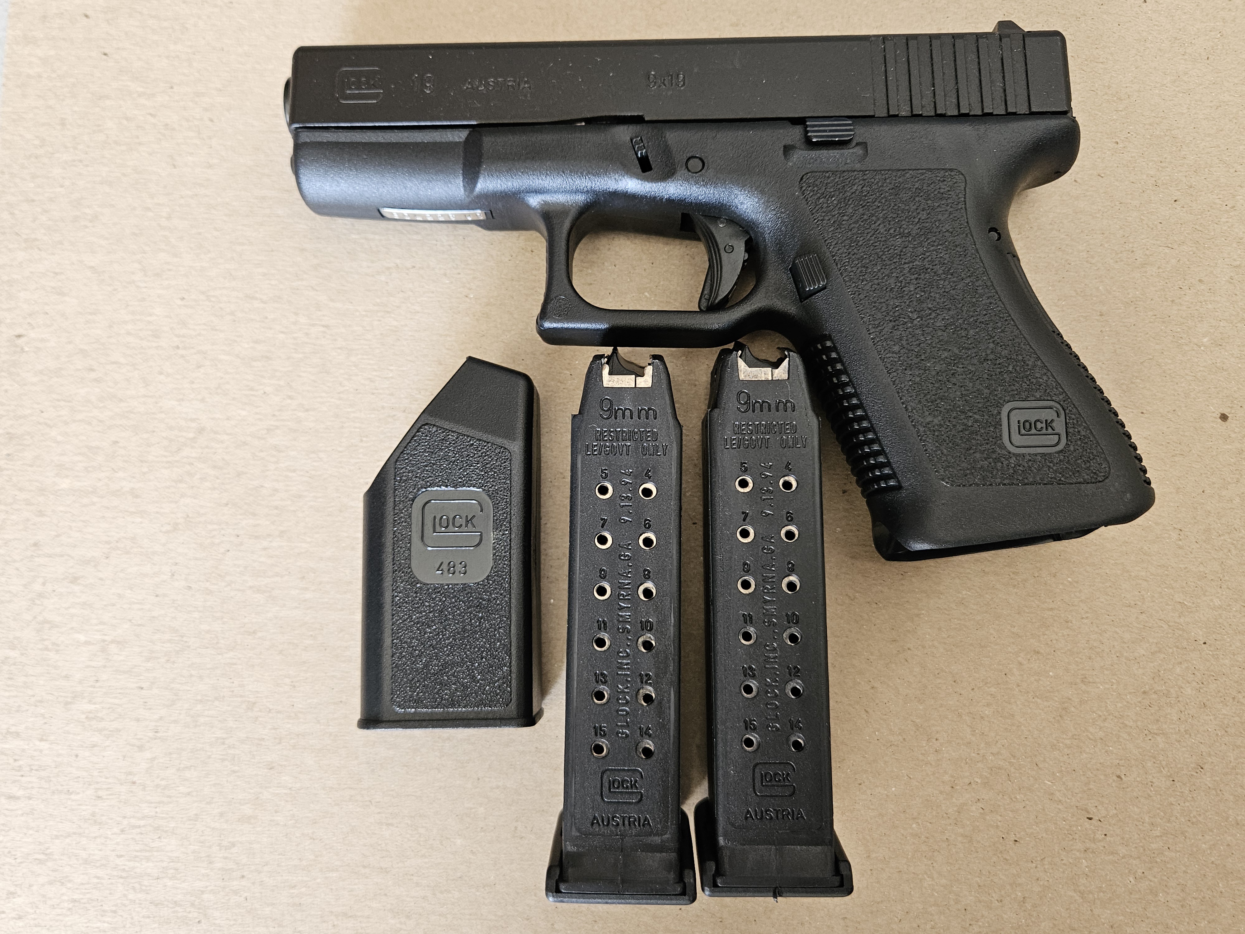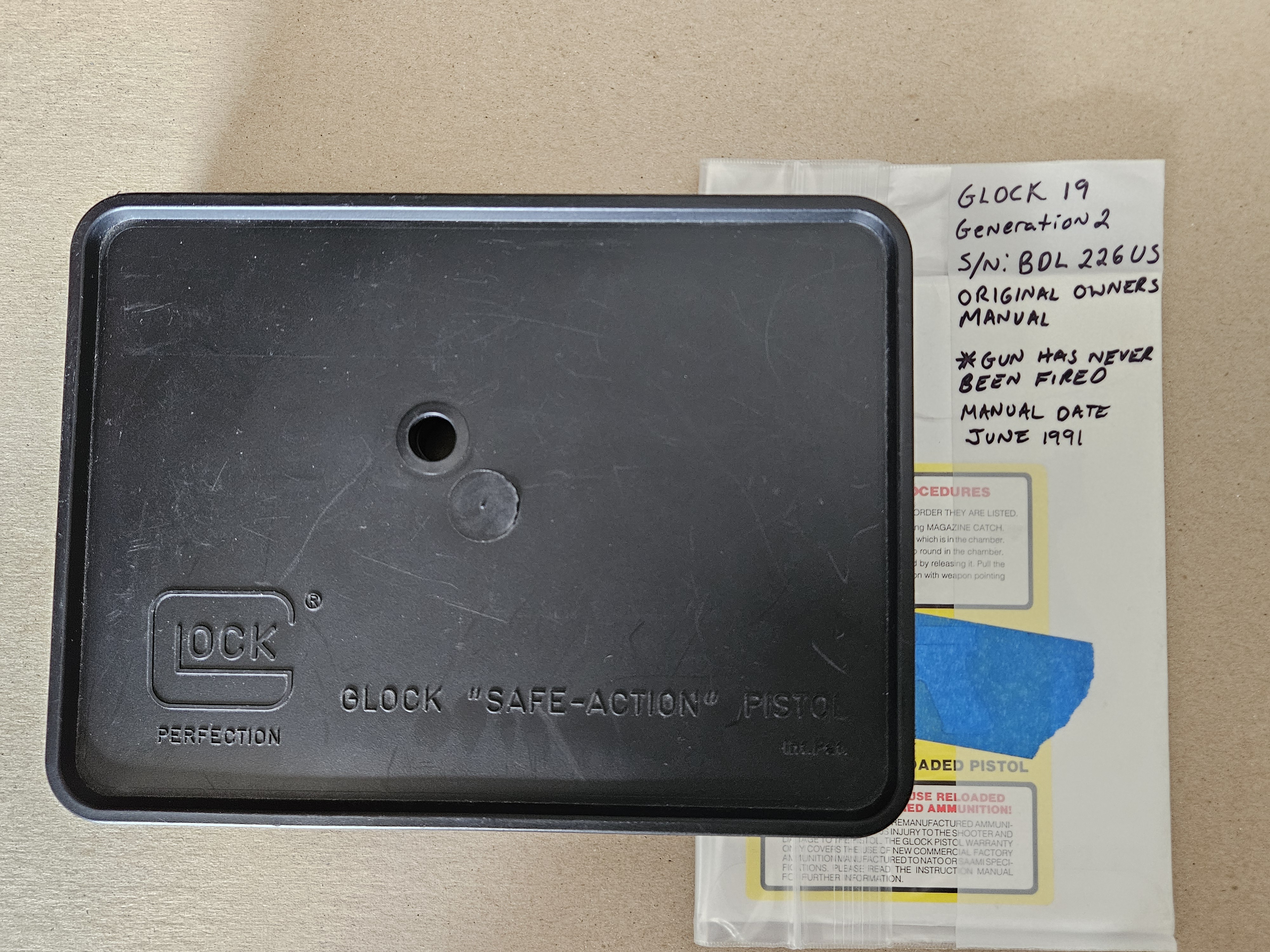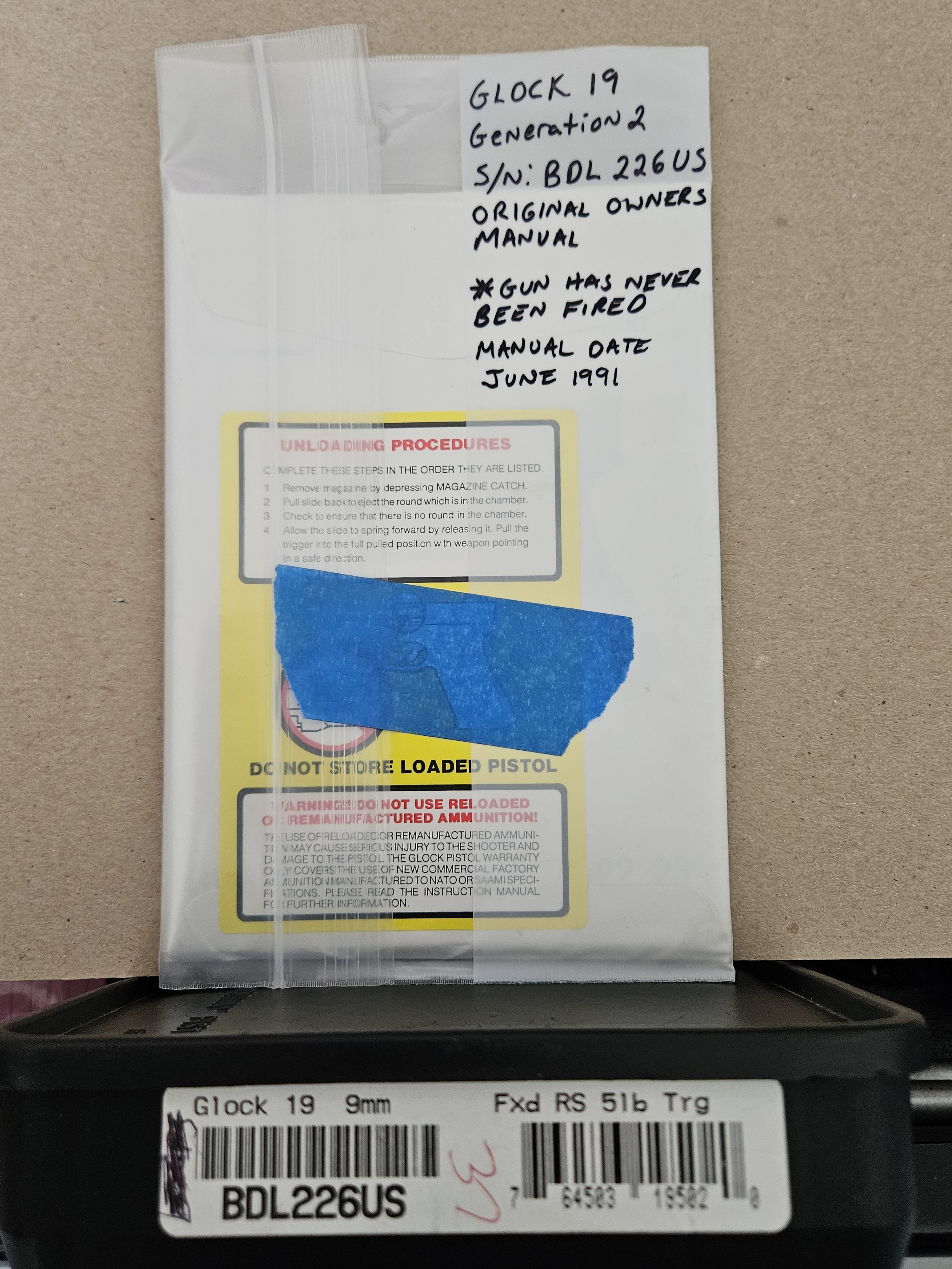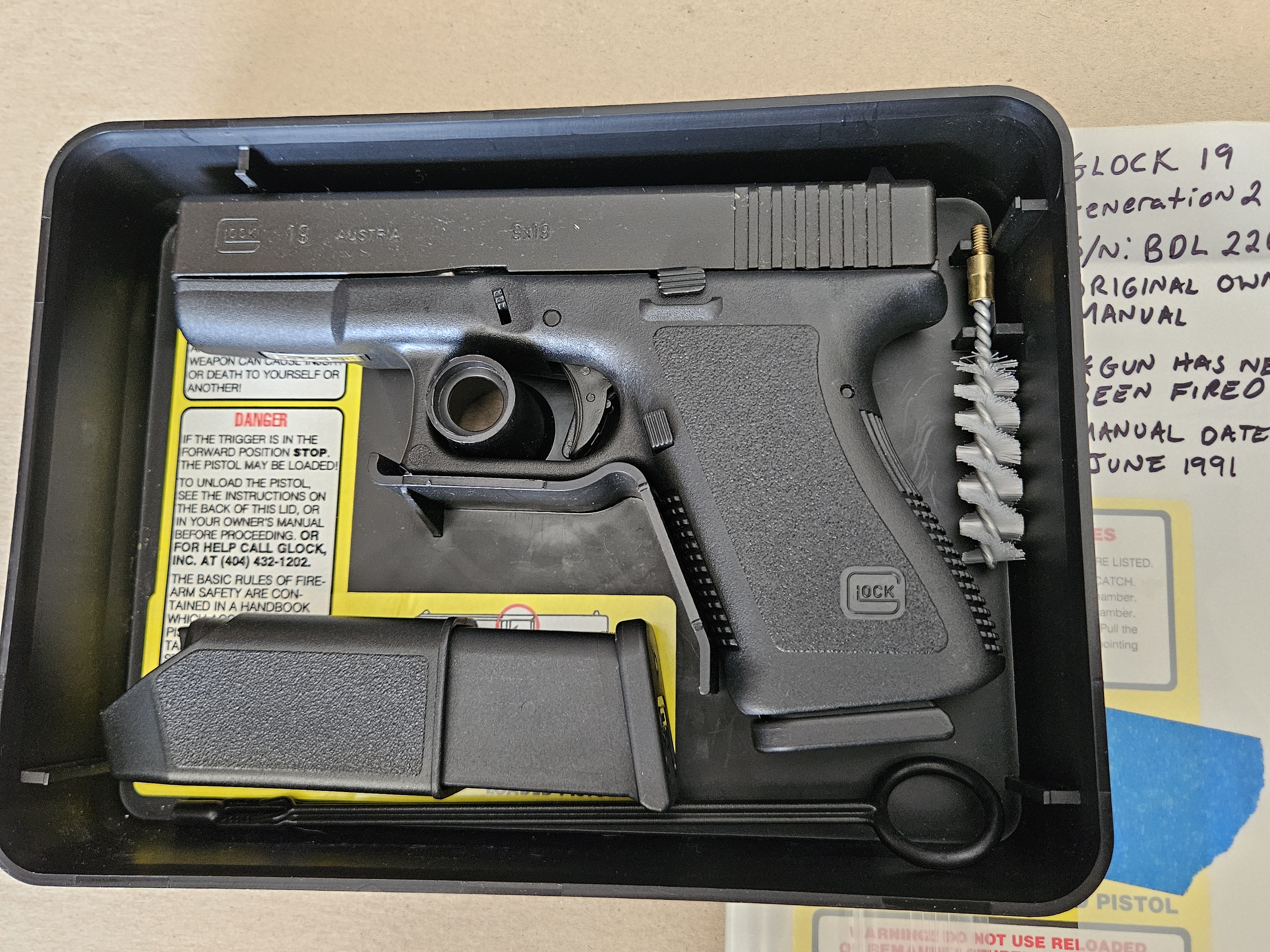 GLOCK 19 GEN 2 TO MY KNOWLEDGE UNFIRED AND NEW. INCLUDES MANUAL AND ACCESSORIES. THE MAGAZINES ARE NOT THE ORIGINAL AND I DO NOT HAVE THEM.