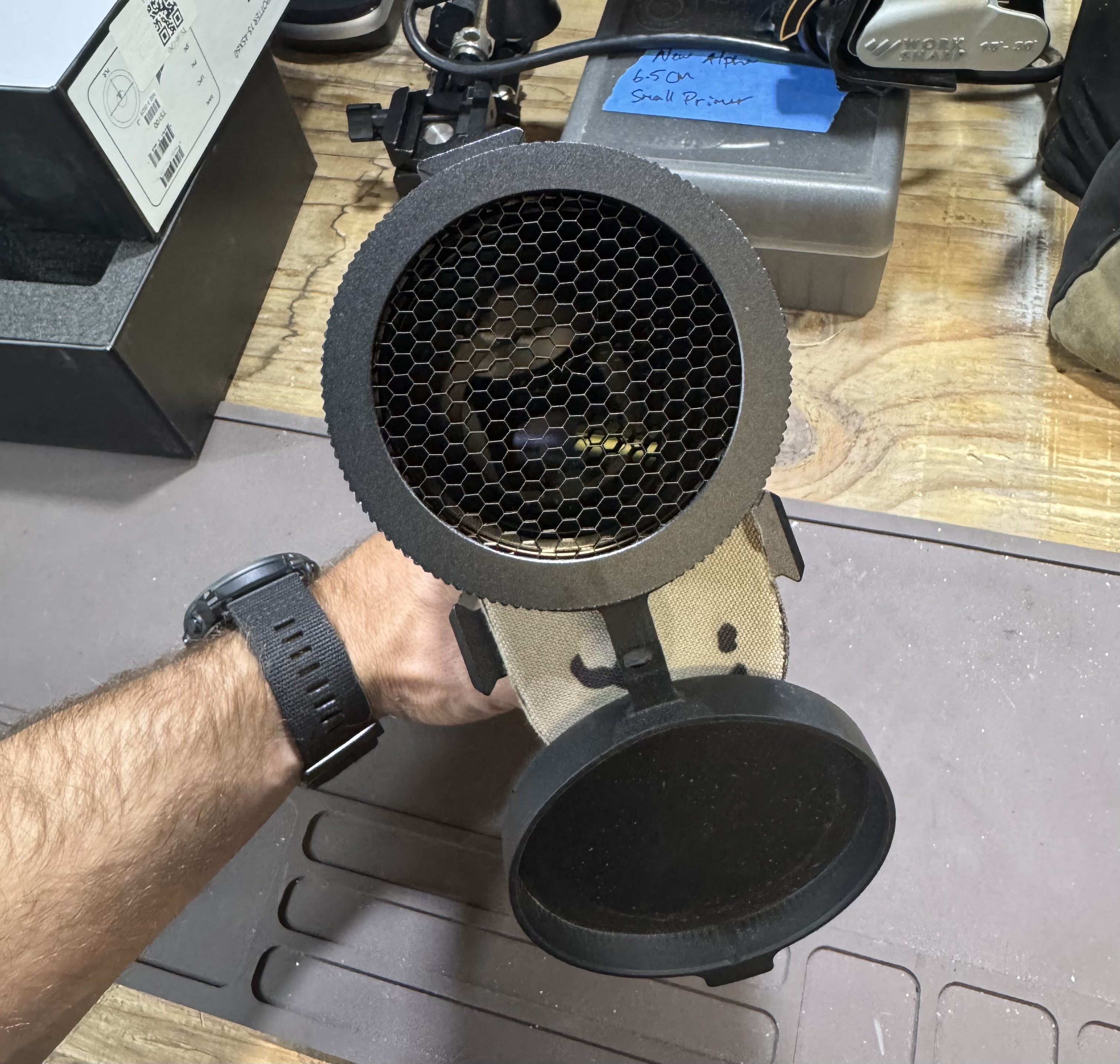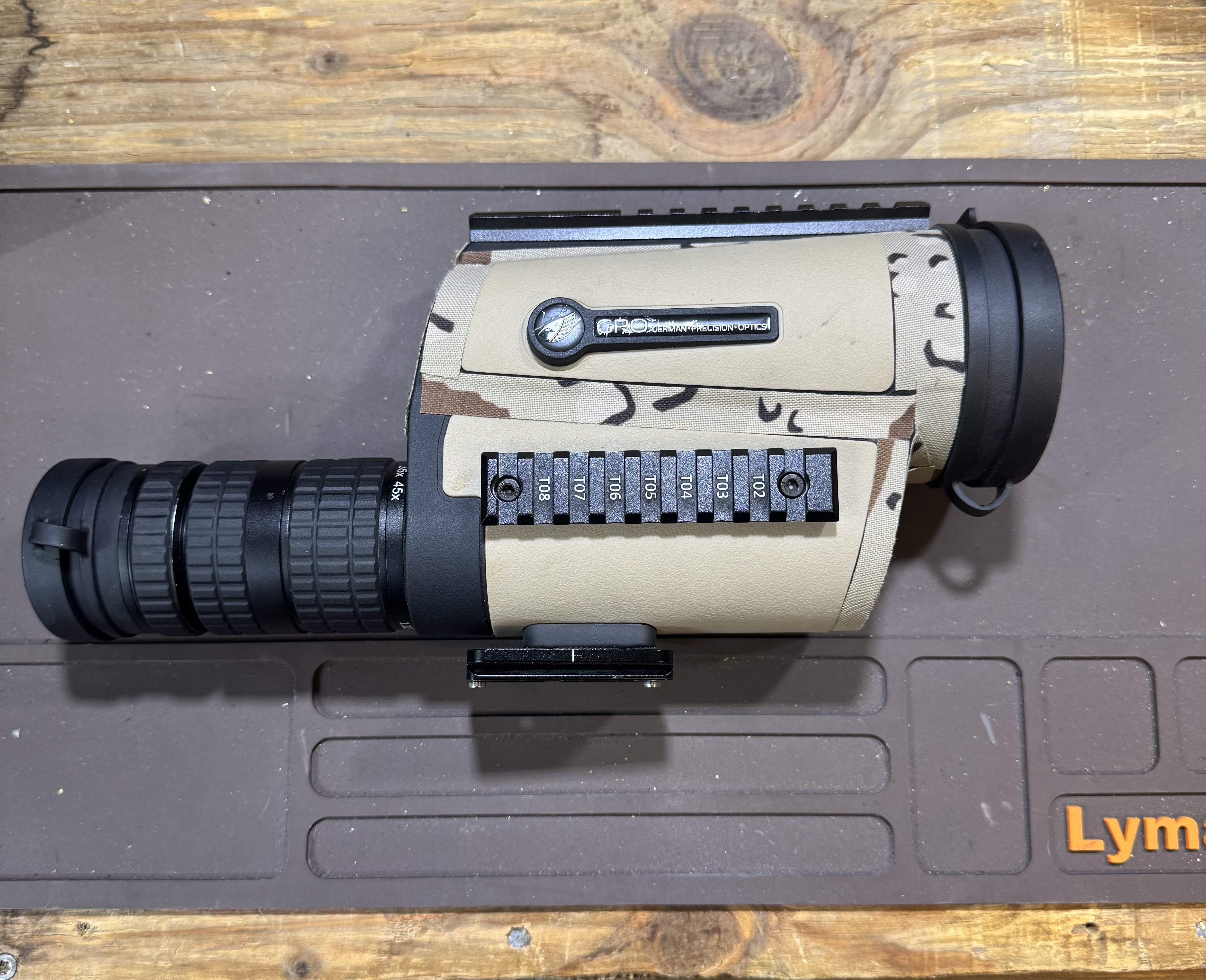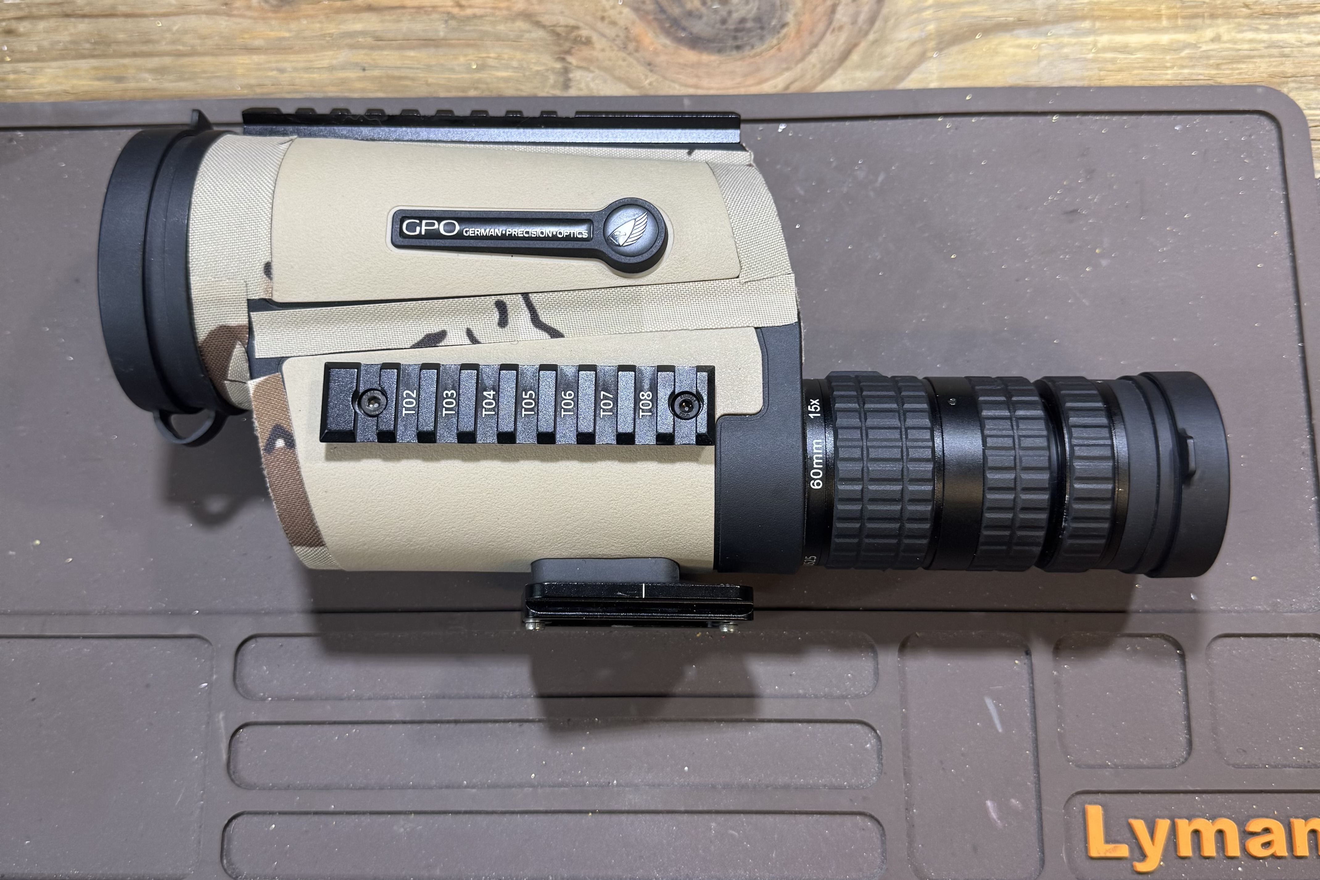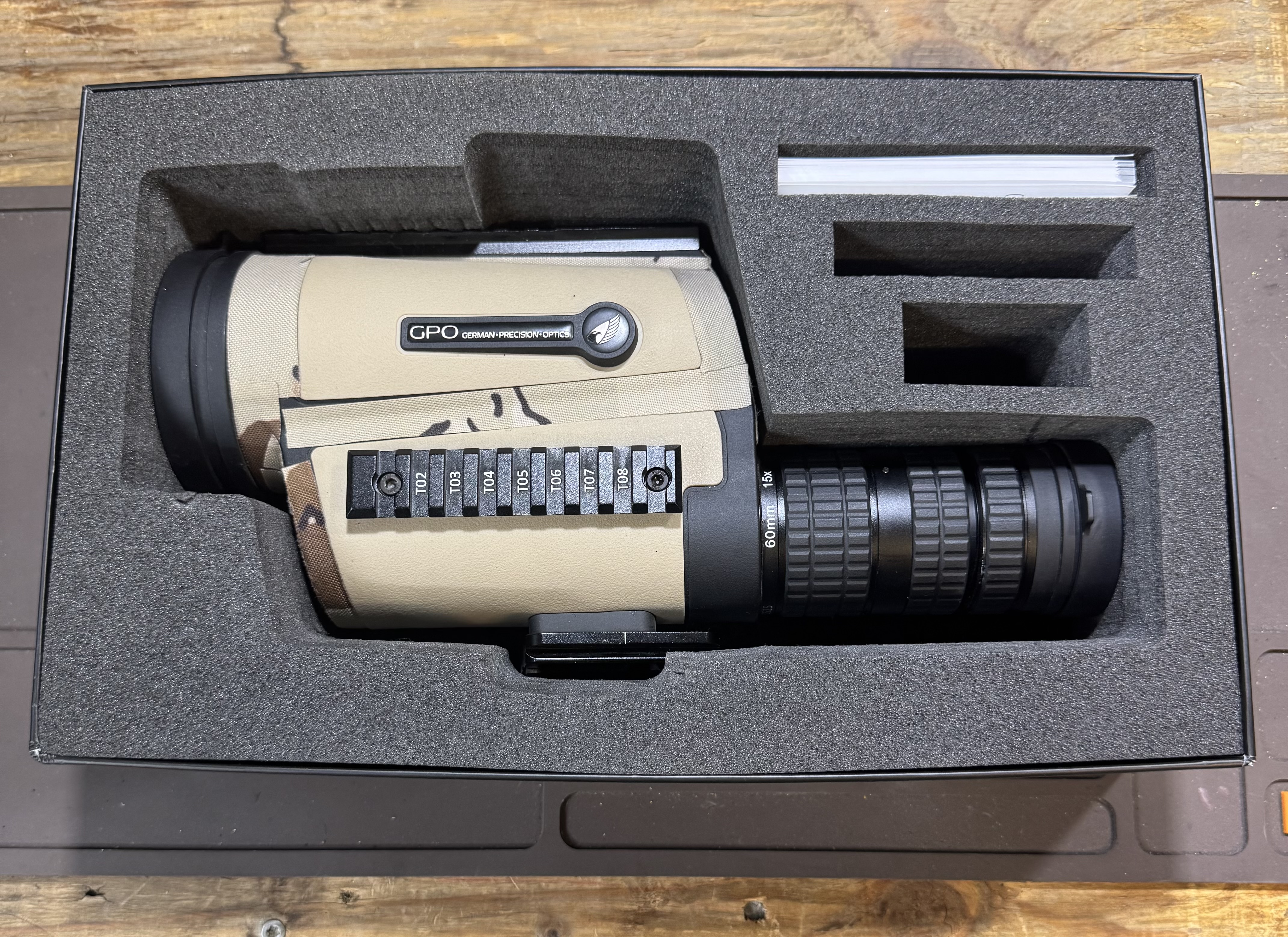 The German Precision Optics GPO Tac45 15-45x60 spotting scope is a high end spotting scope with many sought after features for hunters, competitors and warriors alike. I’ll start with the exterior - this scope has an arca mount on the base and picatinny rails on the top and sides. It is wrapped in a desert camo wrap and features honey comb reflective dampening cover on the front which also doubles as protection from drops. The glass is quite impressive featuring FFP mil reticle with all the adjustments you need to meet your eyes needs. I have the box along with paperwork. Ready to ship. There are some light signs of wear along the badging on the side but is generally in good condition. |