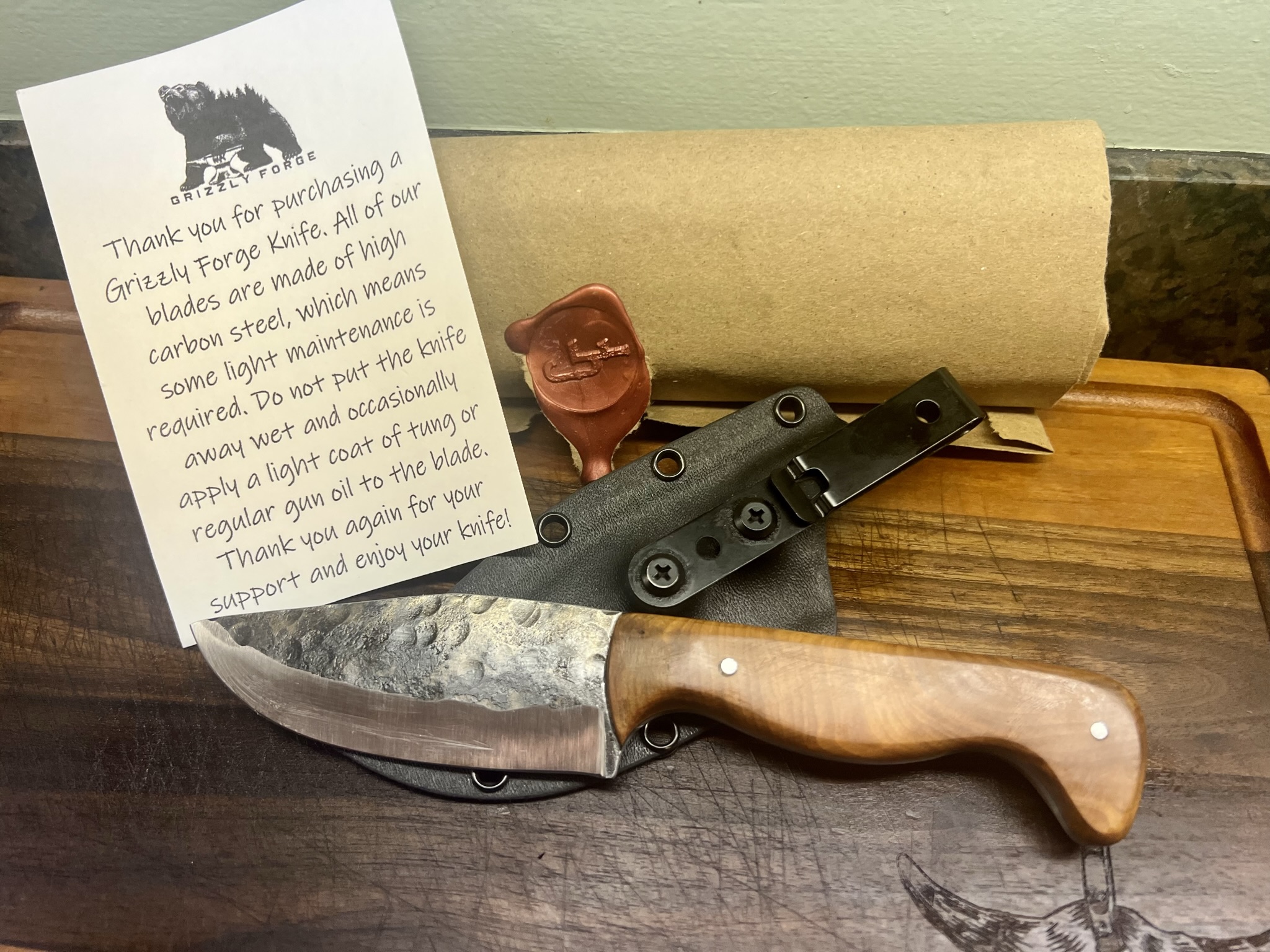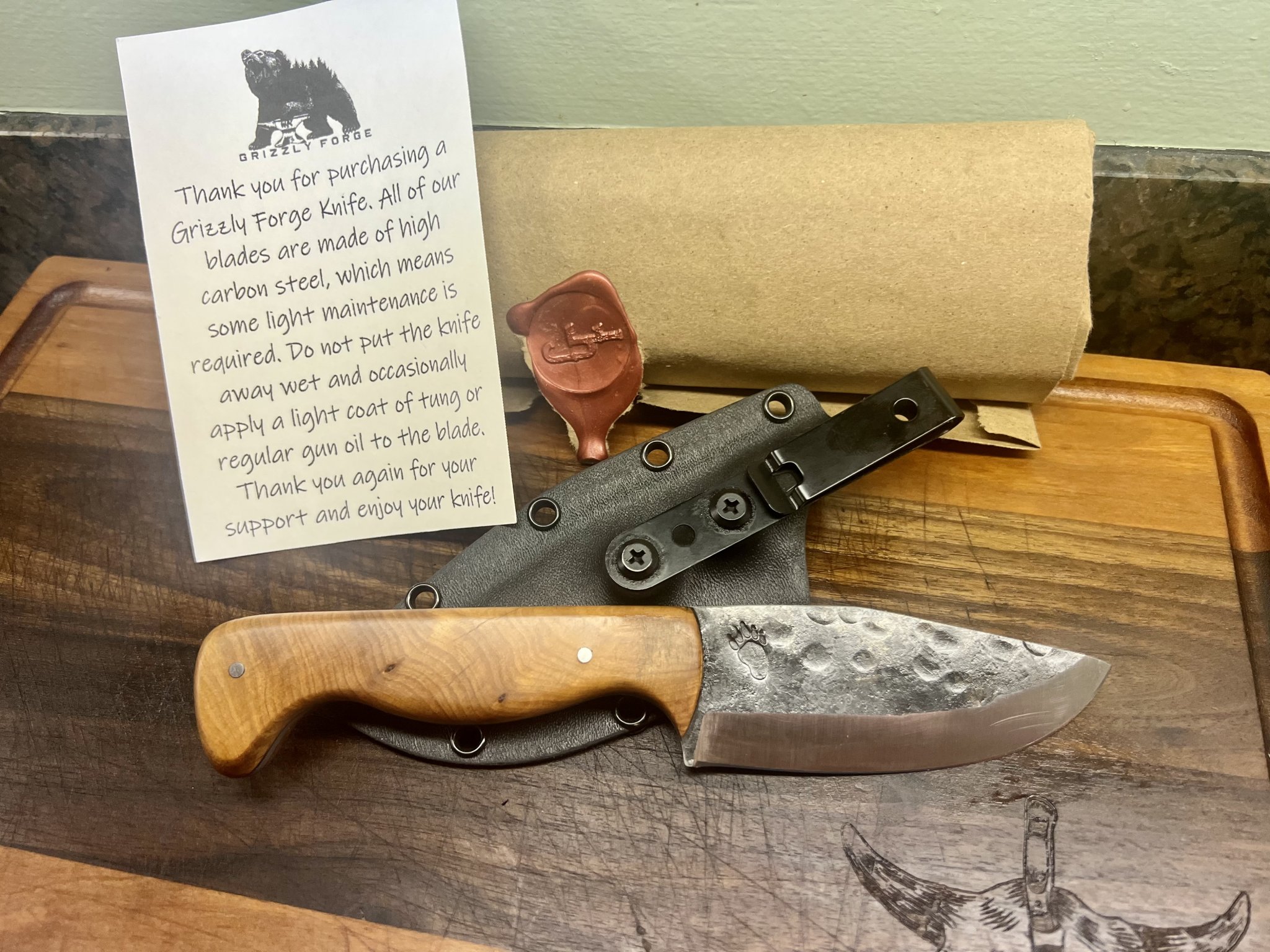 Grizzly forge Kodiak $250 shipped. Drop was around 400 can’t remember exactly. Comes with sheath card and original packing paper. Spent most its life on my magnetic board. Shows some wear on handle where it engages in sheath.