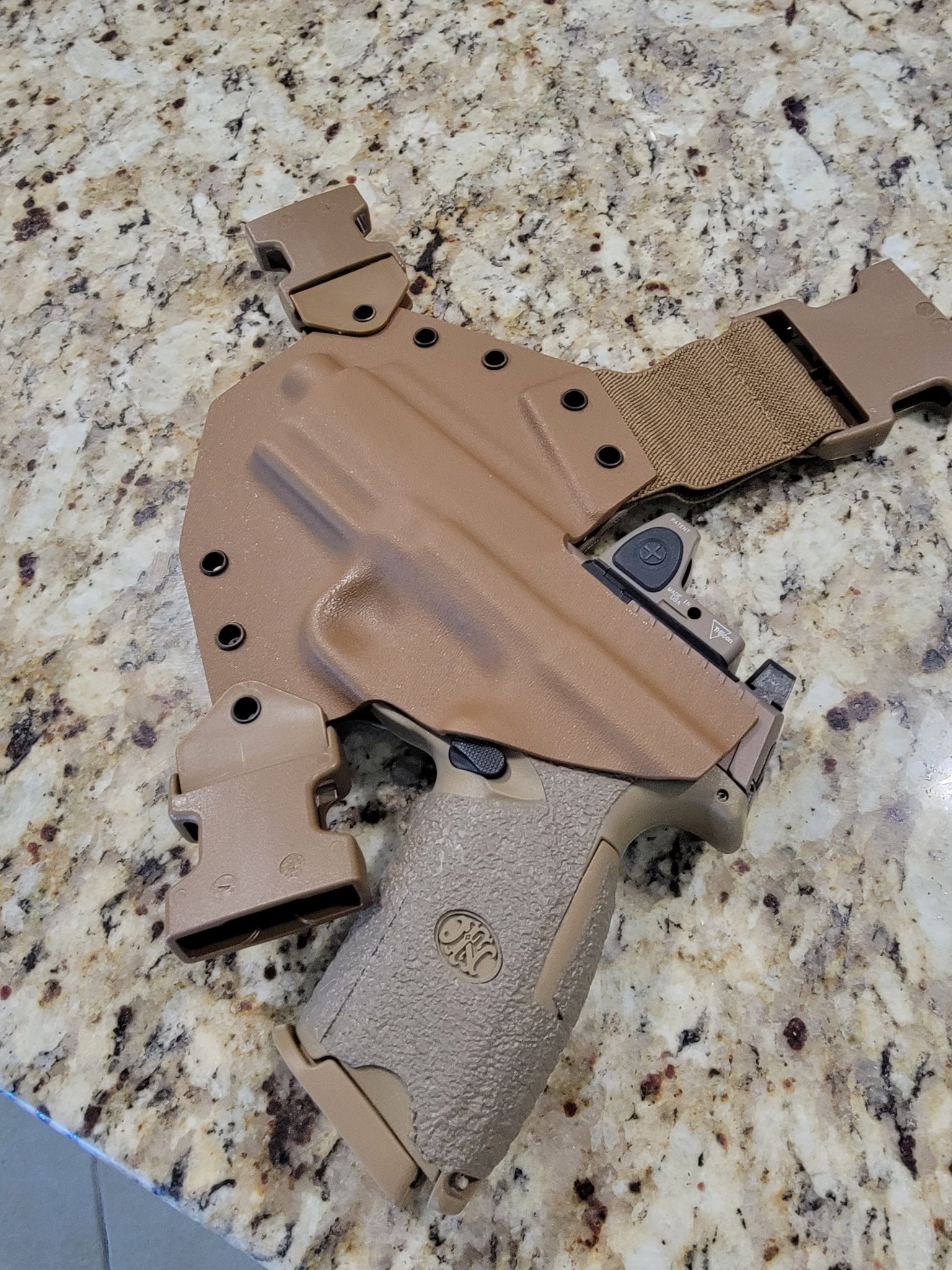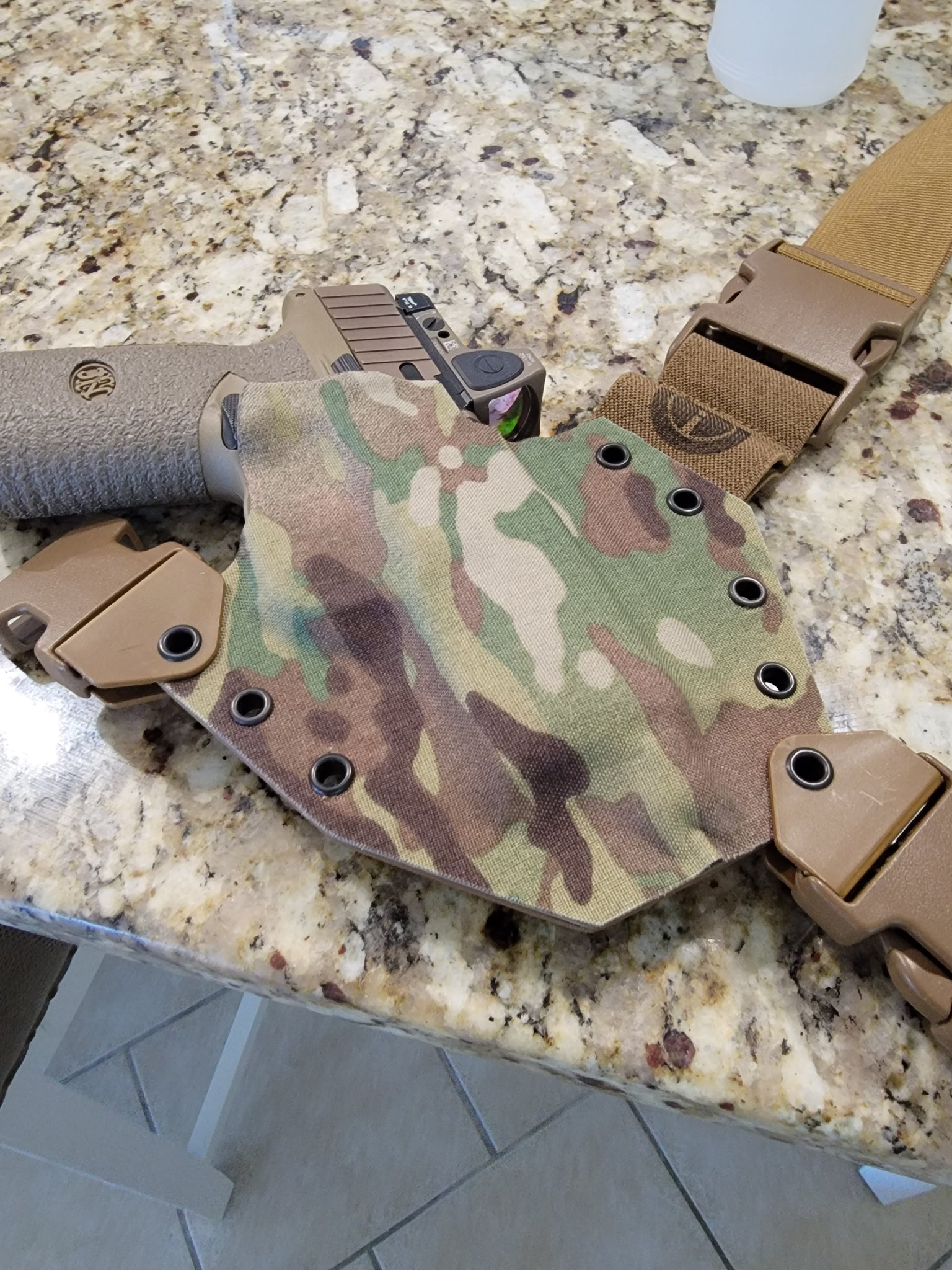 I have a brand new. Never used or sweat in, Gunfighters Kanai Chest Rig. Had it built for FN 509 Tact with threaded barrel. Can height sights. And optic. It is MC fabric wrapped and coyote brown all around. Super nice.