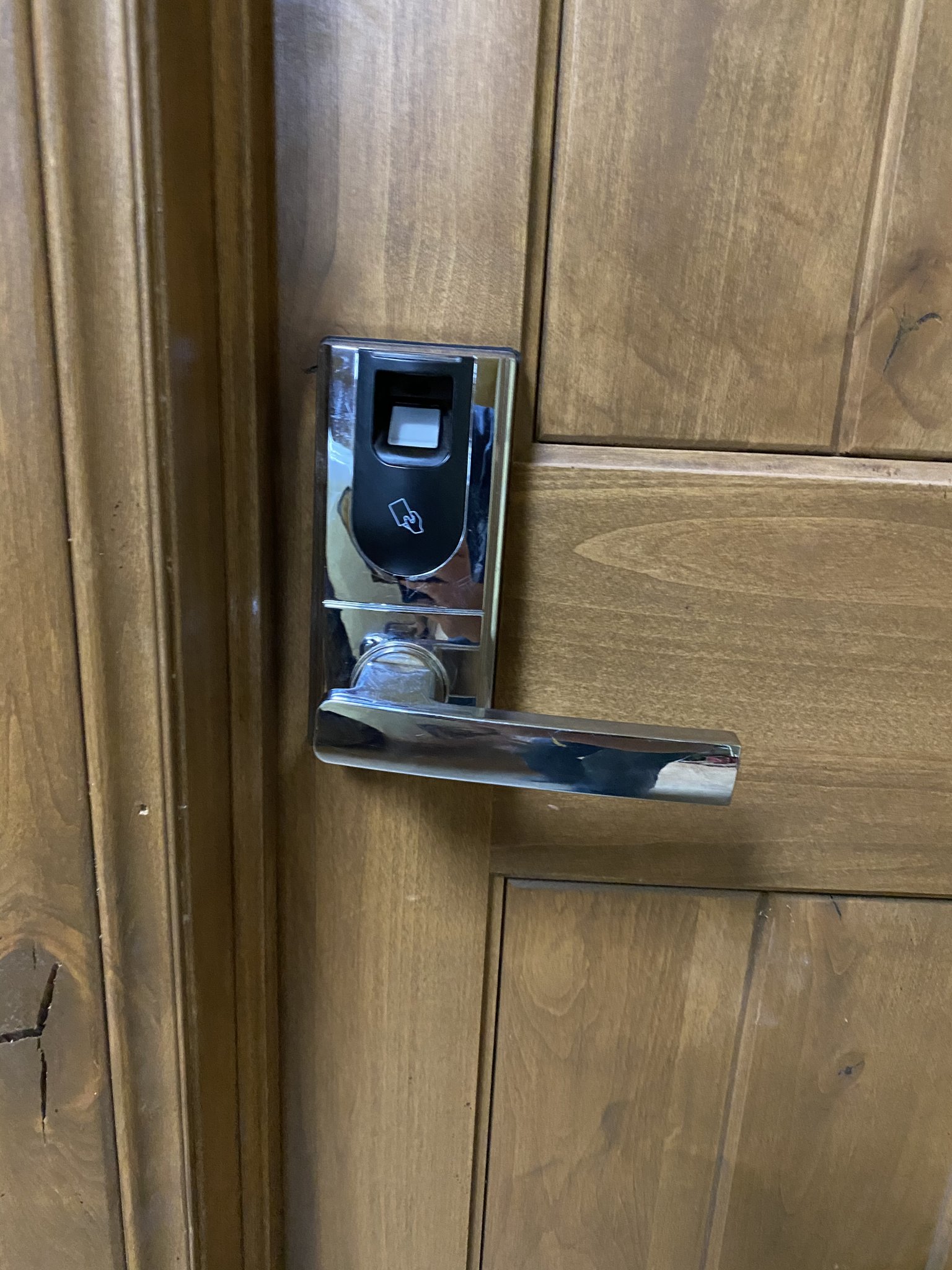 I have a solid wood door and this commercial fingerprint reading handle. It keeps the kids and ol lady out and will keep the honest, honest. There is a safe inside for the big ticket items. May be something to look into to add to more security.