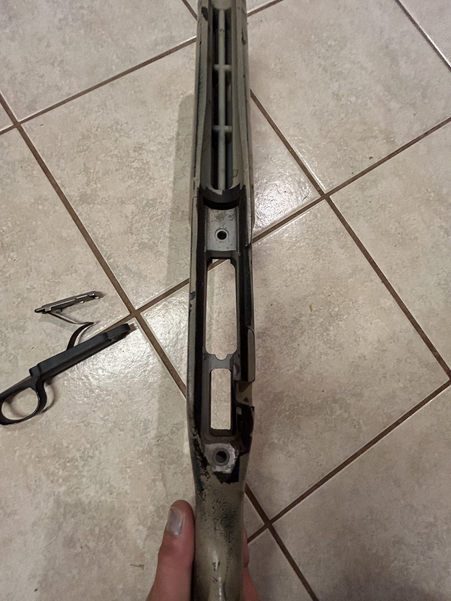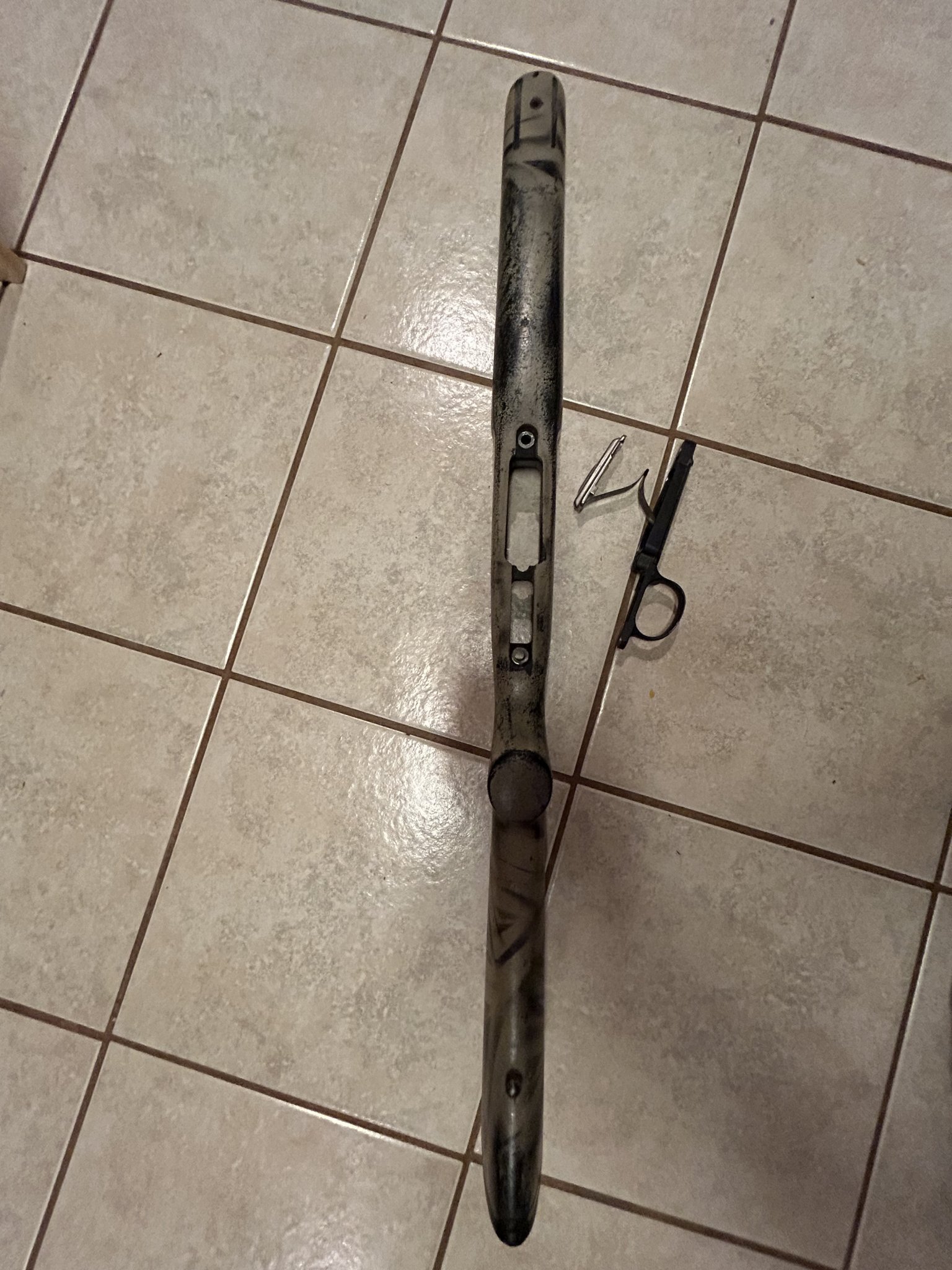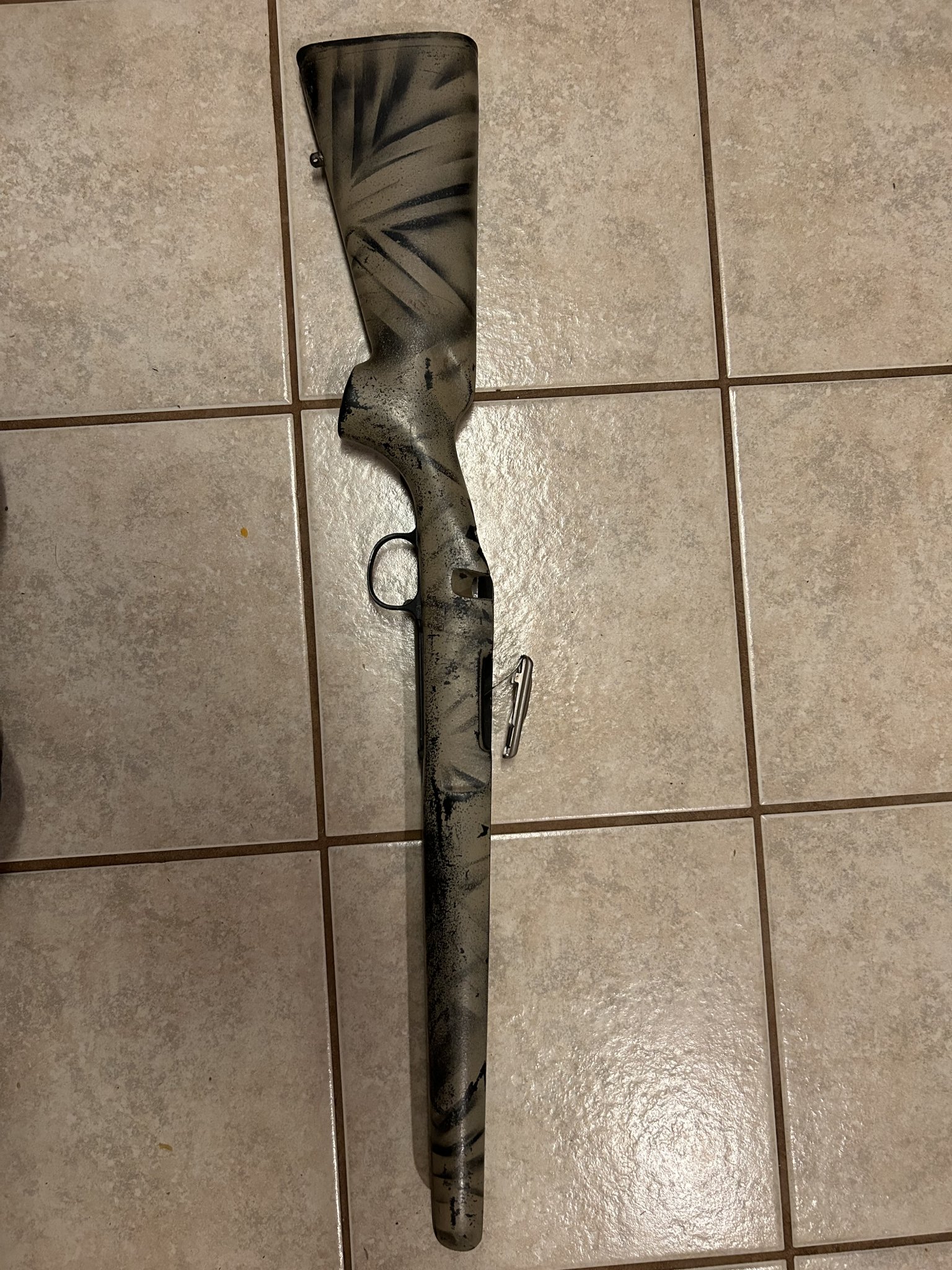 Bell and Carlson 700 SA stock. Has a rattle can paint job. Comes with factory 700 bottom metal.