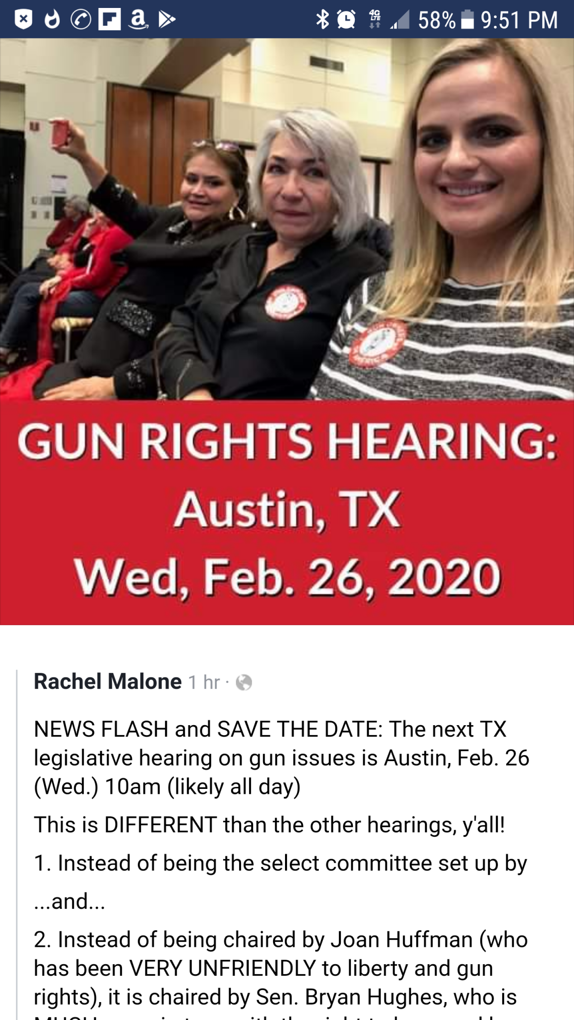NEWS FLASH and SAVE THE DATE: The next TX legislative hearing on gun issues is Austin, Feb. 26 (Wed.) 10am (likely all day)