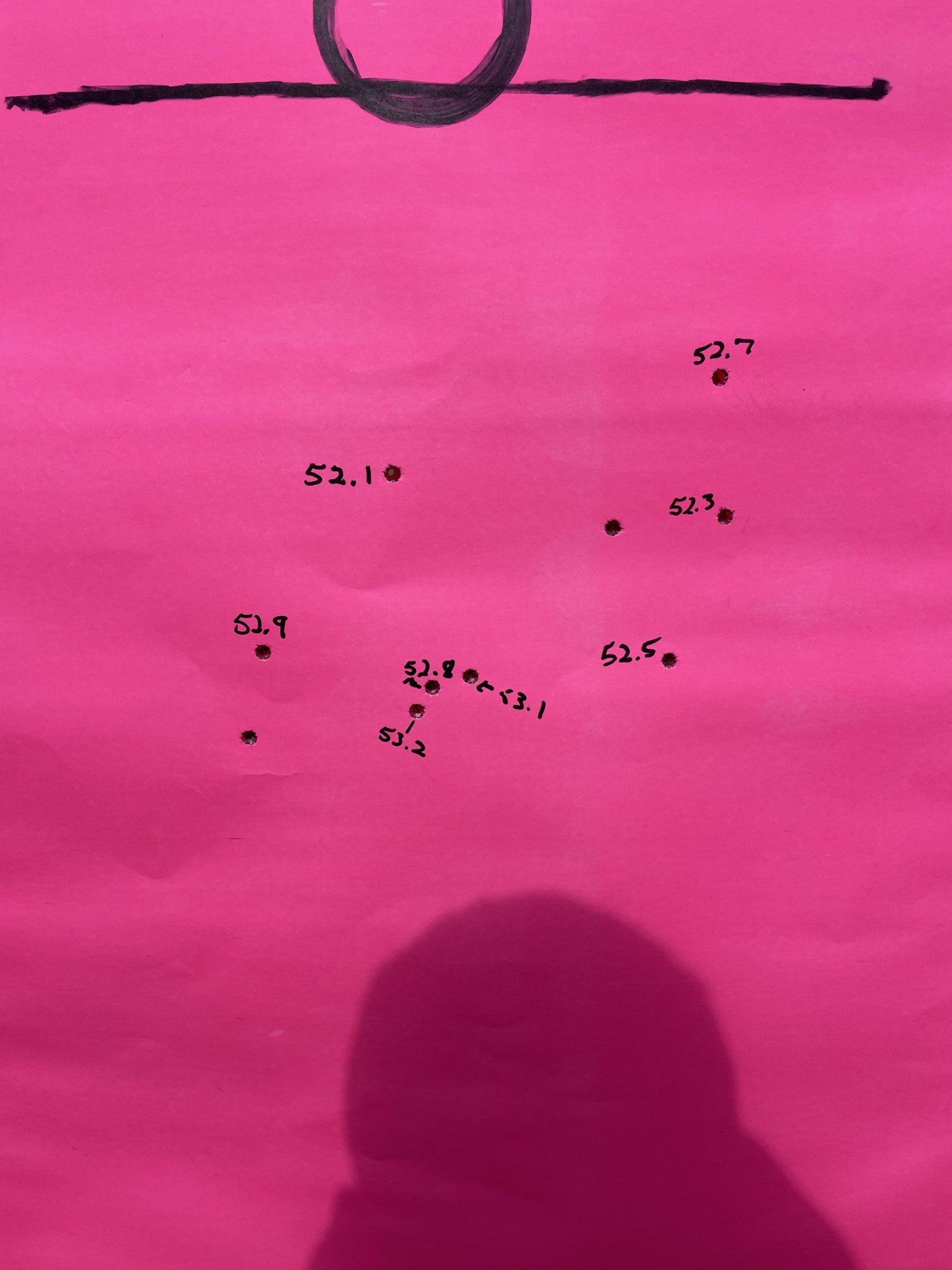@Smokin7s What made you focus only on that specific 52-53.5 interval of powder? Based on what I see there I would go with ~53 but I would have tested a 4 grain spread in .4 gr intervals looking for some wider patterns and pressure which is where ladder testing has its place vs this very narrow window.