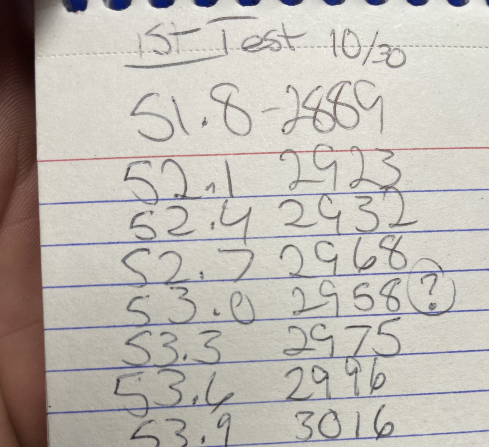 I’d do a quick 3-shot OCW using 52.8, 53.1 and 53.4 and see if your groups’ center POI is the same relative to POA across all three and they each group tight. If so, MV is satisfactory and no over pressure is present, I’d load up 60-100 rounds of 53.1 and start collecting drop data on steel in 50m increments out to how far you plan on shooting it.