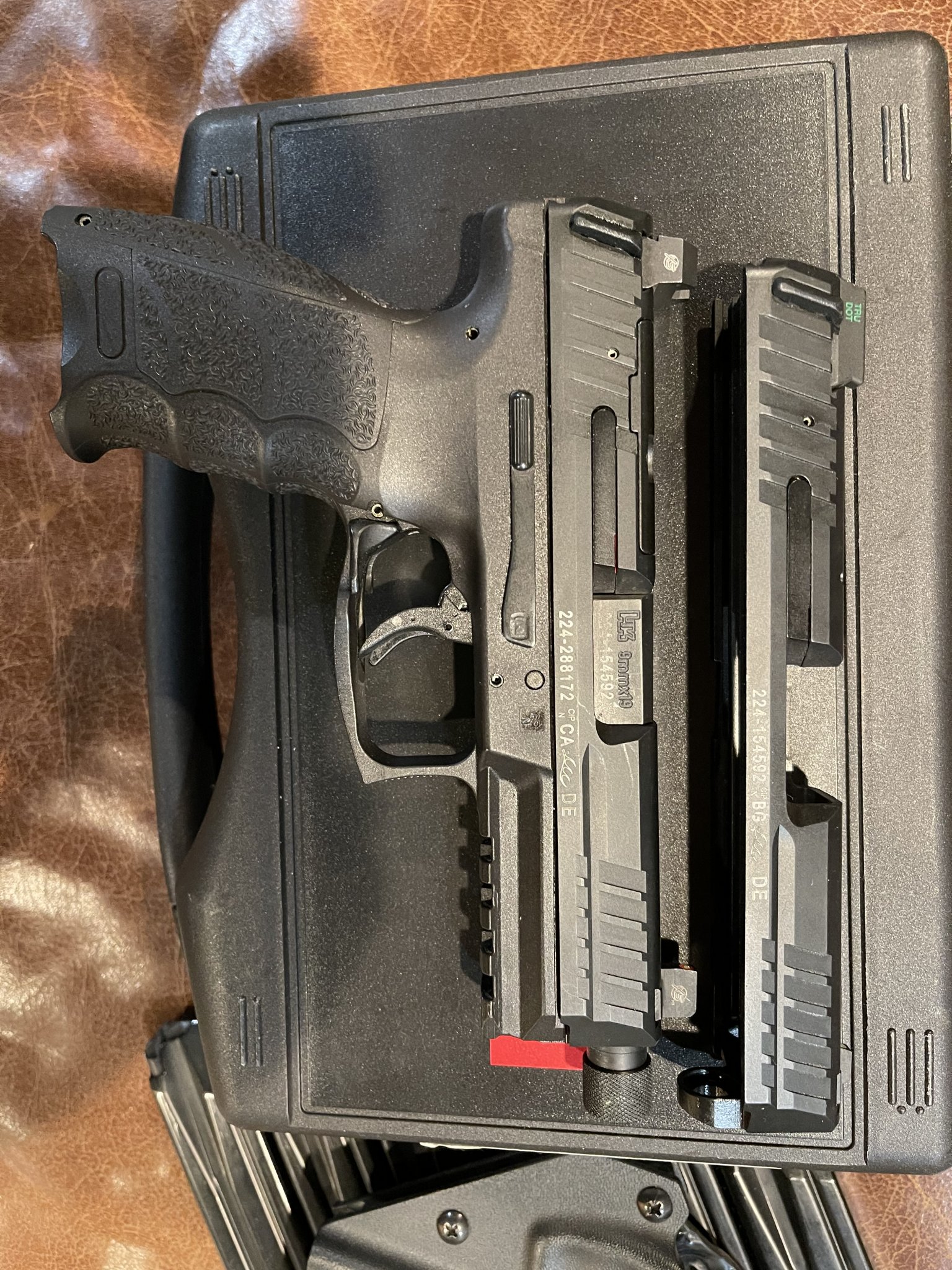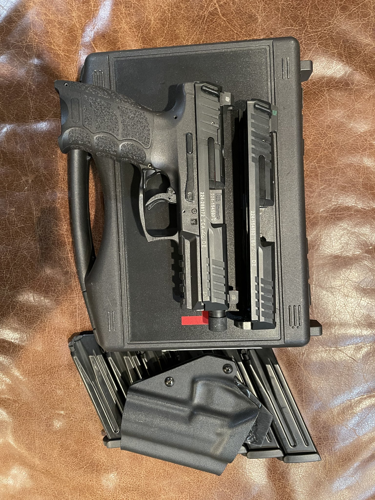 Consolidating the pistols and have an HK VP9T package up for sale. This includes two slides, a VP9T slide with night sights and a VP9 optic ready slide with suppressor height XS night sights, 6 x 15 round mags, and a T-Rex Arms Ragnarok holster; as well as everything that came with it stock. The gun probably has 1000 rounds through it and the OR slide has never been shot (it does have a mark from a rivet on my jeans). Looking for 1075 shipped. Thanks!