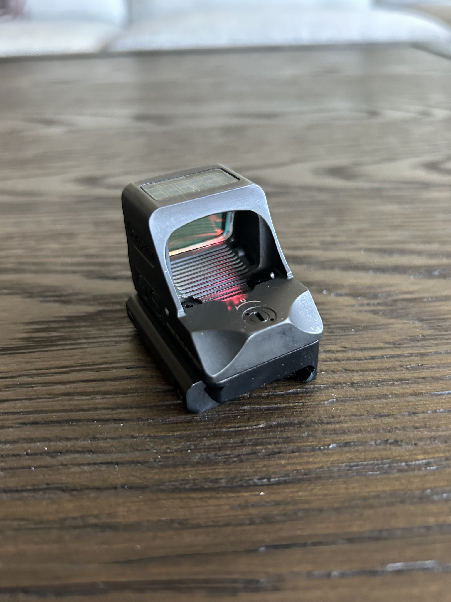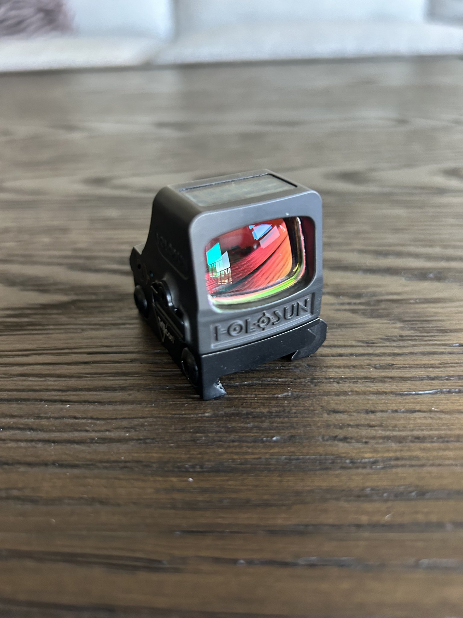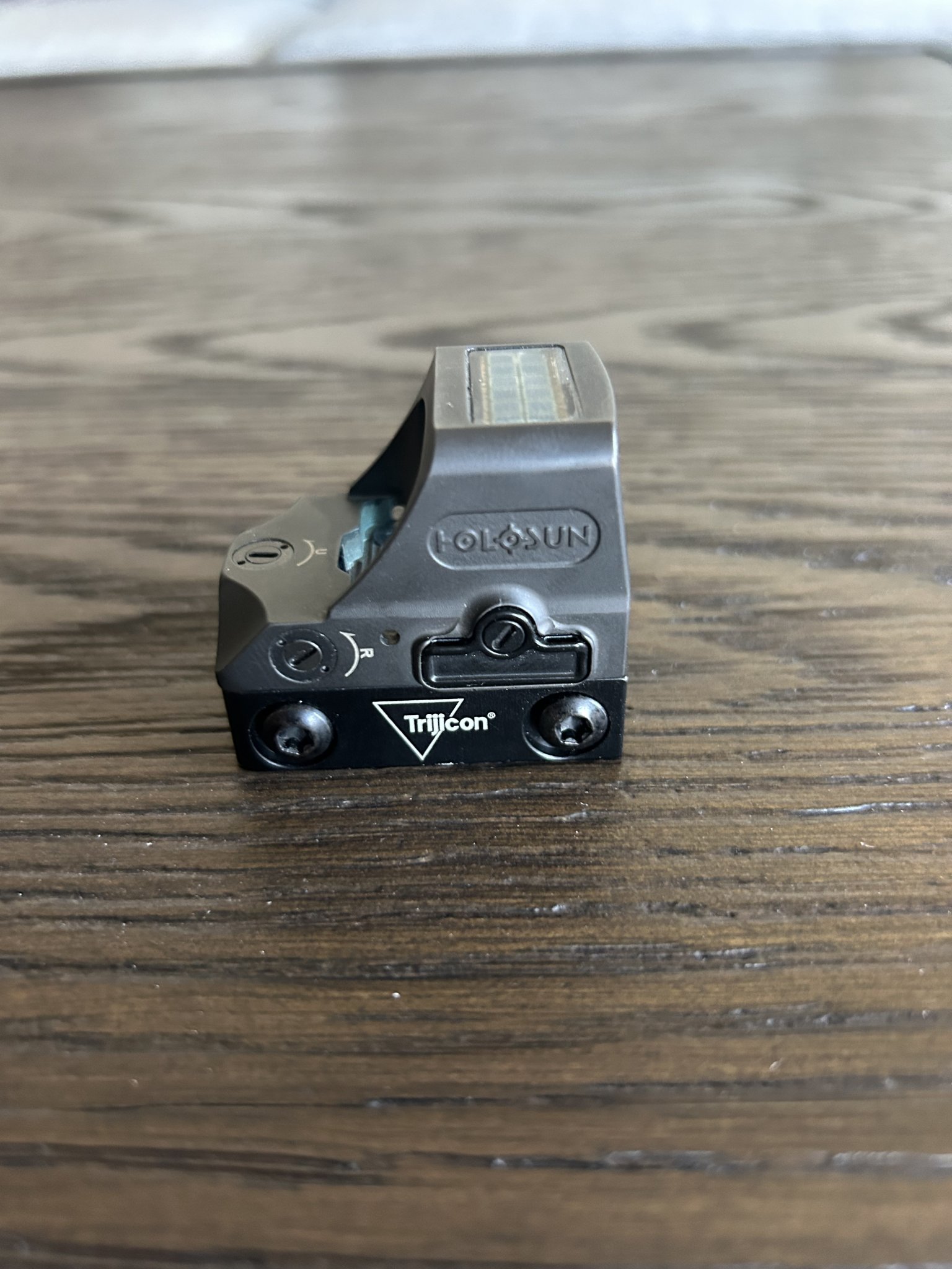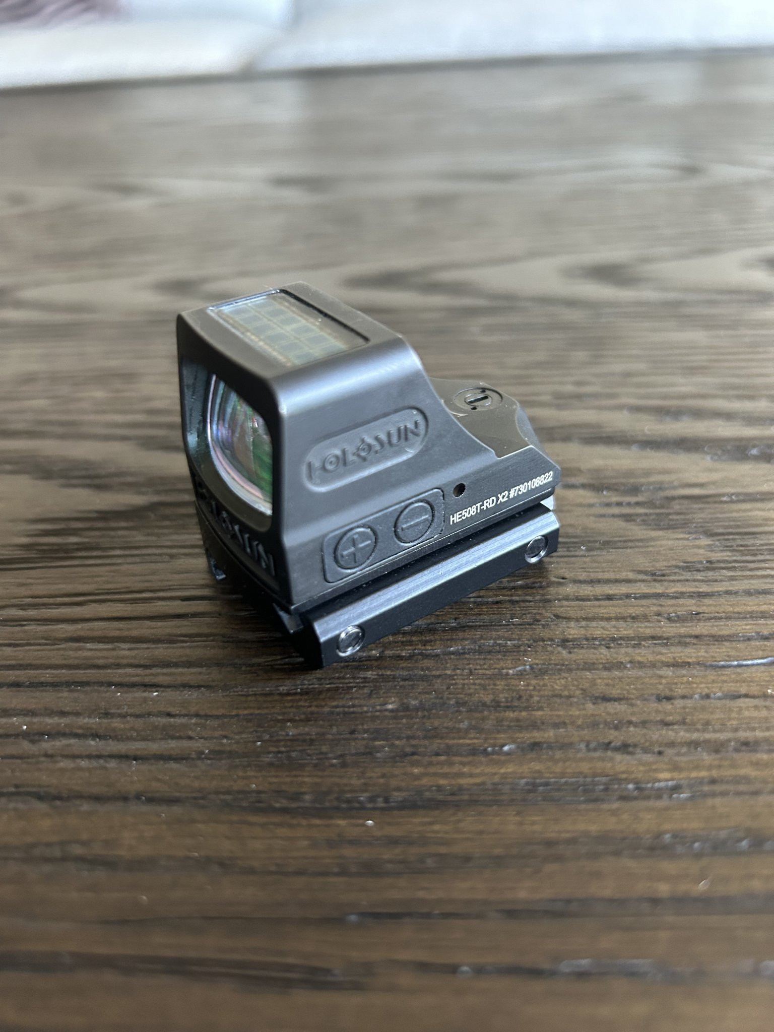 Holosun 508T mini red dot. Had it on a Volquartsen black mamba. Light usage. Works great. Uses the Trijicon RMR footprint. Comes with a pic rail mount and original box and paper work.