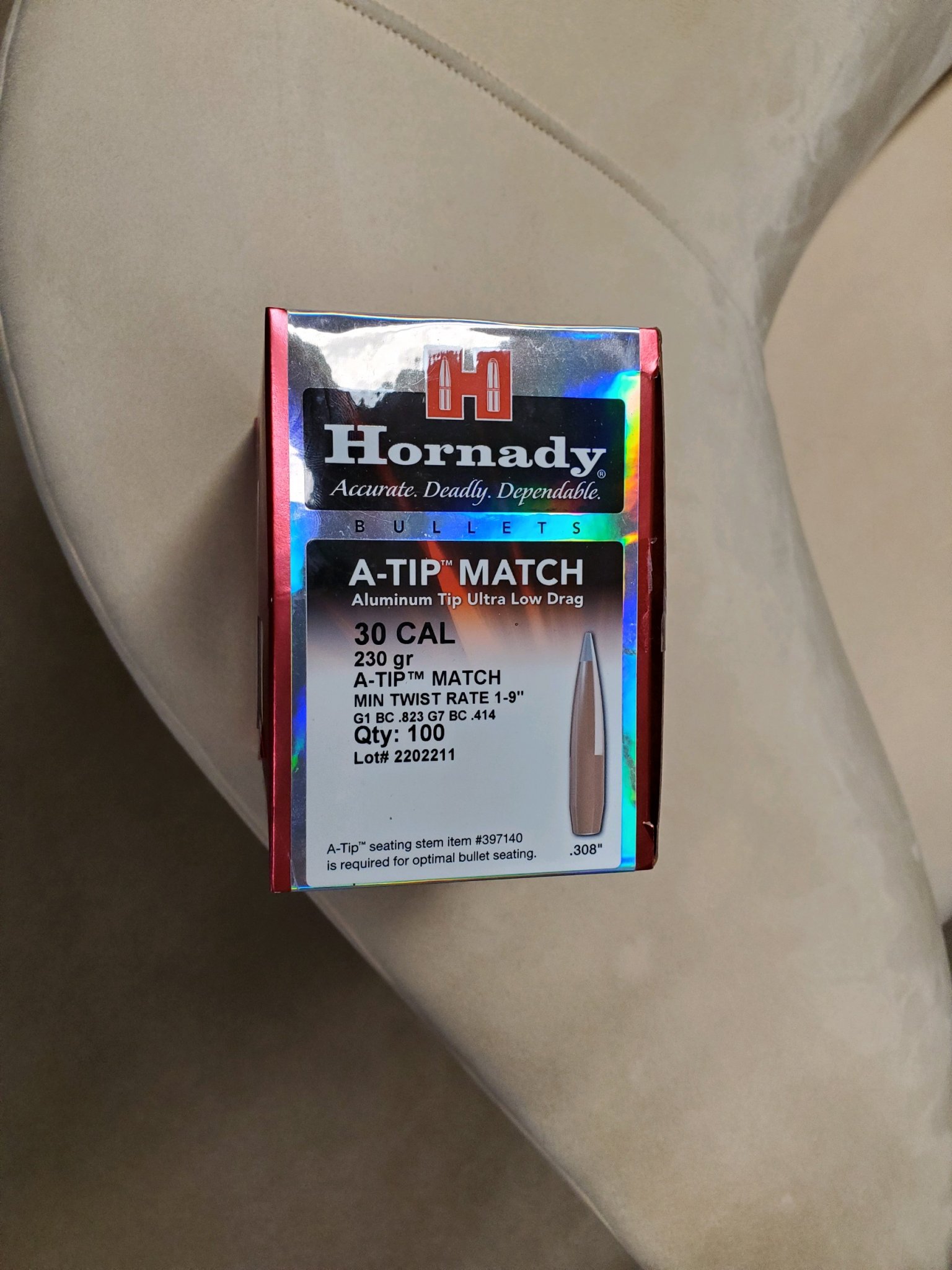 Three ( 3 ) boxes 100ct each unopened of the high bc (823 G1 414 G7 )30 caliber Hornady A-Tips item # 3091.. They are individually packed sequentially to production and are designed for 9 twist or faster barrels. $285 shipped lower 48.