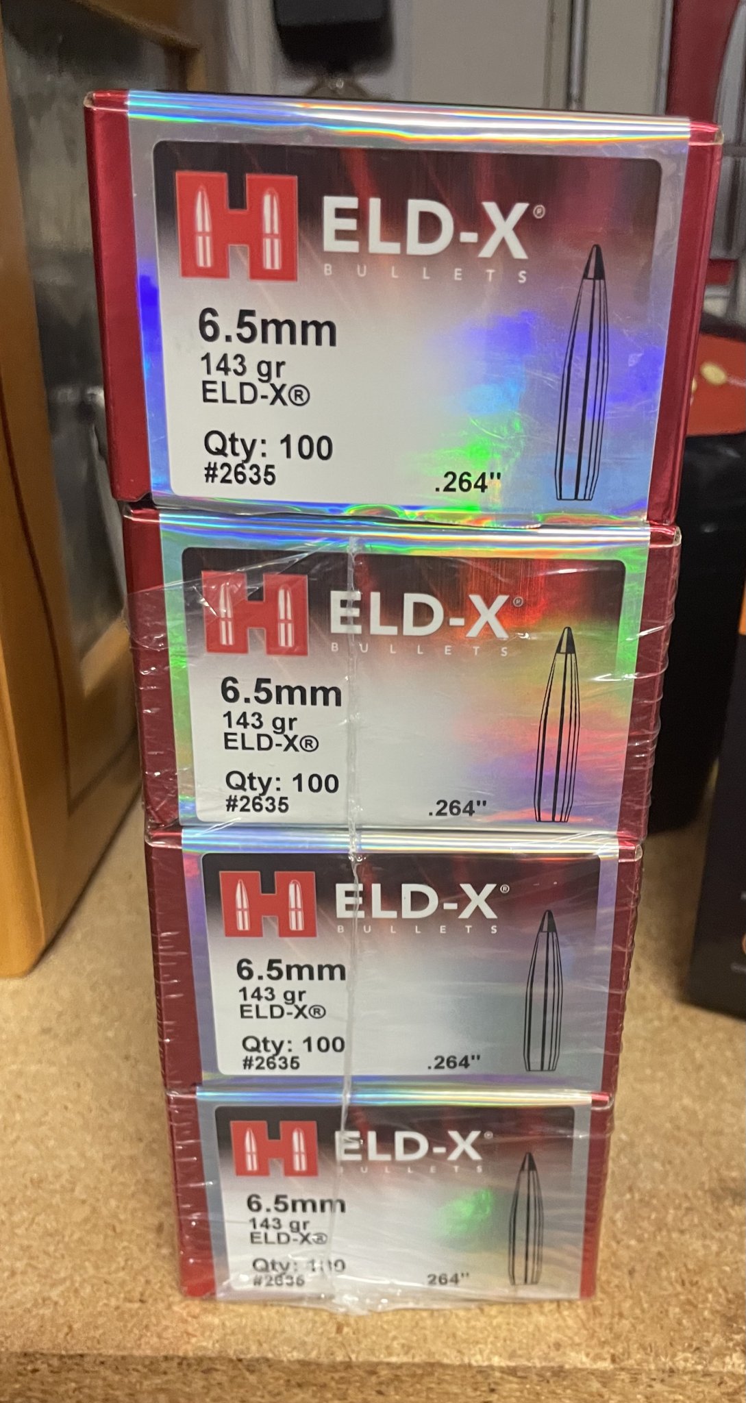 Selling 3 unopened and one box of 75 Hornady ELDX 6.5 143 grain bullets all the same lot. (375 total)
