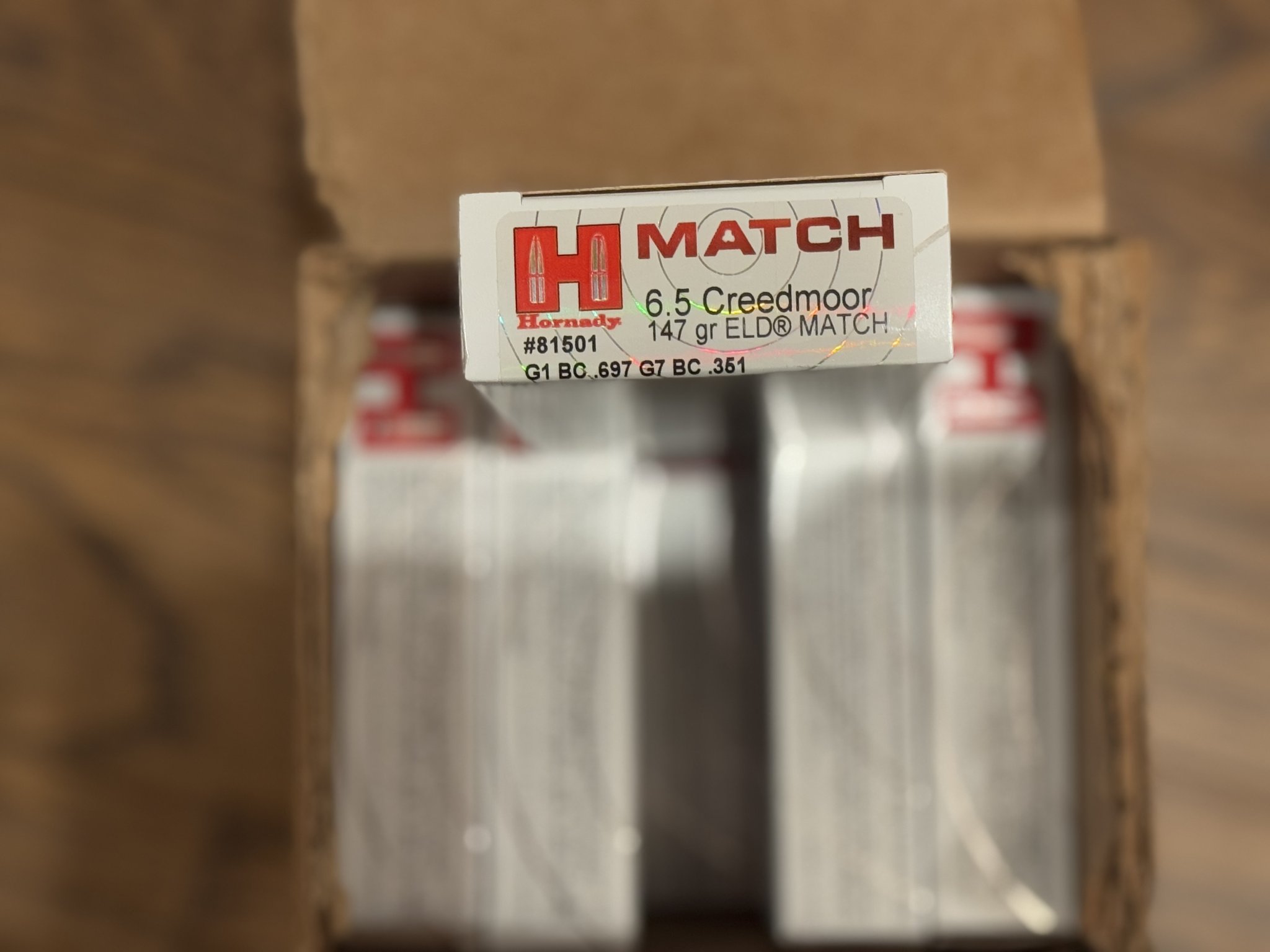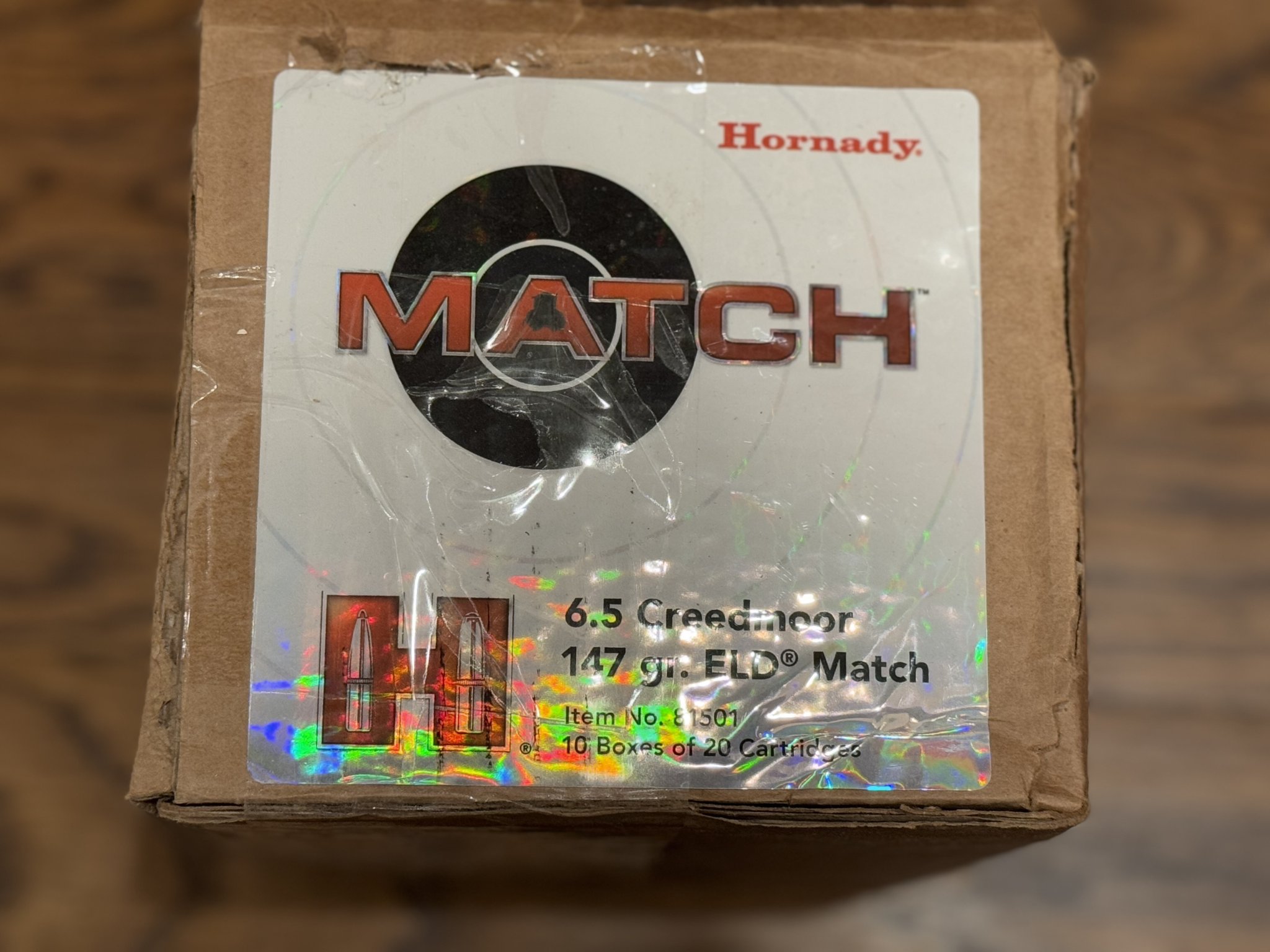 10 boxes of Hornady 6.5 Creedmore 147 gr ELD Match ammo. Brand new in boxes. $230. I shoot 6.5 PRC and accidentally ordered 6.5 Creedmoor.
