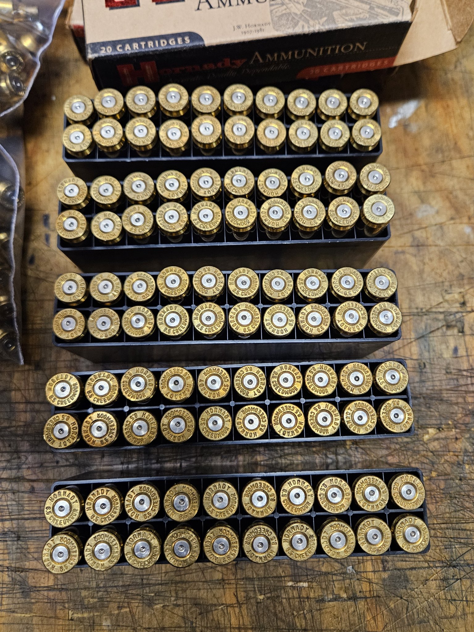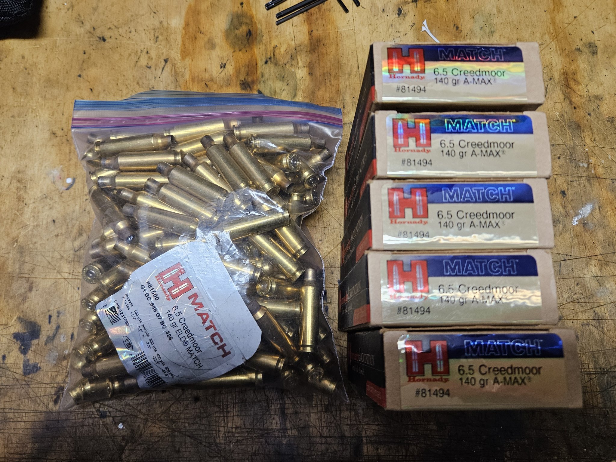 Hornady 6.5CM once fired, 220+ count. Since it will go in a med flat rate, will keep the boxed stuff intact.