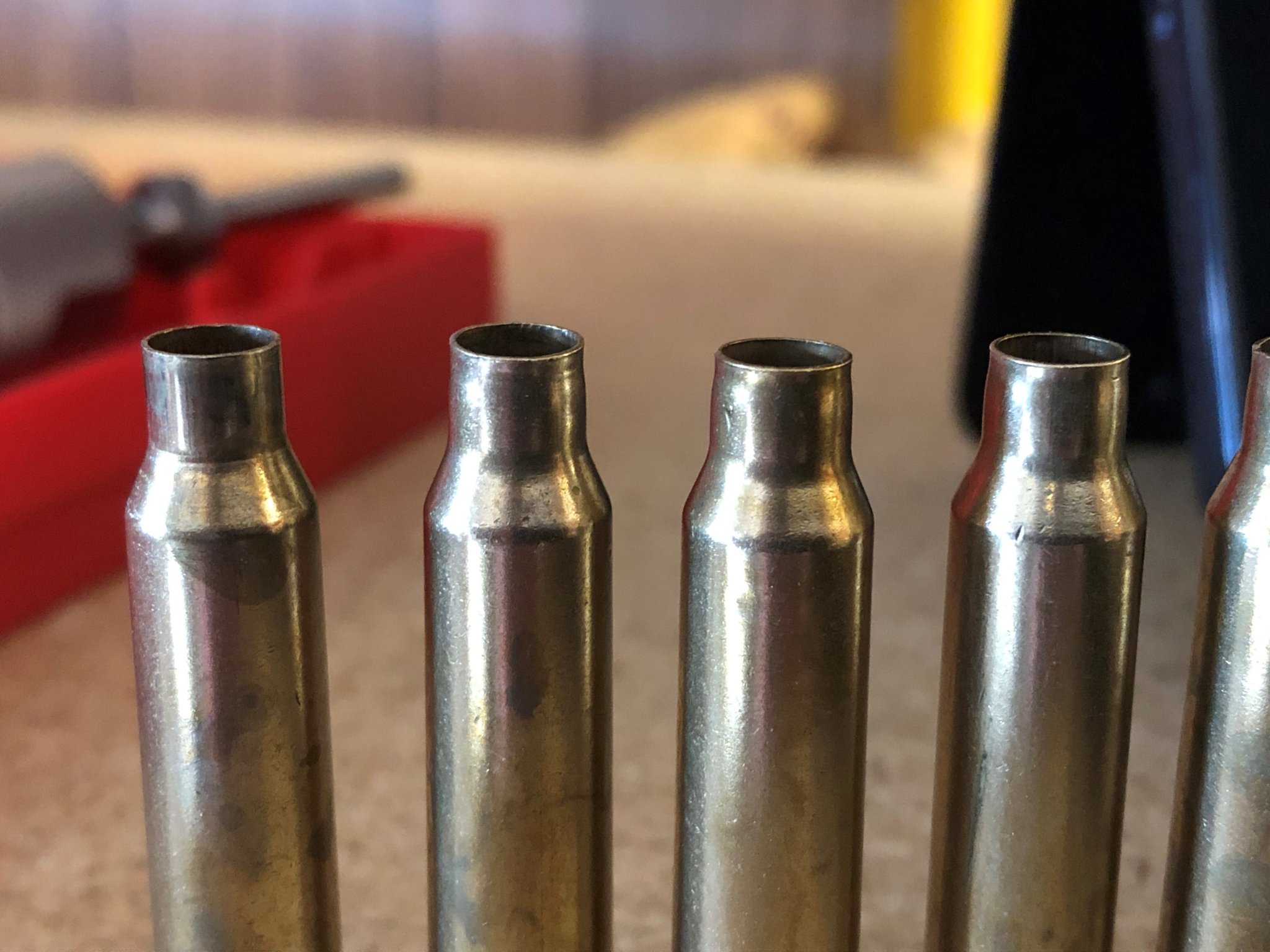The shell on the far left is Sized on the single stage, the remaining 3 are with the die set as low as possible.