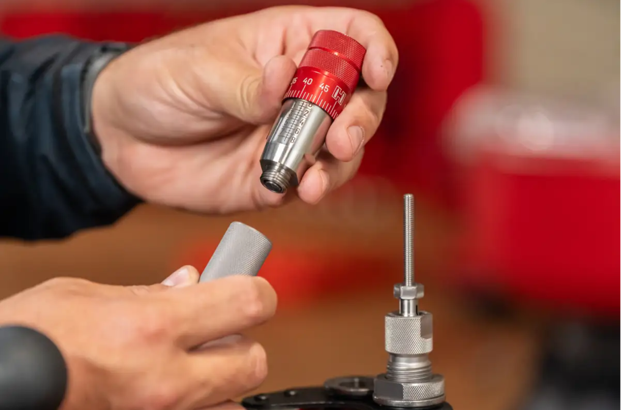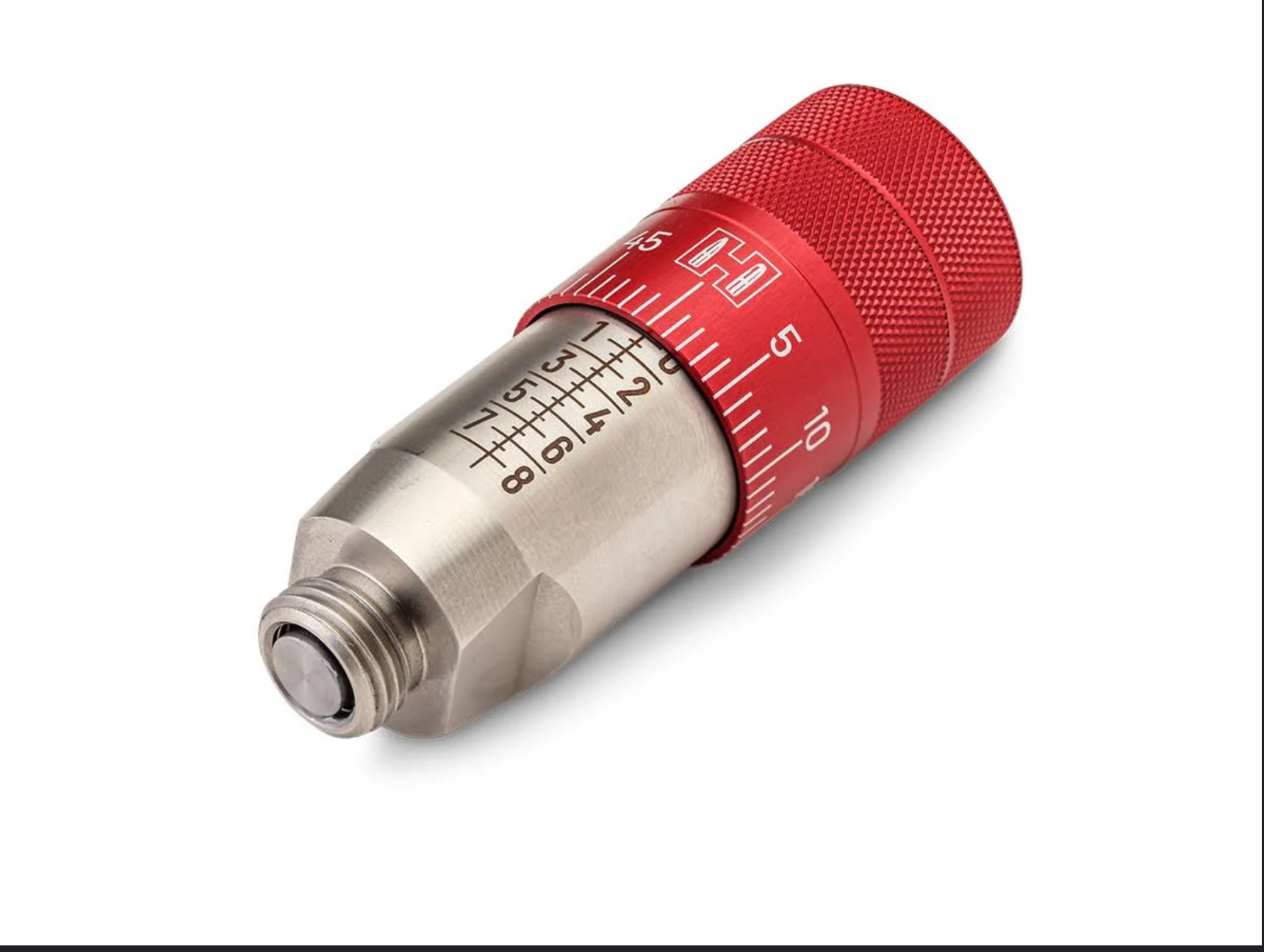 I bought the basic one (Custom Grade) that doesn’t have that steel-colored micrometer tool included (that must be the Match Grade). The Custom Grade allows you to remove the head (no micrometer) and install this fancy red micrometer.