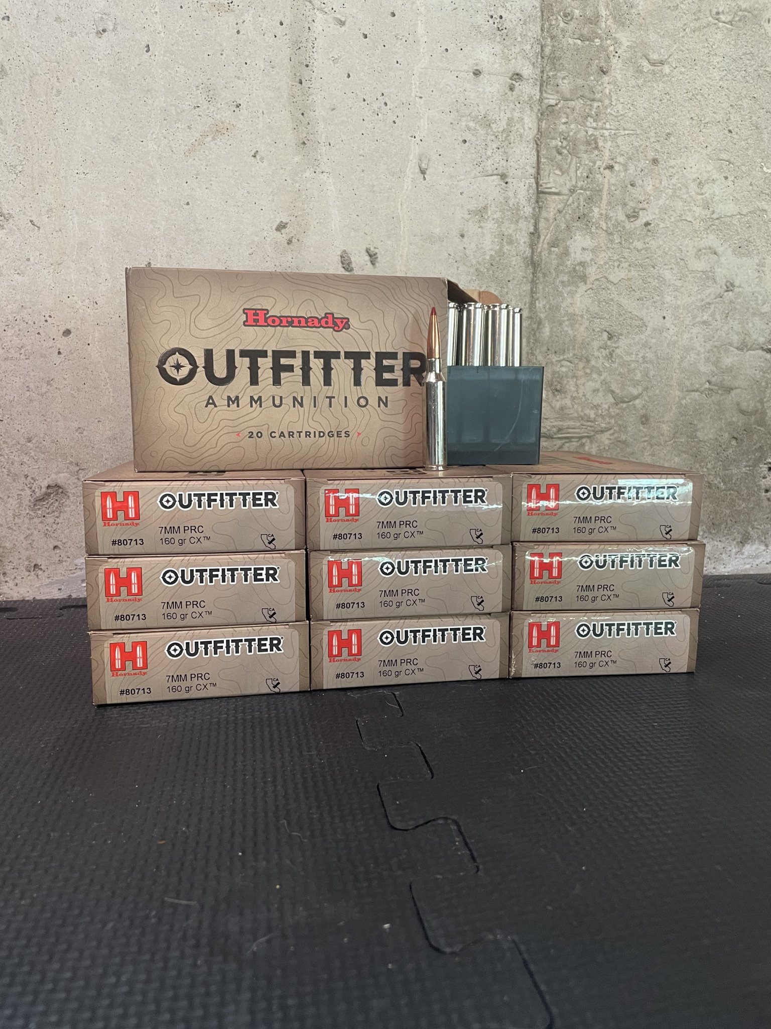 Putting up 160 rounds of factory 7PRC Hornady Outfitter loaded with the 160CX. All 8 boxes are from the same lot/case. Will also toss in the other 40 spent cases from the 200rd case. Asking $360 shipped OBO.