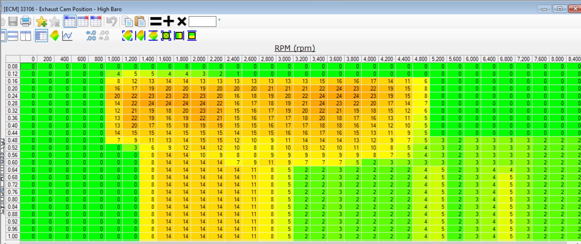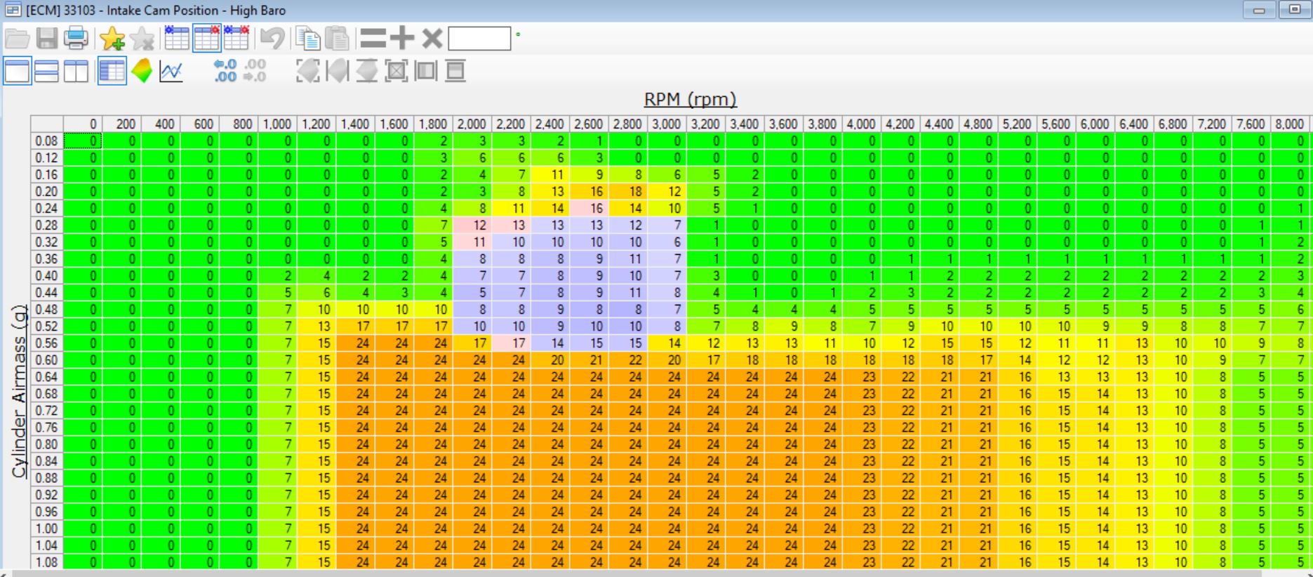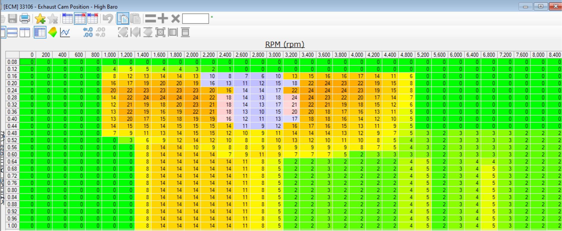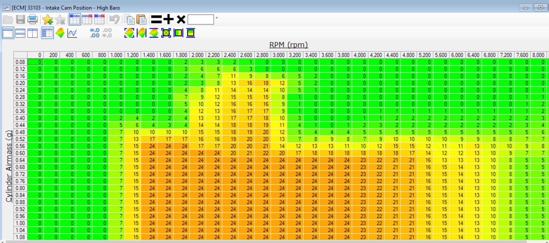 There's something obviously weird going on around 2000-3000 RPM and 0.28-0.52 g of cylinder airmass. This represents an engine load of about 35-70% load at that point in the rev range, so this is an area that's frequently visited in normal driving. I'm not sure what the reason is for this calibration, but I suspect it's done as a poor man's Miller cycle, where the intake valve is held open longer than normal in order to decrease cylinder pressure. It's also possible that this is done to reduce overlap in this range of operation, although that makes less sense.