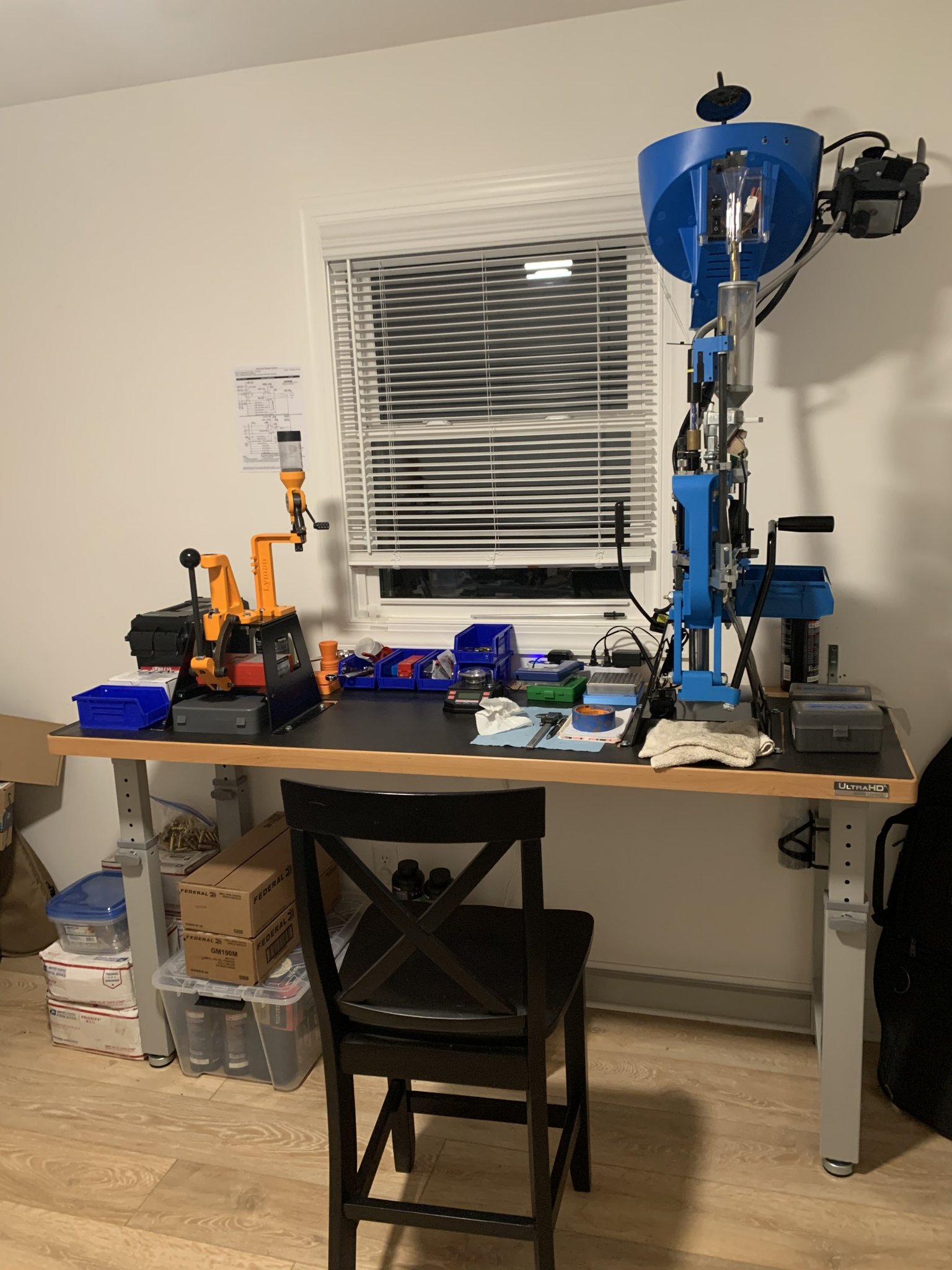 I used regular cabinet bases for mine... then the top is 4 ply 9/16 inch plywood, screwed and glued from the bottom, trimmed around the outer edges, sanded and coated. Most of my reloading is done from the standing position. Forster Coax on an inline mount, RCBS Rock Chucker on an inline mount, Dillon 1050s are on the low mounts. I still need a stool to check issues inside the case feeder, but I can pour brass in there and bullets in the Mr. BF.