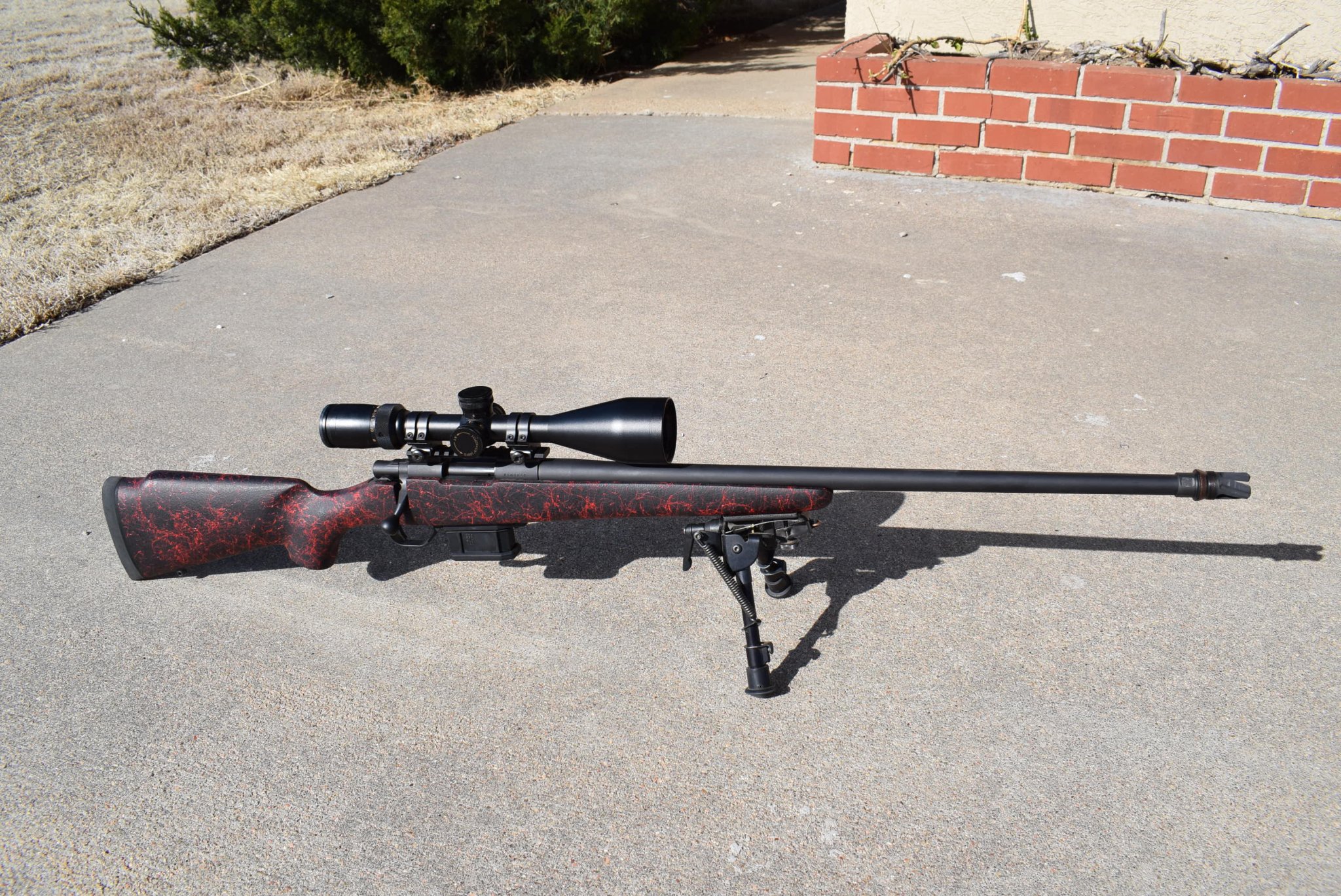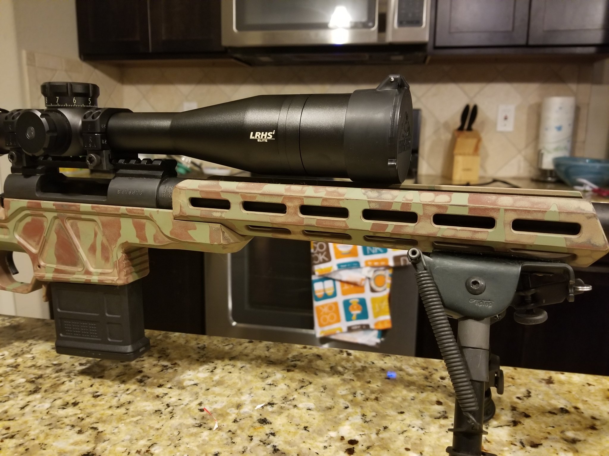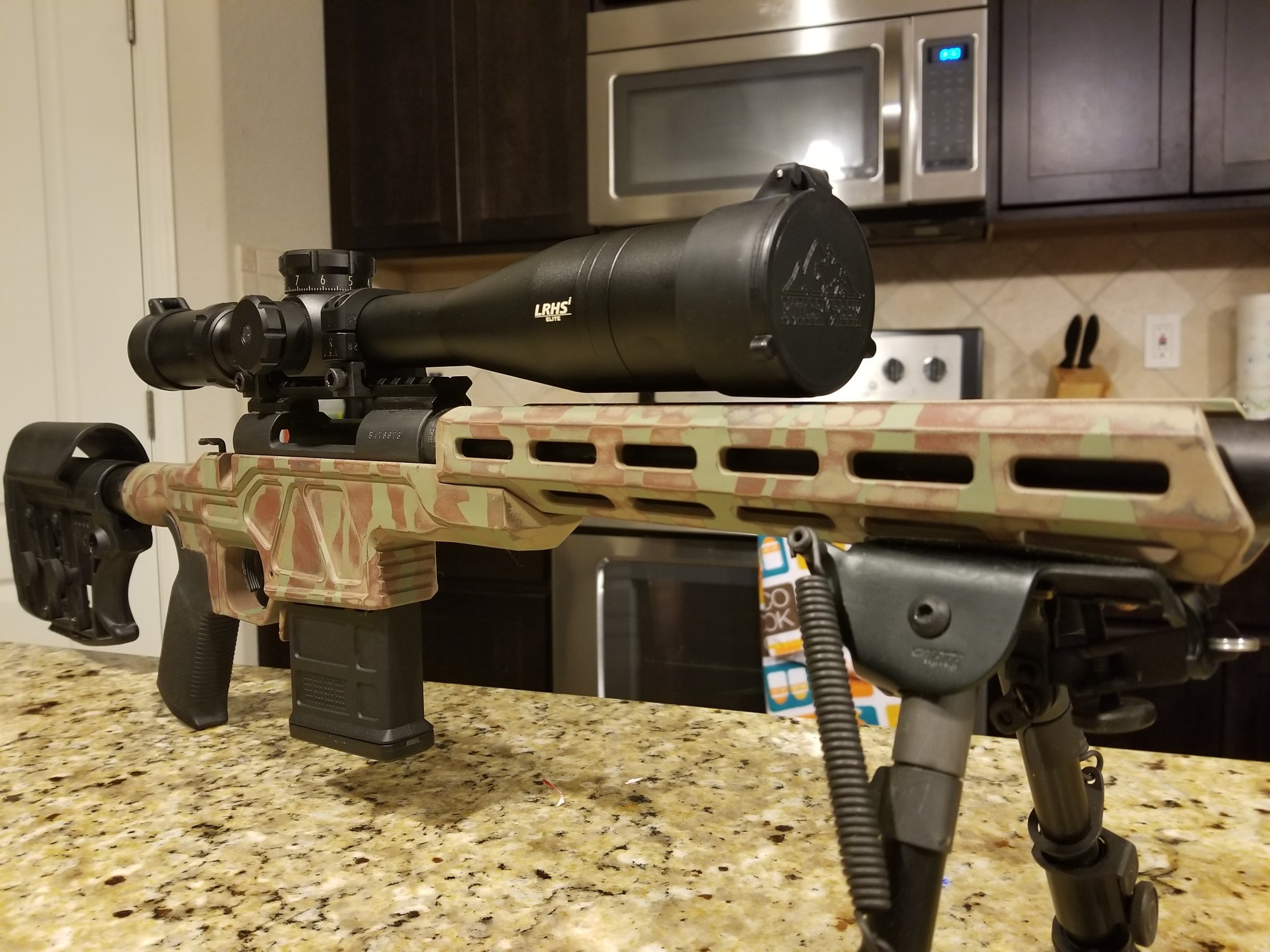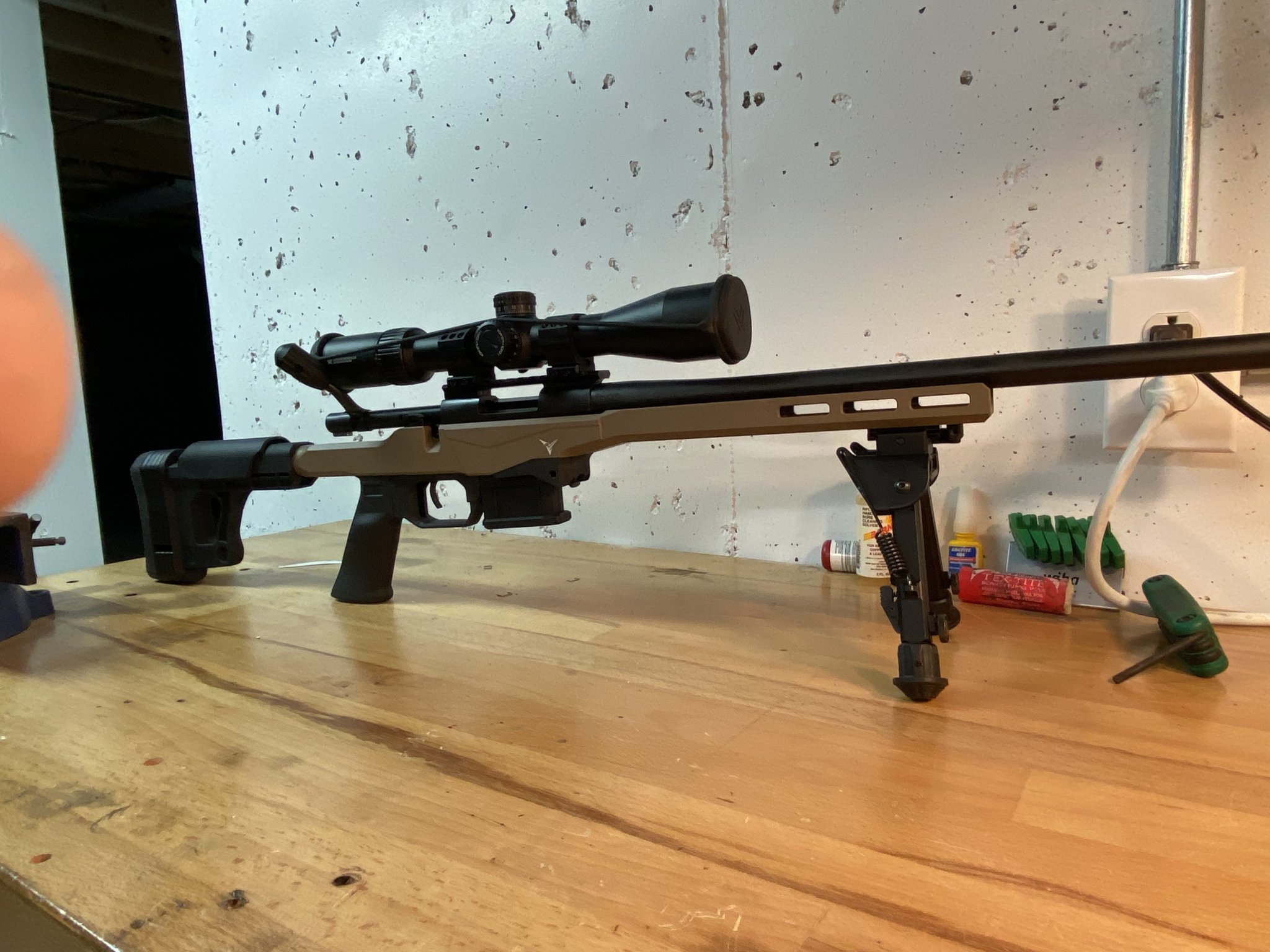 I have a weatherby vanguard 300winmag action that will live in an MDT LSS-XL. It's the 26 inch sporter barrel, I had a compact brake fitted, so we will see how that goes. 40MOA rail, 4.5-27 power 50mm objective scopes will have a little bit of wiggle room for 100 yard zero and should allow holdover for a mile. Vertical grip and a few spare magazines. I'm curious to see how far out I can seat the heavy projectiles, factory rounds leave a lot of space in the magazines.