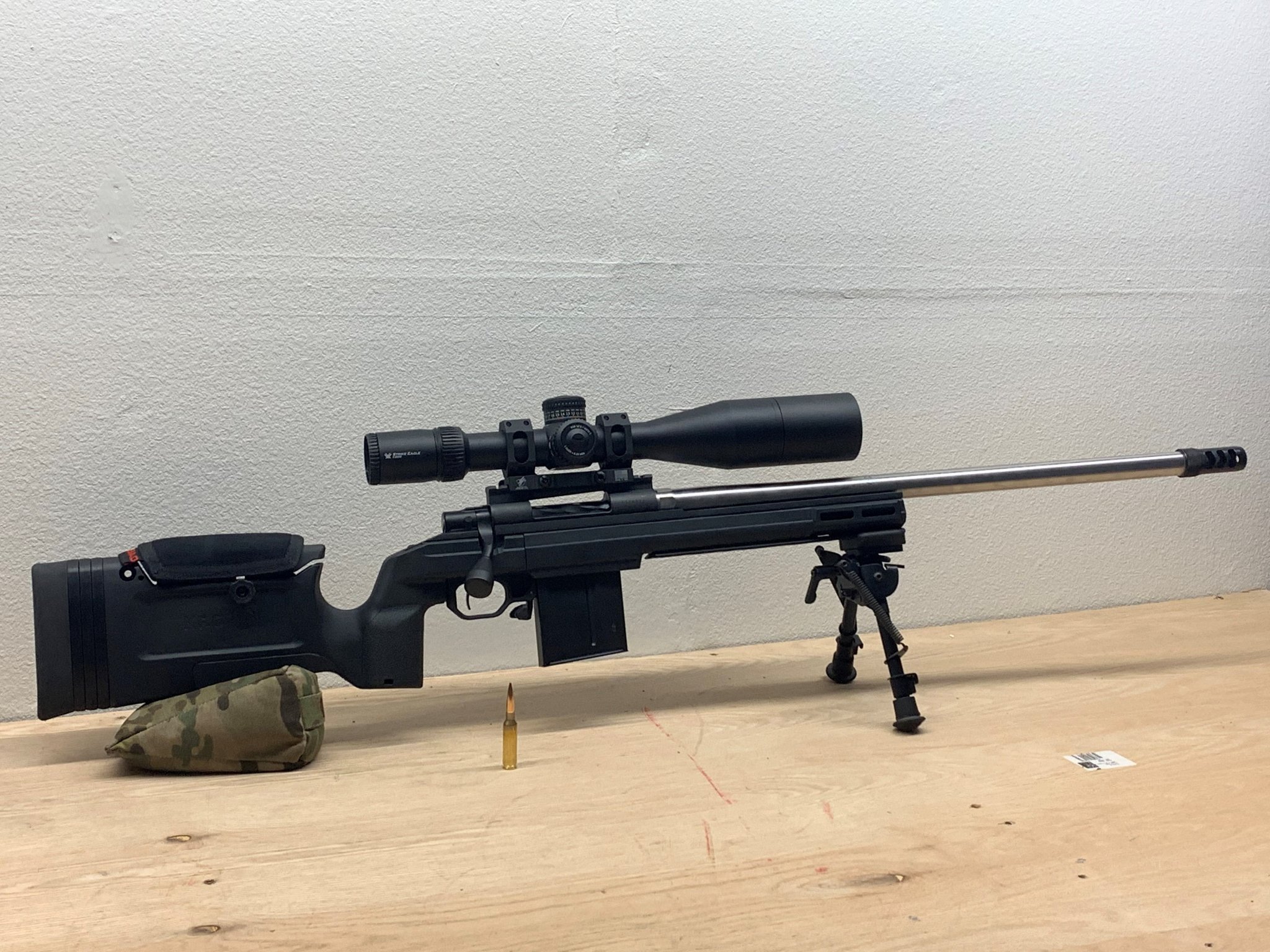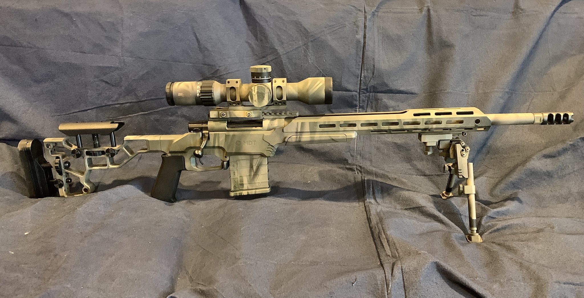 Heavy threaded barrel with an SRT Shadow XL can, ESS chassis with GG&G bipod, AMD QR on an MDT 20 rail with the Brownells 5-25 MPO.