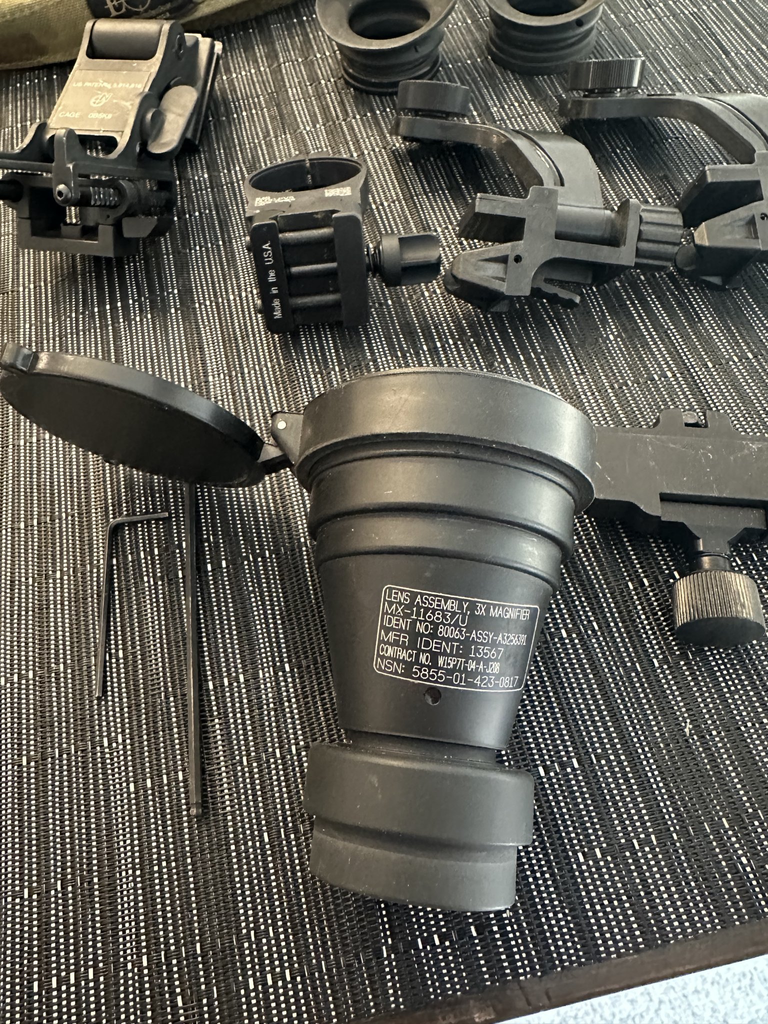 Fourth item custom made PVS14 IR filters and purple filters that screw into the ocular side of the 14 to change the color for enhanced visibility. The IR filters are the good ones that are milspec they typically go on the other side of the 14 for laser protection. If flipped to the ocular side it changes the Green phos to a grey color that I personally prefer..see pic