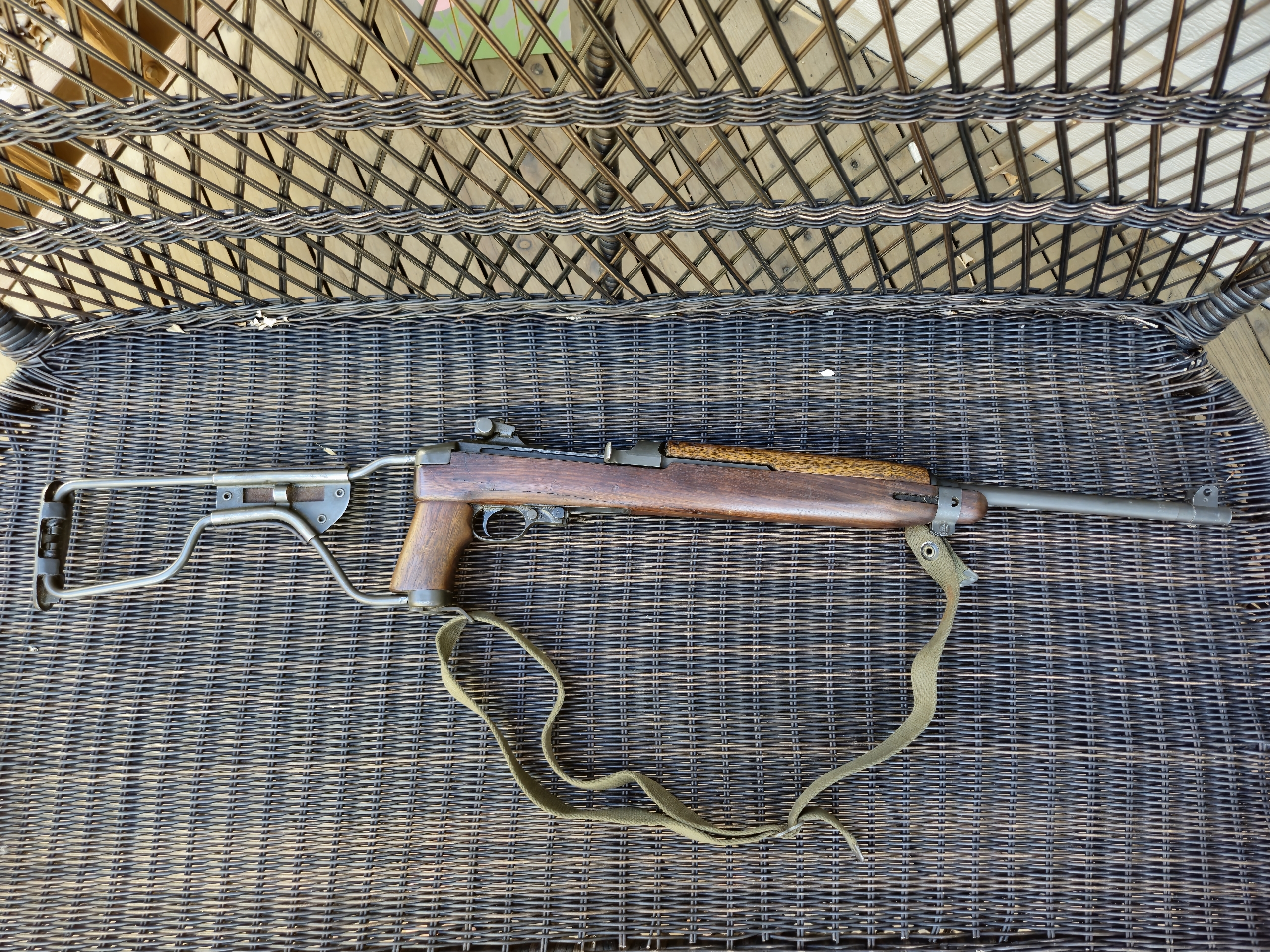Authentic M1A1 paratrooper carbine. Made by the Inland division of General Motors in 1944. The carbine was brought back to the USA by a paratrooper named Logan Weir. Logan Valentine Weir was a distinguished World War II veteran who served as a paratrooper in the U.S. Army’s 11th Airborne Division. Born on June 29, 1914, in Sterling, Colorado. During the war, Weir’s role as a paratrooper placed him among the elite troops trained for airborne operations, which were crucial in the Pacific Theater. The 11th Airborne Division was instrumental in campaigns in the Philippines and later in the occupation of Japan.