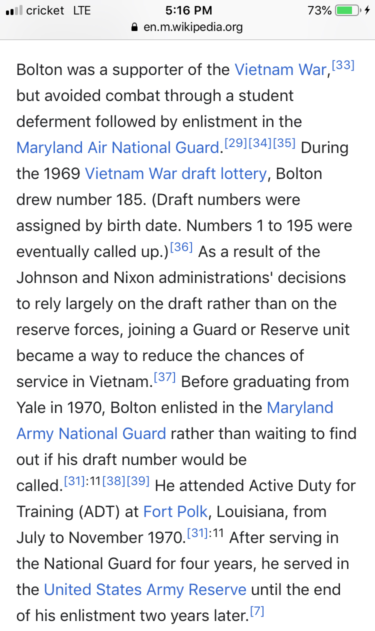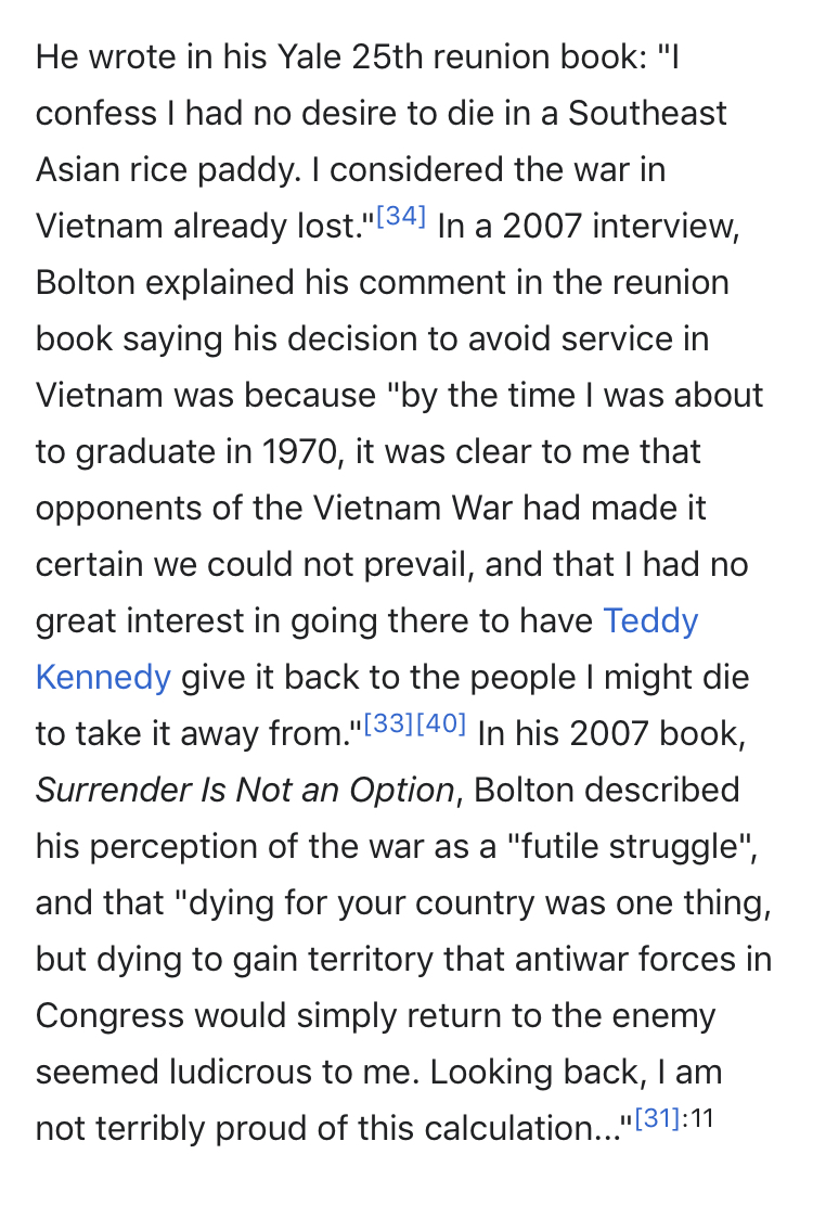 So Bolton, a man who had never heard the terrifying sound of incoming fire, joined the National Guard to avoid getting drafted, Is all about waging war when his ass is not on the line.