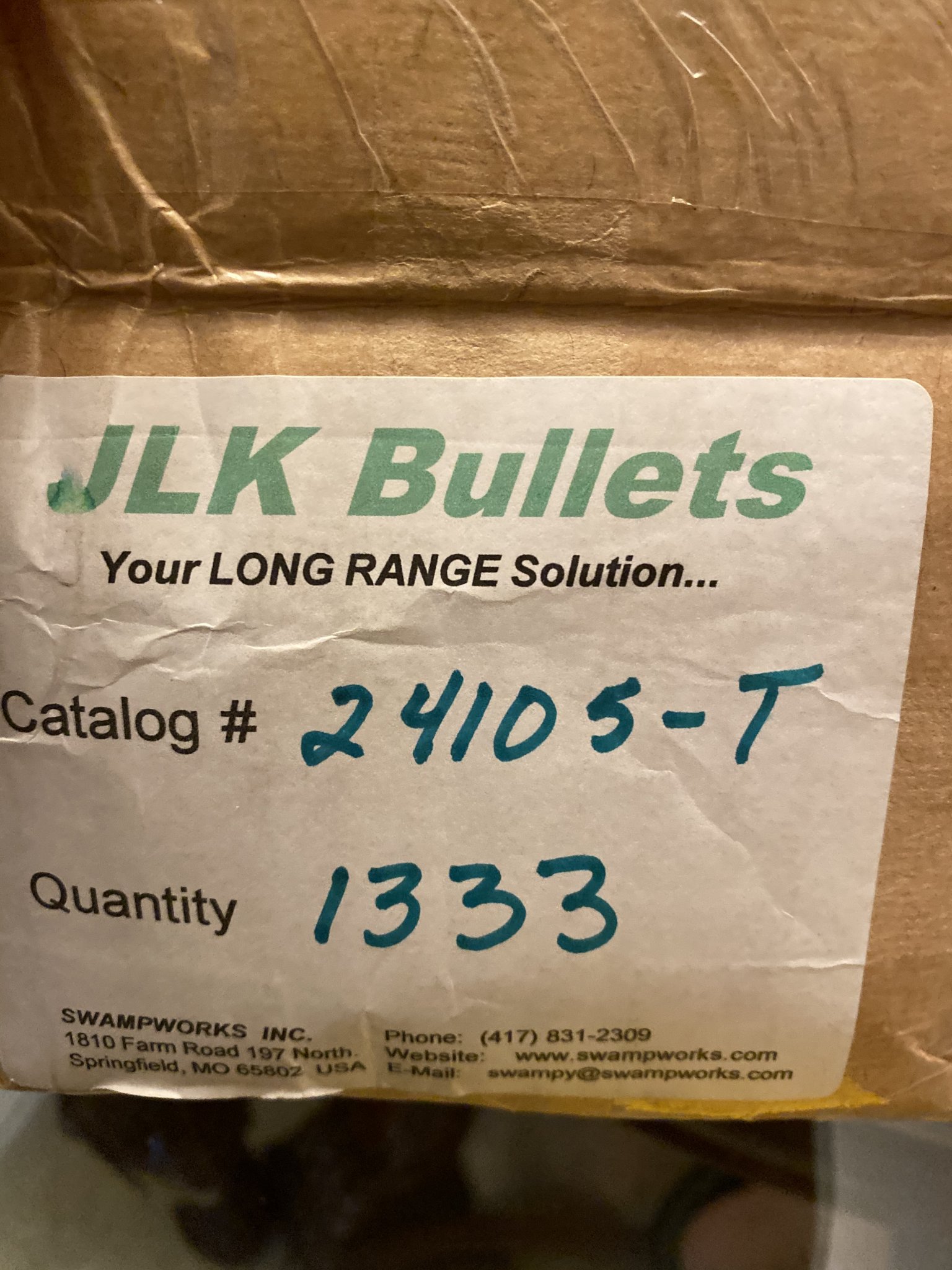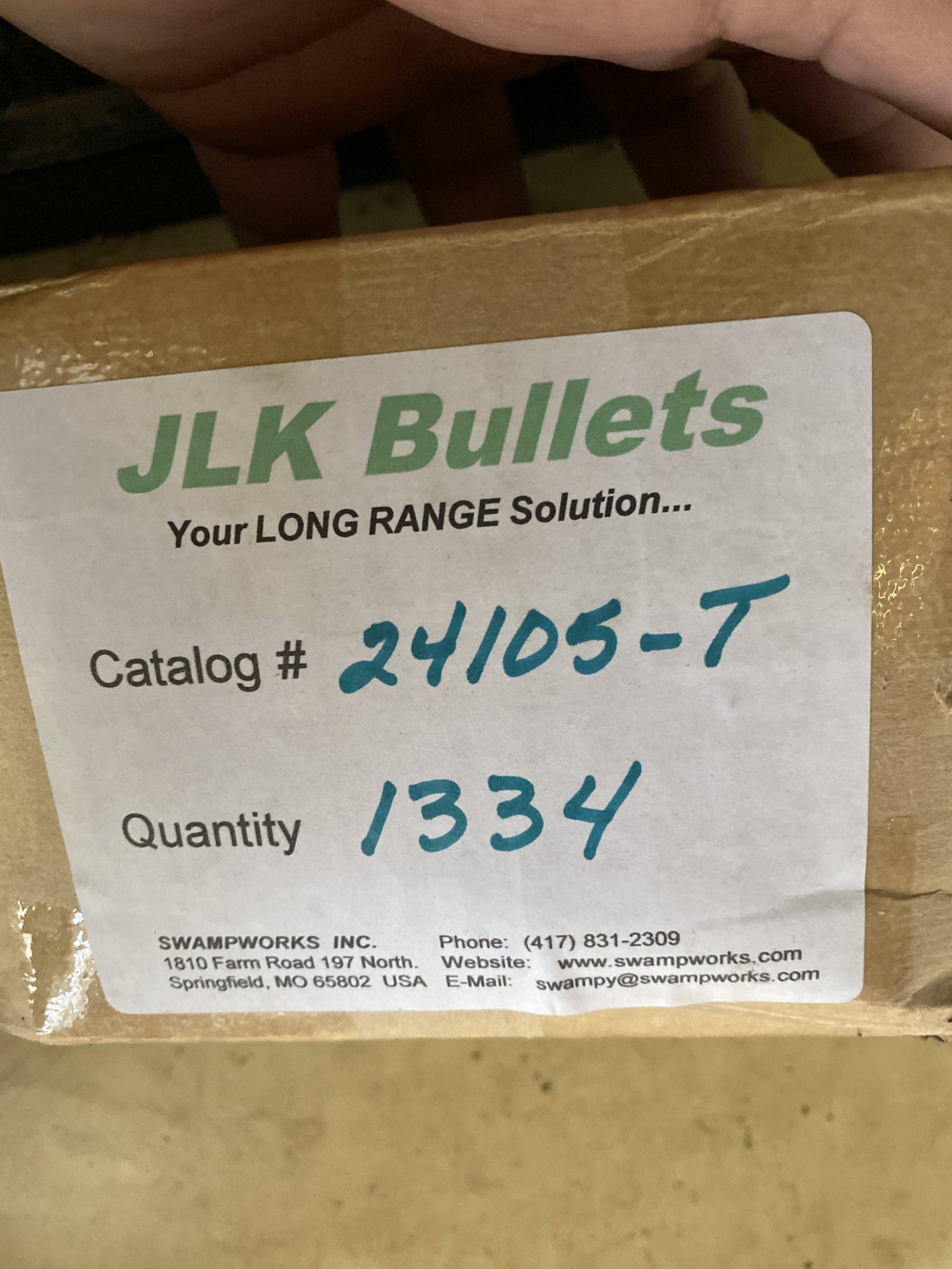 I have from the same lot 1800 pointed 105gr JLK, Swampworks. 1 box is sealed from JLK with 1334, other is open (same lot) with 466 bull