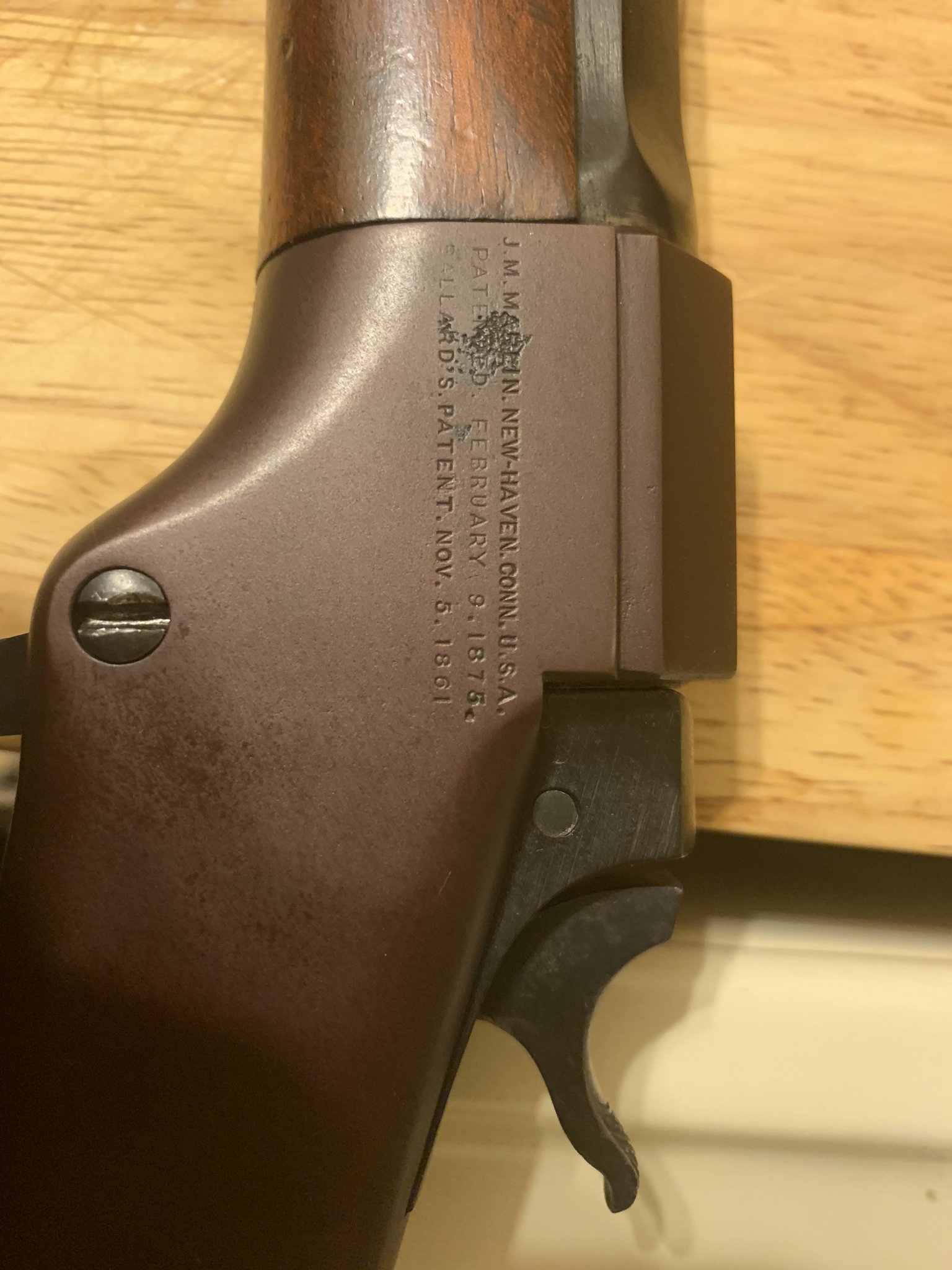 The first one is a JM Marlin .32 caliber single shot breach lock. That opens with a lever. serial #7402. It has a 25" octagonal barrel.