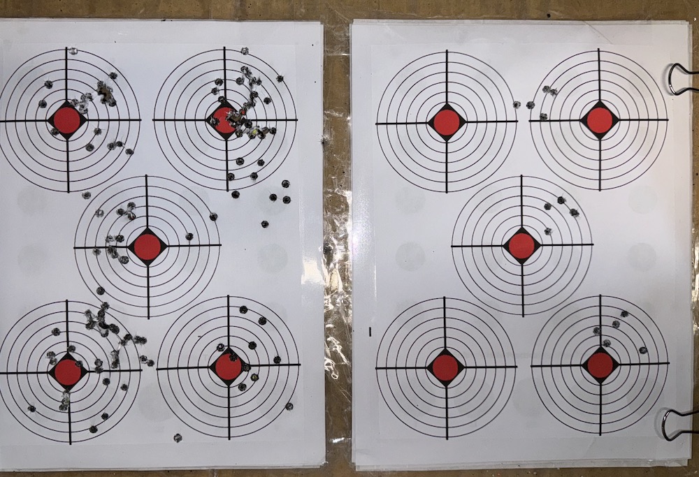 I've tested probably at least. a dozen lots of SK LR, and the others end up looking like the target on the left. No idea what drives it, my only wild guess is that the gun is ridiculously picky on pressure/velocity to feed without damaging the bullets or bolt bouncing perhaps. If it was bolt bounce though you'd think softer loads would do better. I can't think of any other reason to see that much accuracy variation from lot to lot of the same ammo and it being this hard to find a lot/brand it likes. I see lot to lot variations in my CZ 457 or Volquartsen/10/22s, but it's much much smaller, once and awhile you get a horrible lot, but most lots of the better ammo shoot pretty similar. Also the lot based flyers are usually velocity related so you still get pretty good L/R groups just vertical flyers, but the JP tosses flyers everywhere. It's also not that this "unicorn" lot is just amazing in general cause it's just middle of the pack in my 457 for SK LR lots I've tested. In the past I've thought about trying different recoil spring rates to see if it impacted things, but honestly I just find the gun frustrating to shoot.
