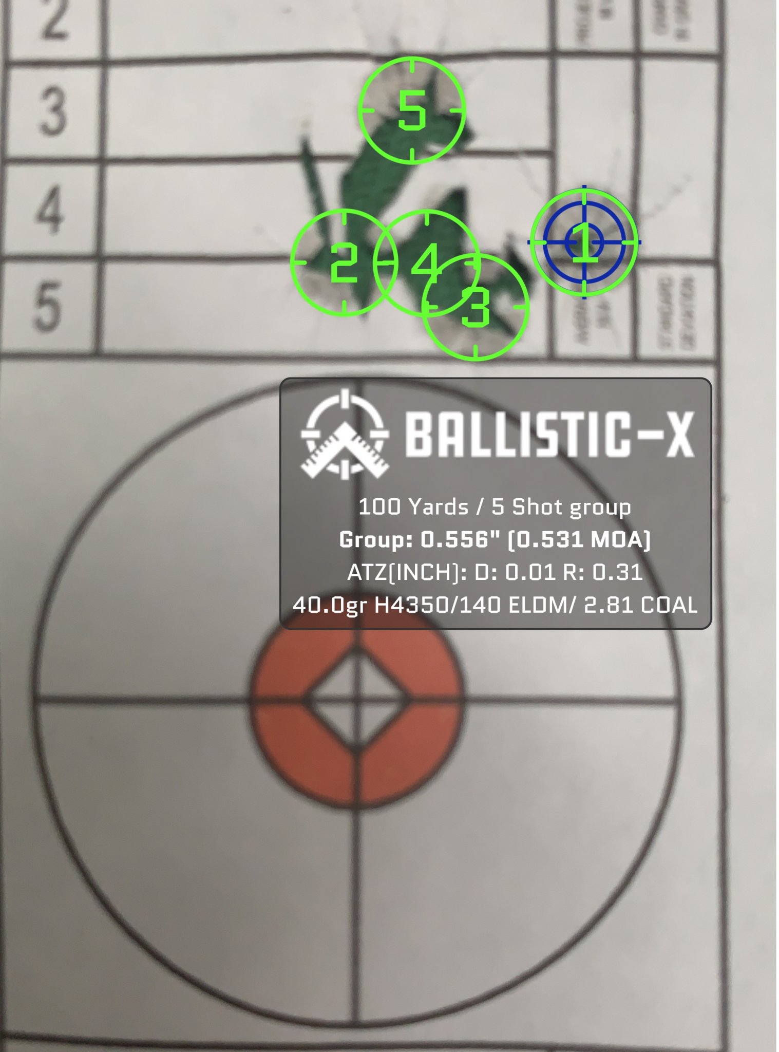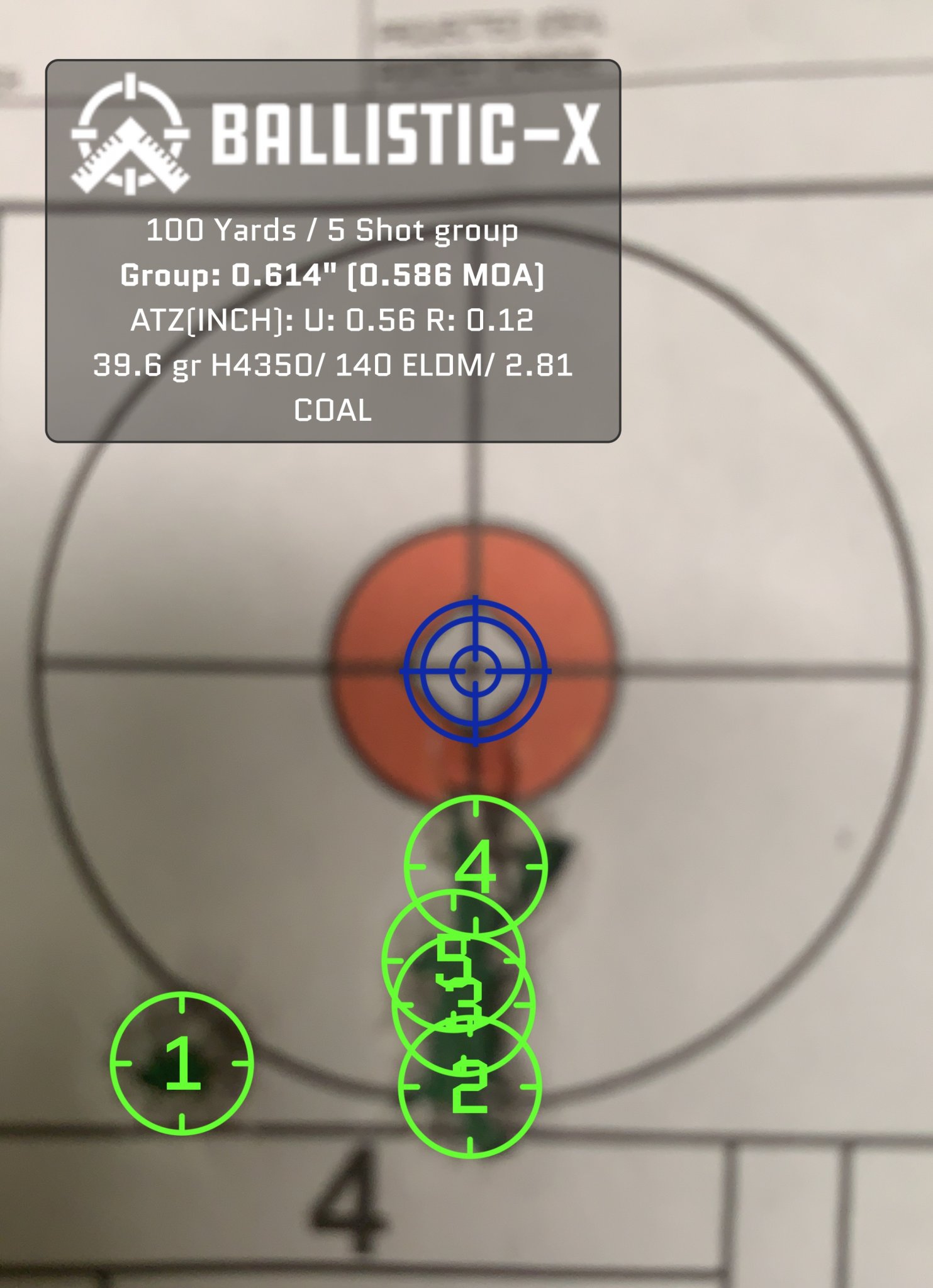 The 3 groups I will post here are of 39.6 grains H4350, 39.8 gr, and 40.0 gr. These are the 3 groups of 5 from today that shot the best. The 39.8 grain group I left the 5th shot unmeasured Bc I pulled the shot and may or may not have let out a few cuss words before the scope completely settled. Still showed promise and measured around .800 with the pulled shot measured.