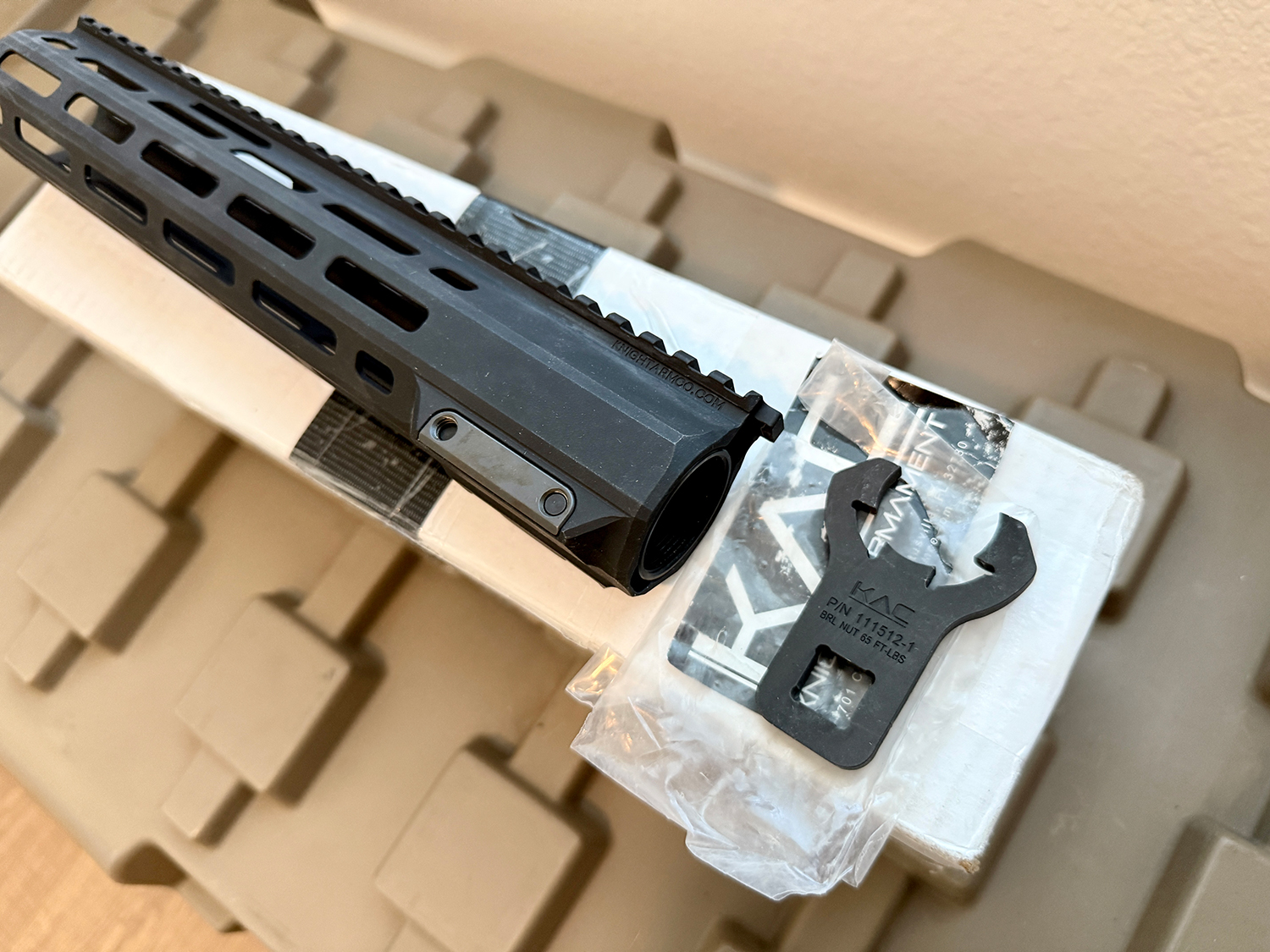New in box KAC FF RAS 5 10.75" (P/N: 118234-1). The rail is brand new and comes as shown with the appropriate KAC barrel nut wrench.