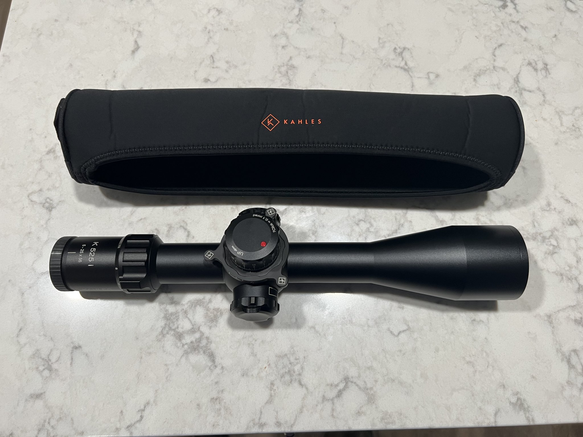Great condition Kahles 525i with LSW and the SKMR3 reticle. No ring marks or scratches. Comes with a Kahles Paralax spinner and Kahles soft cover. No box