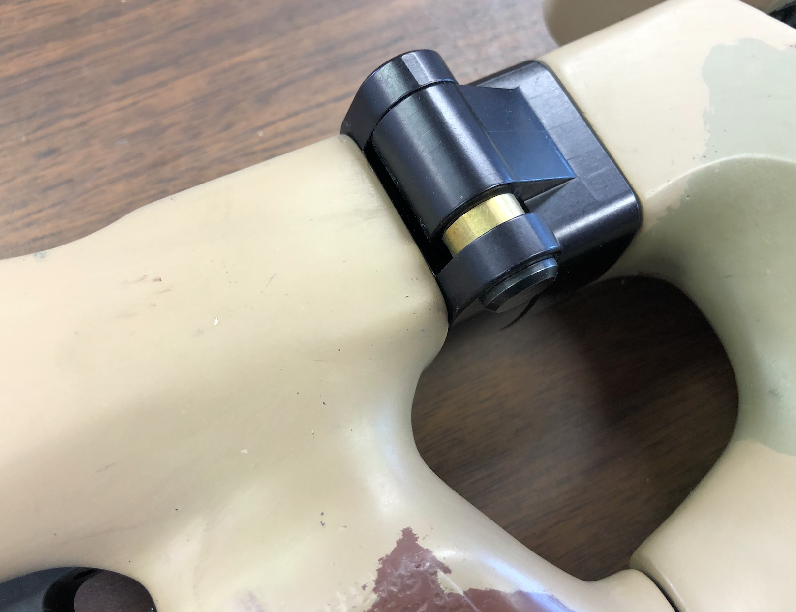 Looks like the original design was to have some kind of pin, or rod go through the top of the stock (it had a centered mark that corresponds to where the hinge hole will be). That way it'll be permanent and not have any way to slip out. I'm trying to decide if I will use a threaded bolt, or a smooth rod to hold it. Either way, it shouldn't go anywhere.