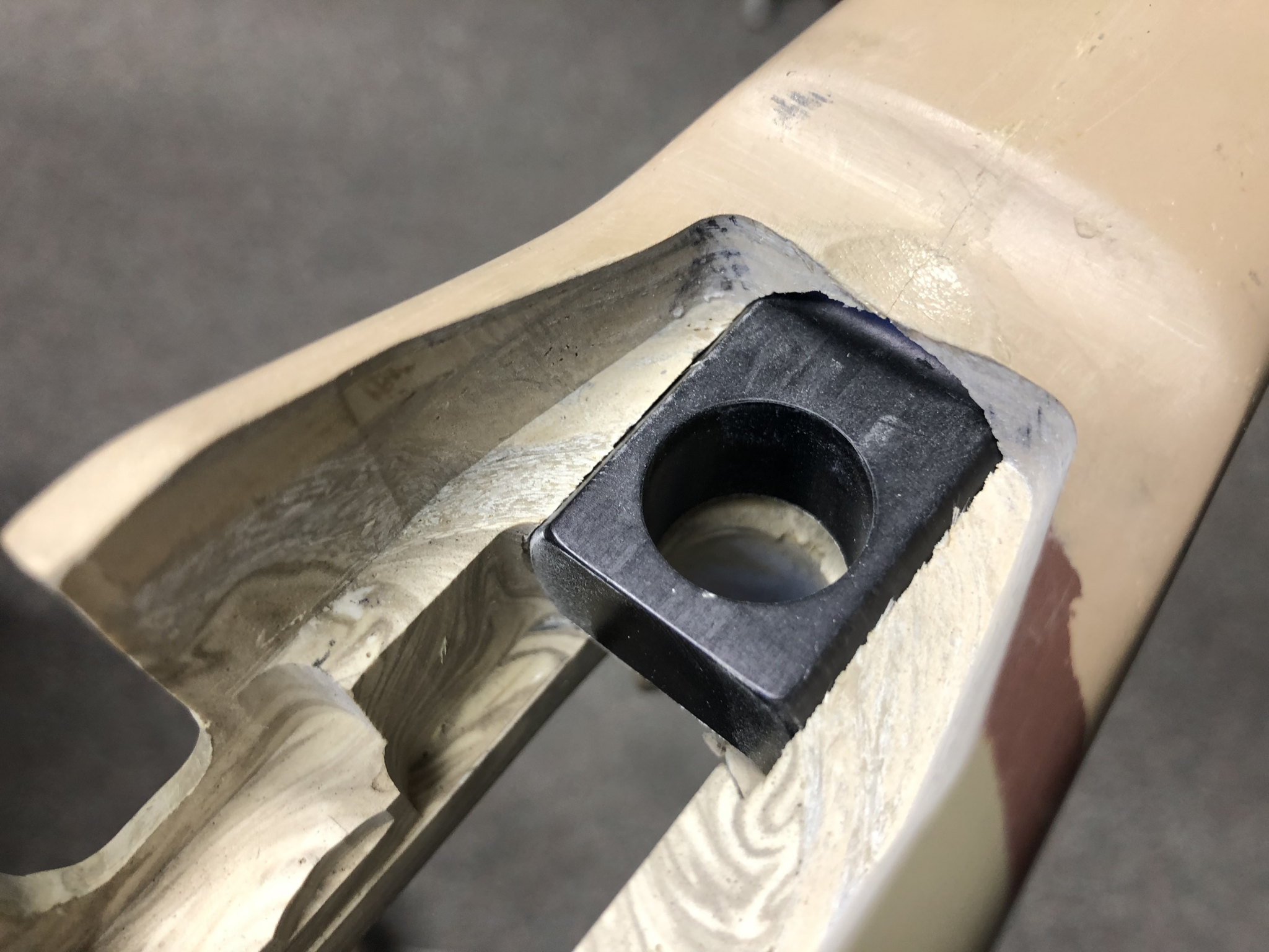 I put a small layer of epoxy in the bottom, let the dog bone "float" a little and squeeze excess out around the edges. Then I threaded the pic rails in from the sides, got them centered in place, and torqued them snuggly where they were suppose to be. Then started to fill-er up.