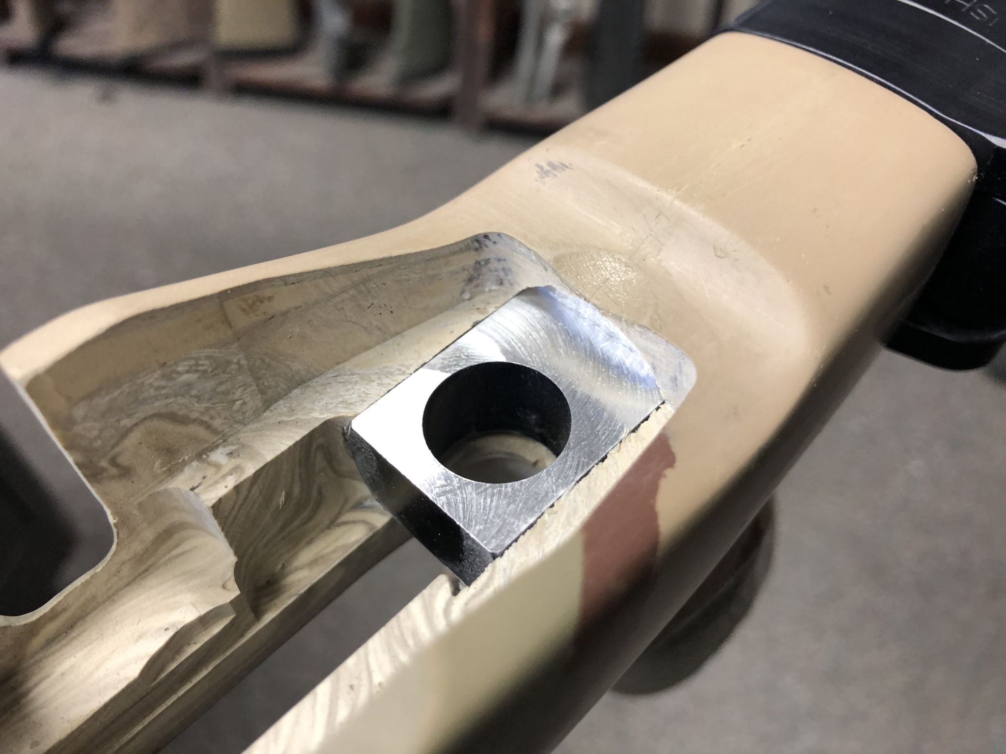 When I installed a barreled action, my action was slightly nose diving in the stock. Maybe this is correct and I screwed myself as maybe bedding kept the front of the bedding system elevated, but I did what I did, so I'll adjust to that. I machined off about .045 to .050" surface, bolted up action, and it was true to bore line.
