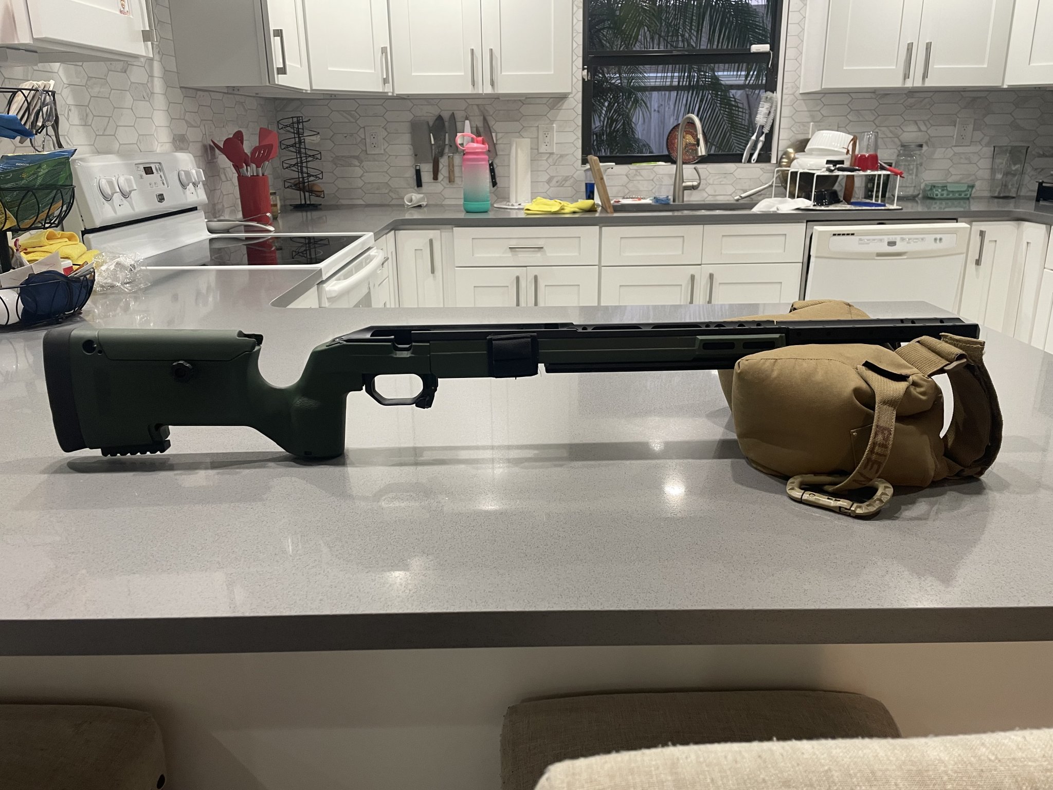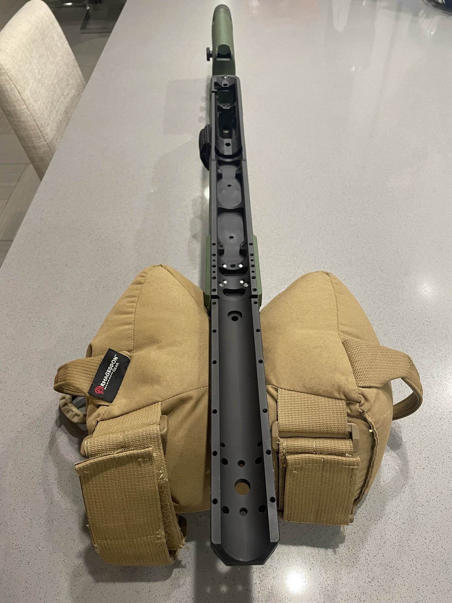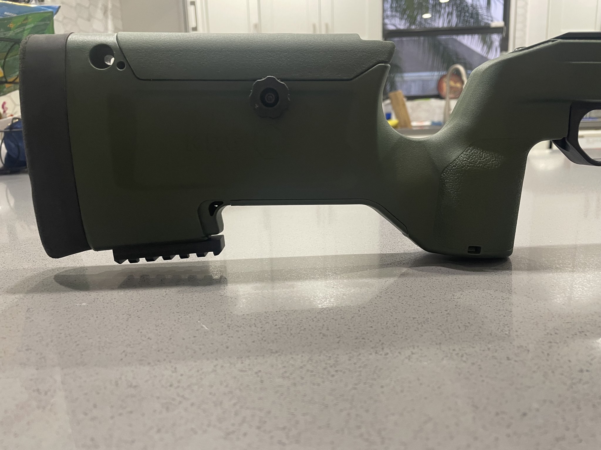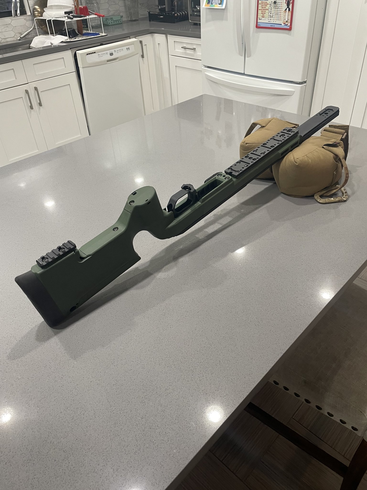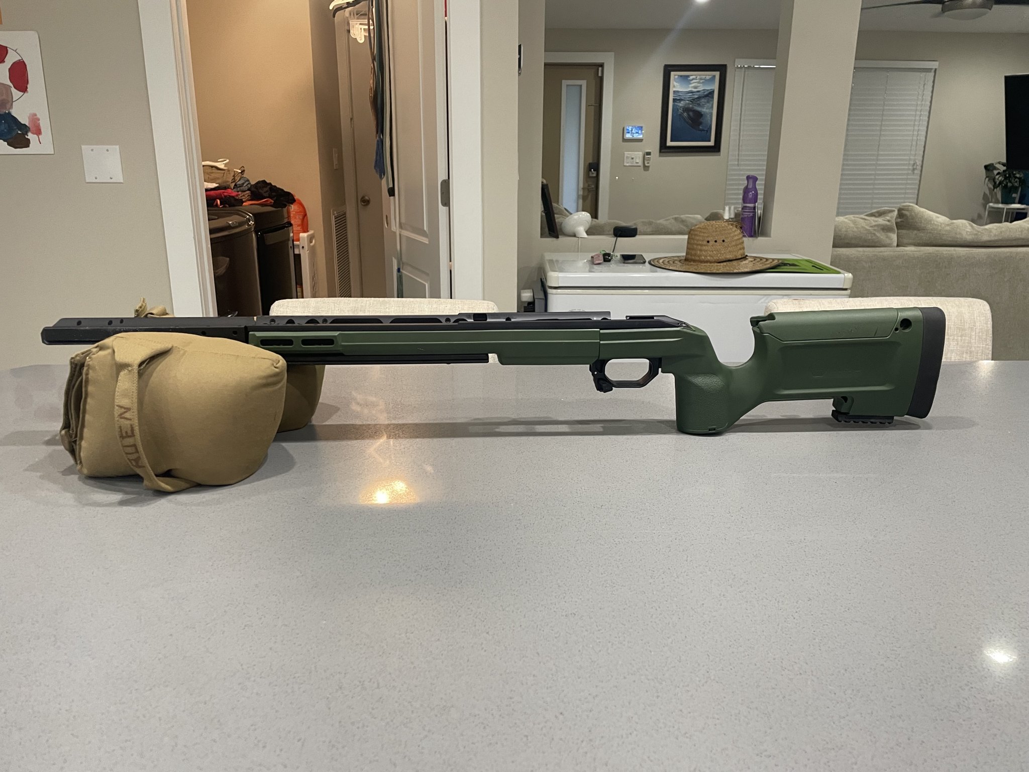 KRG Bravo Chassis short action in sako green. Coming off my 6.5 CM. Used for about 1000 shots. Comes with all the internal weights you can add including spigot mount xl, arca rail heavy (KRG), bravo grip weight, forend t-slot weight.
