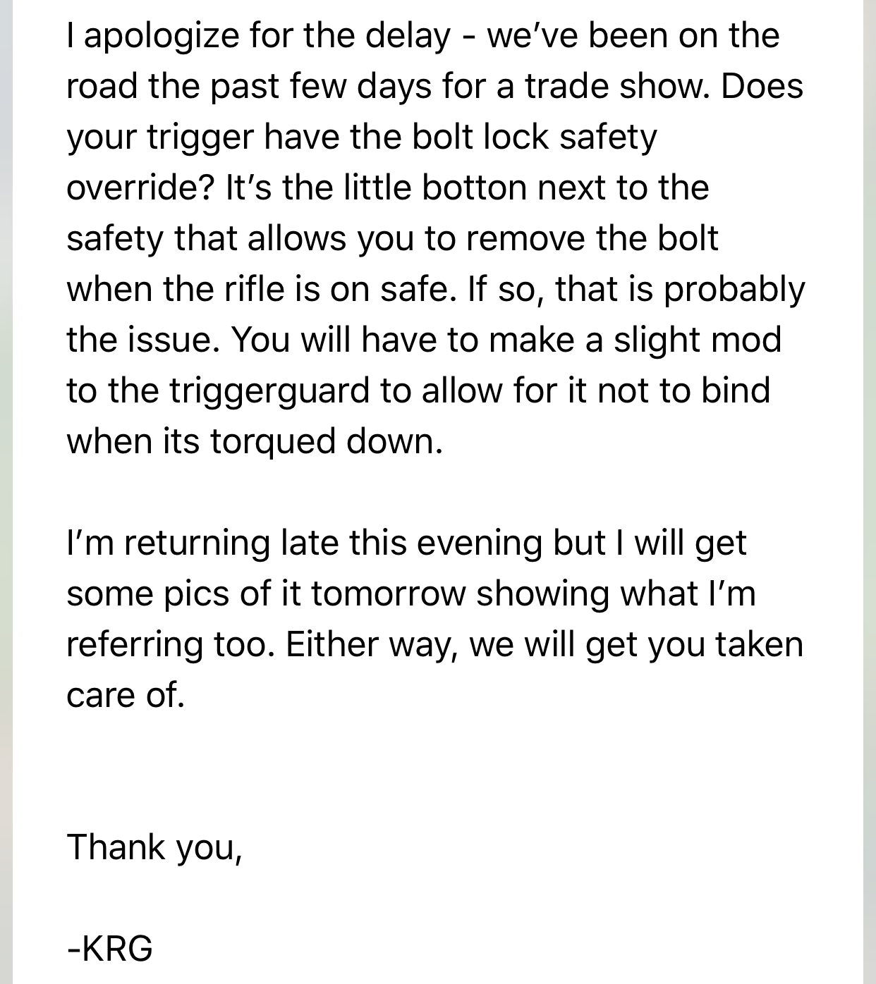 Here’s the email from KRG, confirming the Bravo is not compatible with the Tac A1 and requires modifications. They need to update their site and installation instructions to give a heads up to future customers. They instructed me to just return it to Brownells.
