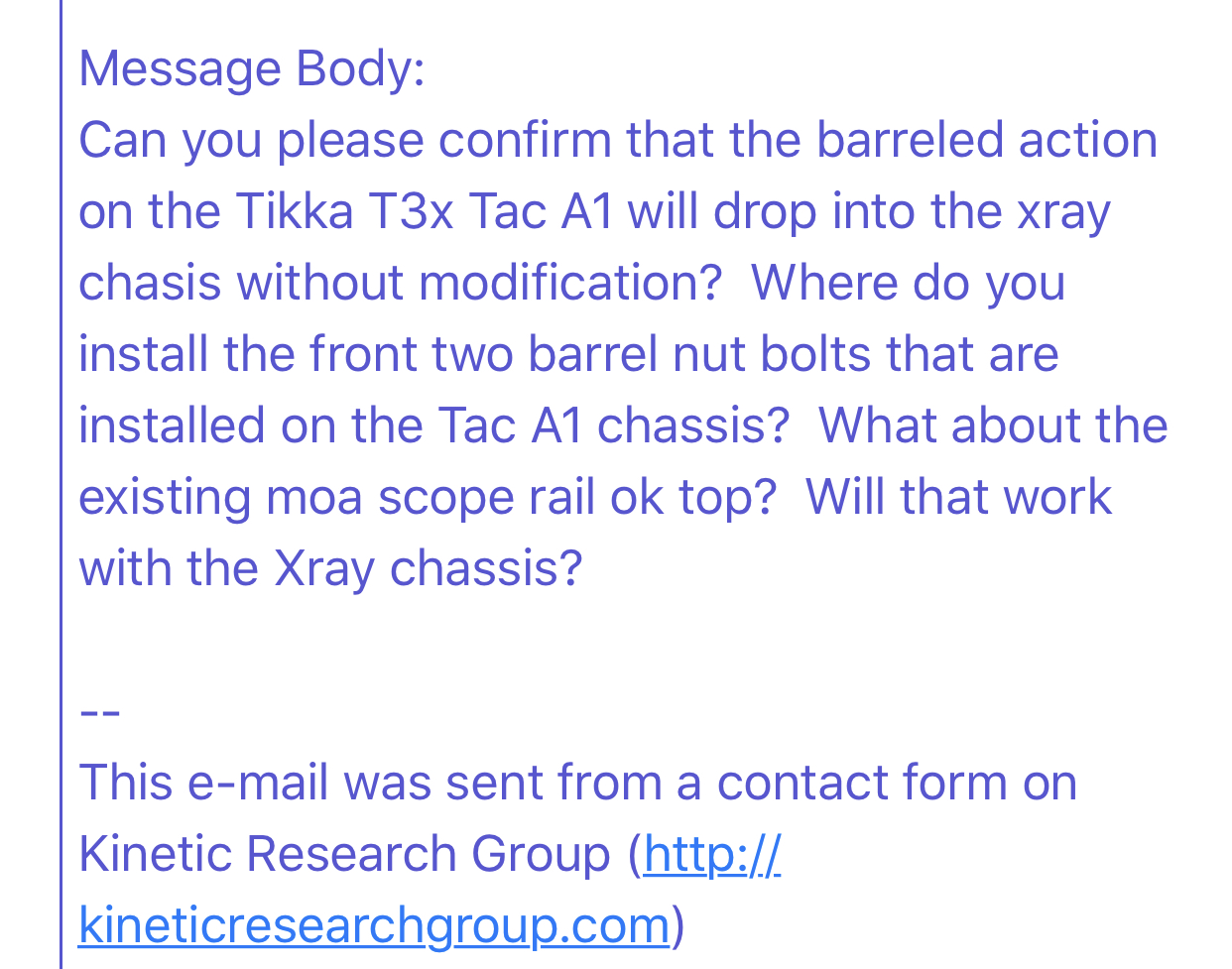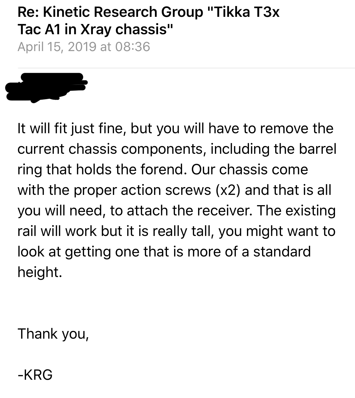 Interesting that you said that you don’t claim any of your systems fit the Tac A1 because I have email documentation stating otherwise (see below). The reason some would want to swap into a lighter chassis like the Bravo is because they might not want a folding stock, can sell the Tac A1 chassis for $500-700$ on the PX, and end up saving a couple hundred in the process with a better trigger. There was a used Tac A1 for sale on the Snide for $1350 that would be a perfect example of doing this. If it’s not worth it for your company to make accommodations via added instructions and tec help online, then it’s not worth it to me to purchase your products and dremel them in hopes it functions.